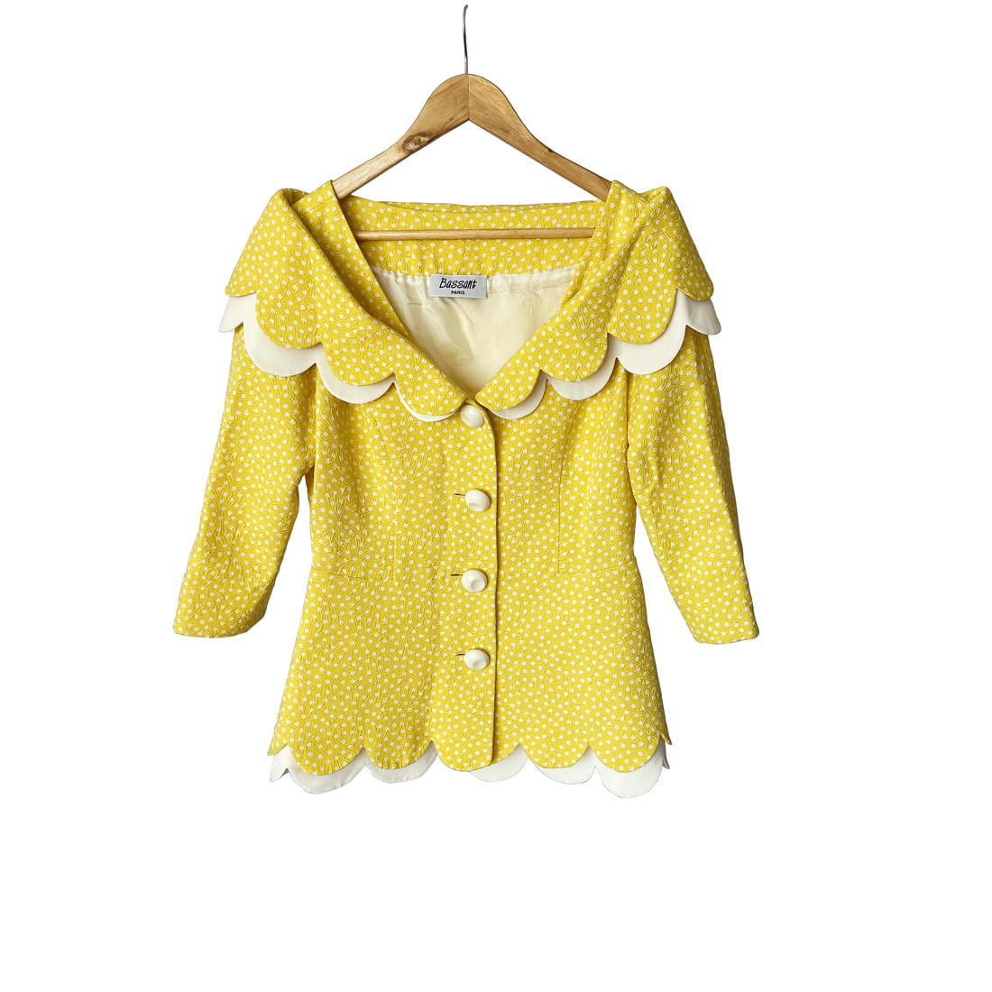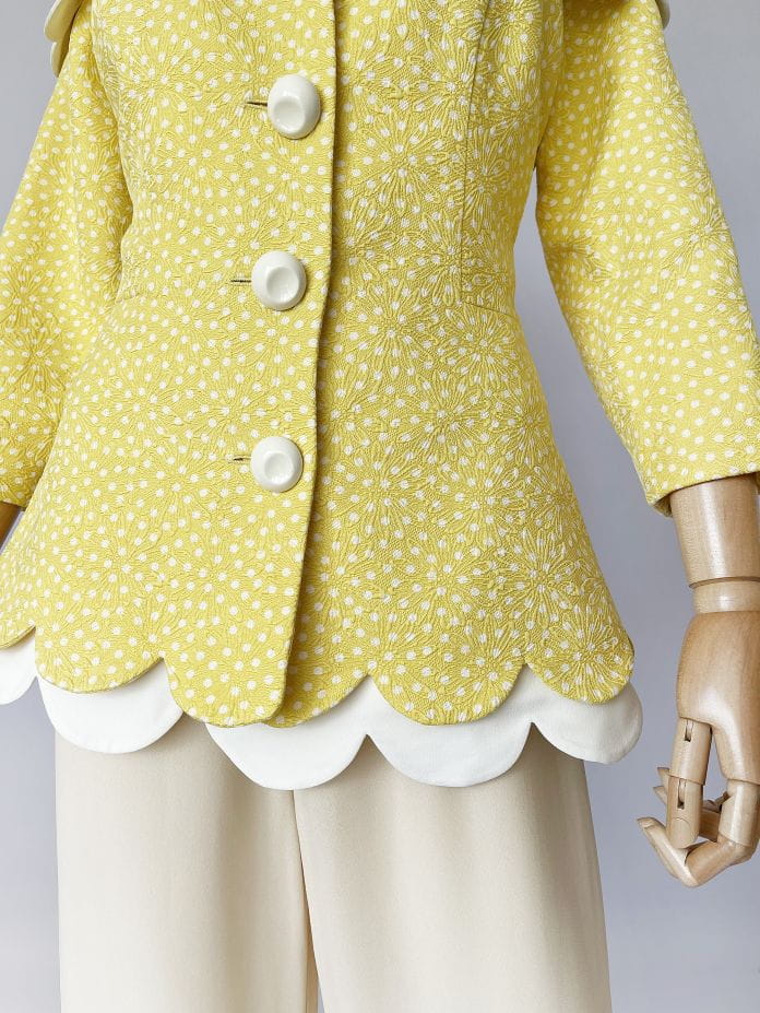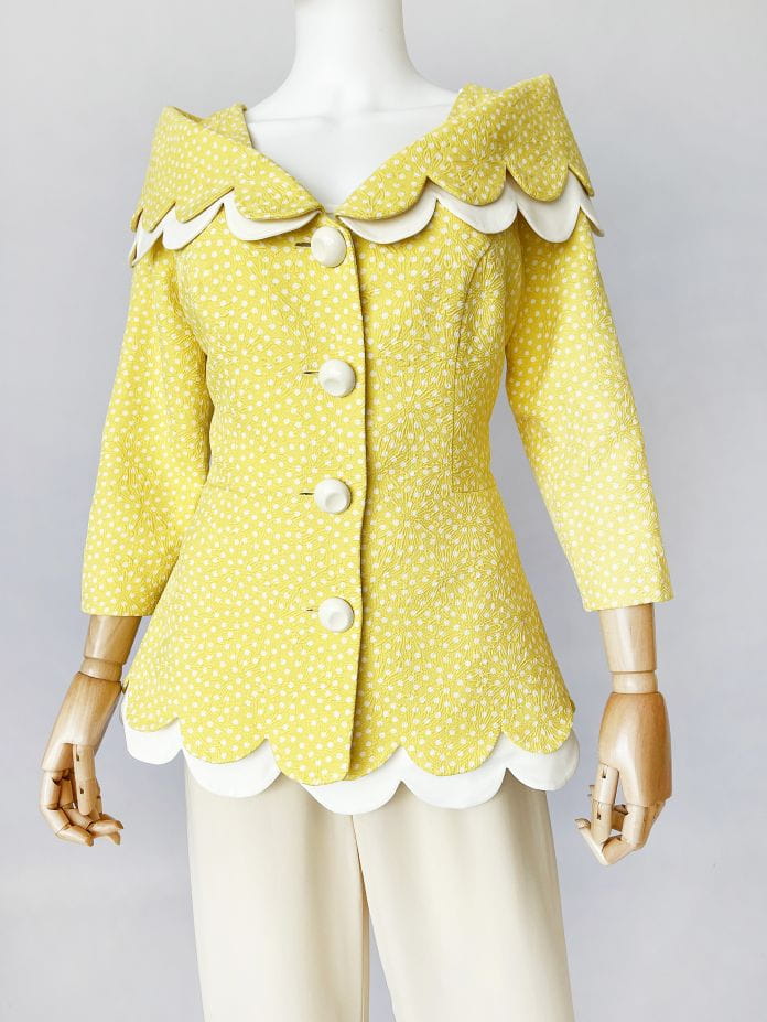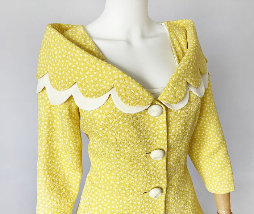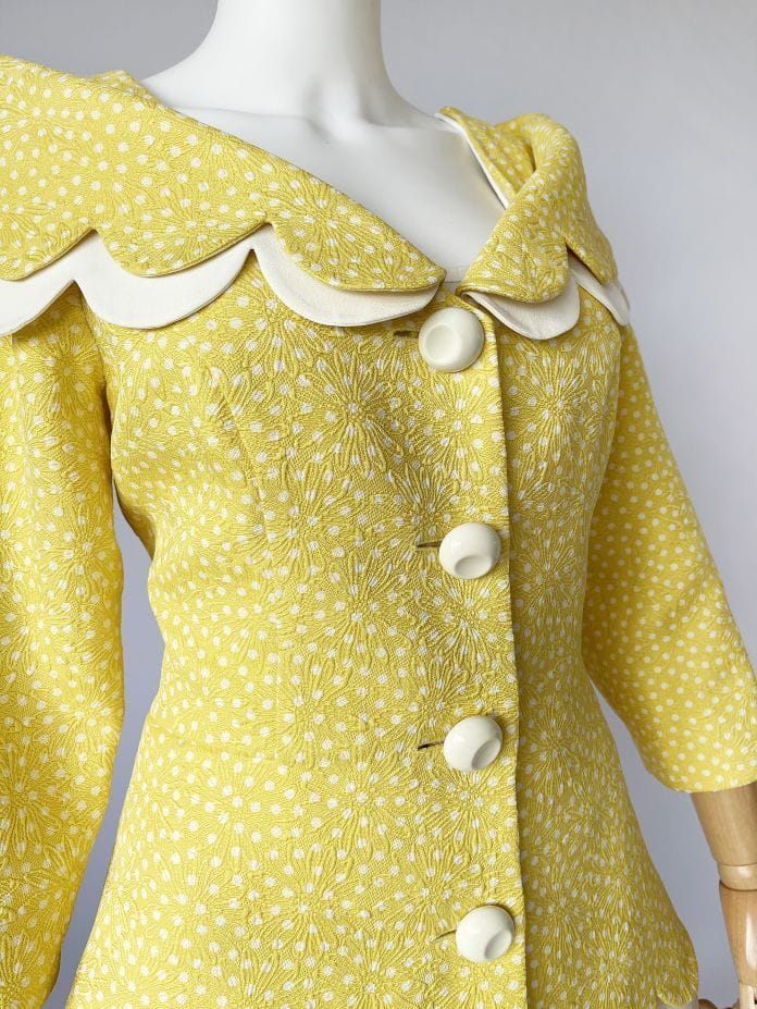 Cudowna, lekka francuska kurtka vintage z lat 80-tych/90-tych, projektu marki Bassant. Wykonana w całości z jedwabiu, tkanina jest mięsista, porządna, o fakturze w wytłaczane dyskretne kwiatowe kontury. Słoneczny żółty odcień w śmietankowe wzory. Taliowany dłuższy fason z rozłożystym dekoltem i sporym kołnierzem, który elegancko spoczywa na ramionach. Spod kołnierza, oraz dołu kurtki, dyskretnie prezentuje się dodatkowa kremowa warstwa o falowanym wykończeniu. Rękawy o długości 2/3. Kurtka jest zapinana na duże kremowe guziki. Wyjątkowy model, który przenosi nas w czasie do lat 60-tych i przywodzi na myśl kreacje Jackie Kennedy.