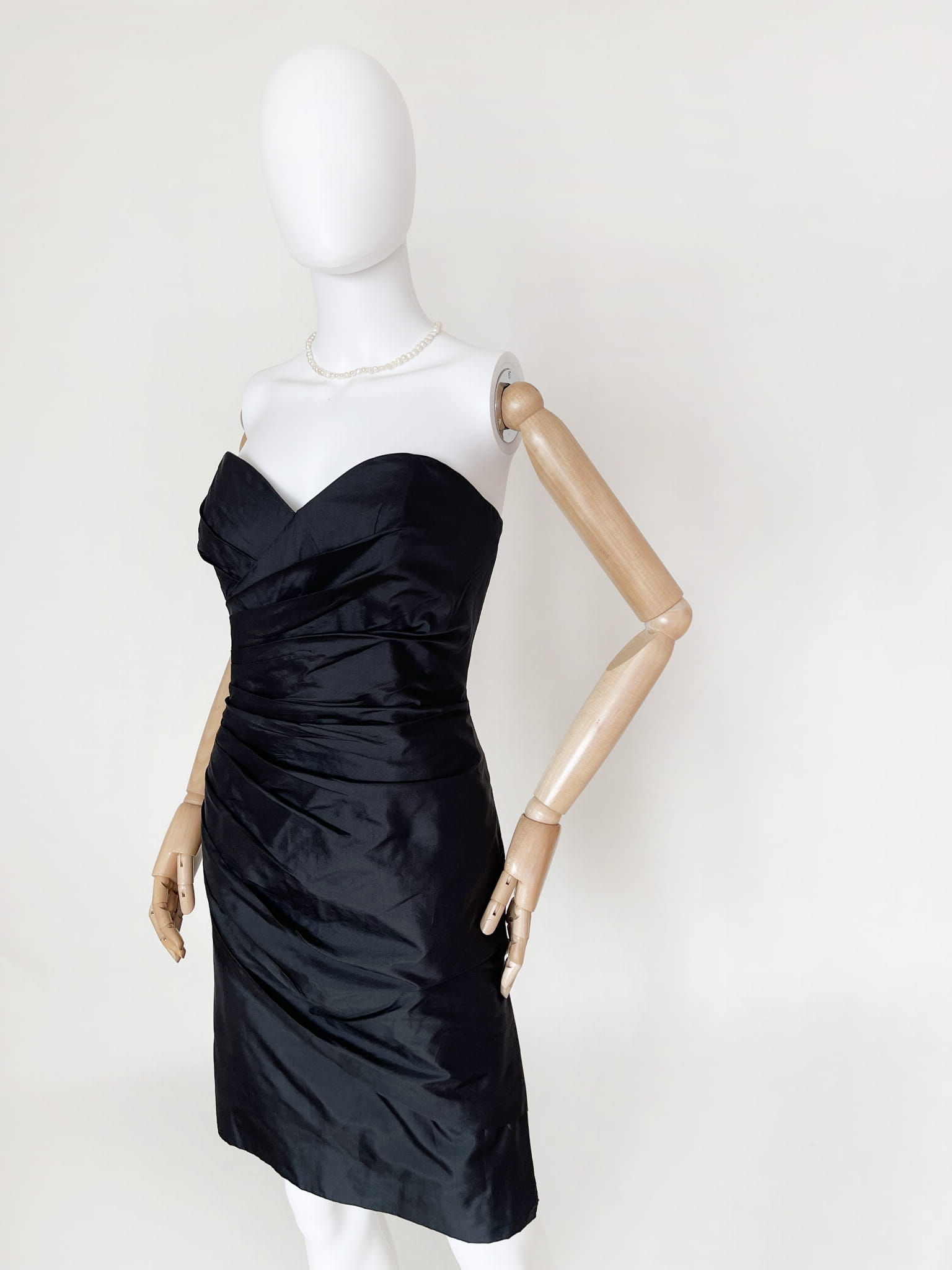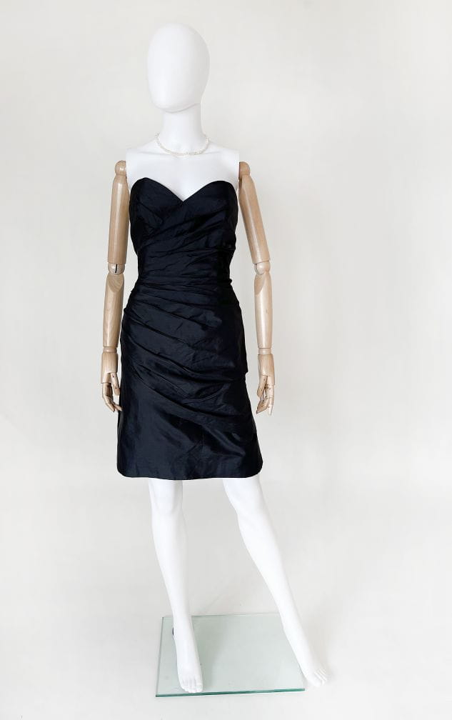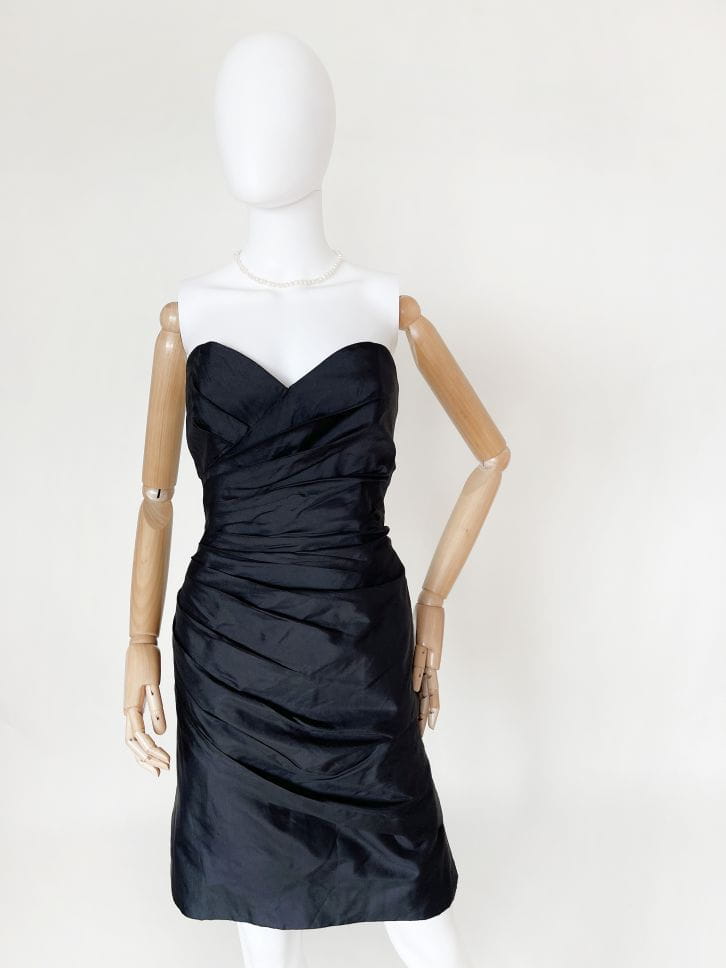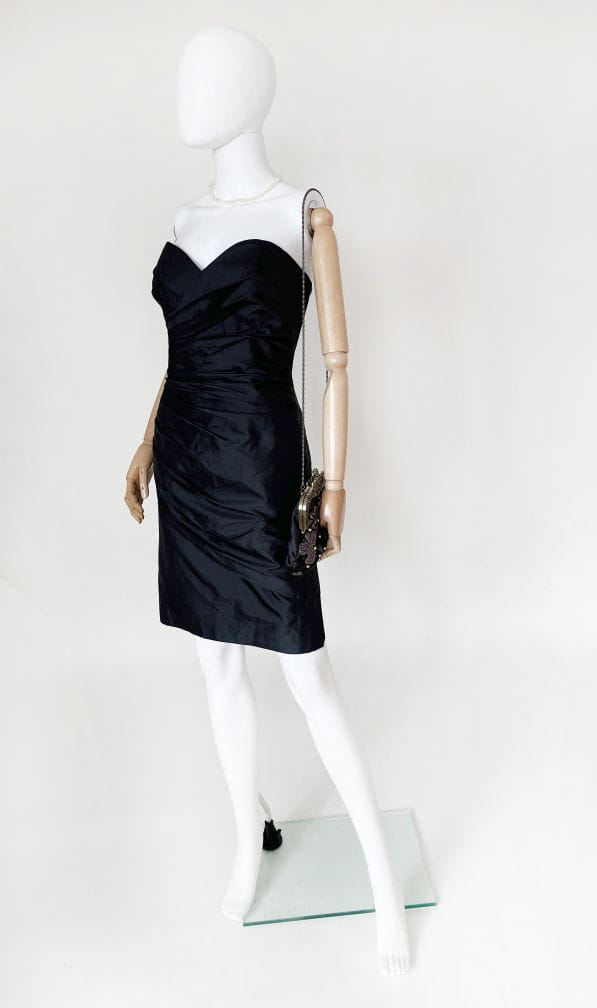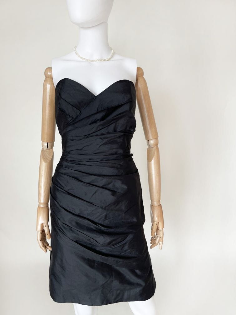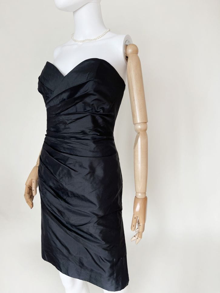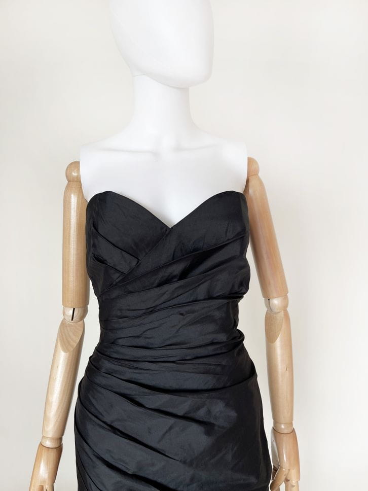 Zmysłowa mała czarna vintage wykonana z naturalnego jedwabiu. Gorsetowa góra z dekoltem serce, usztywniana fiszbinami po bokach. Tkanina drapowana na całości, dzięki czemu dyskretnie tuszuje ewentualne niedoskonałości . U dołu po bokach wysokie rozporki.