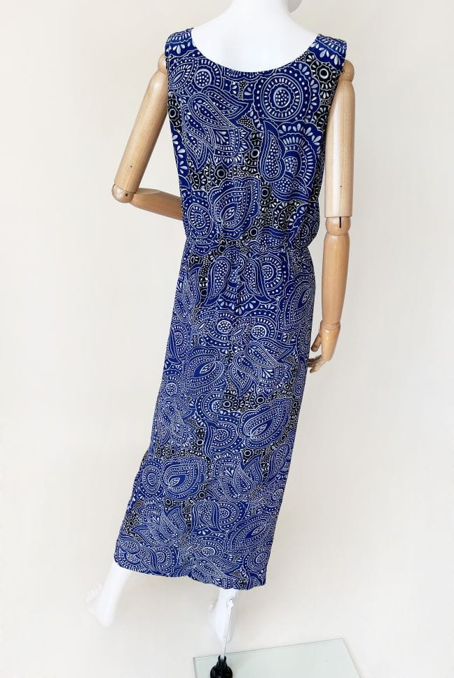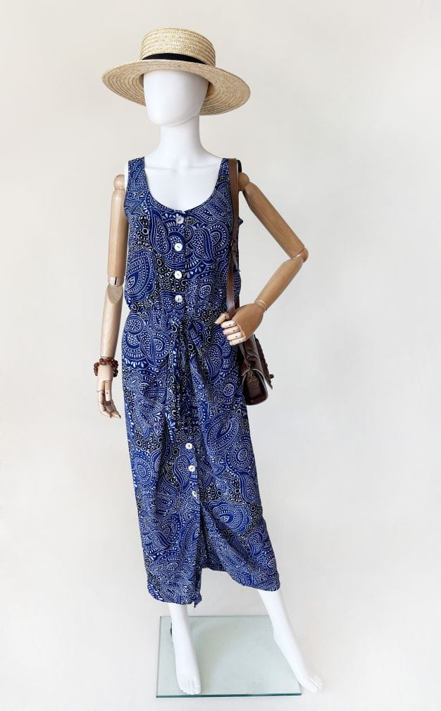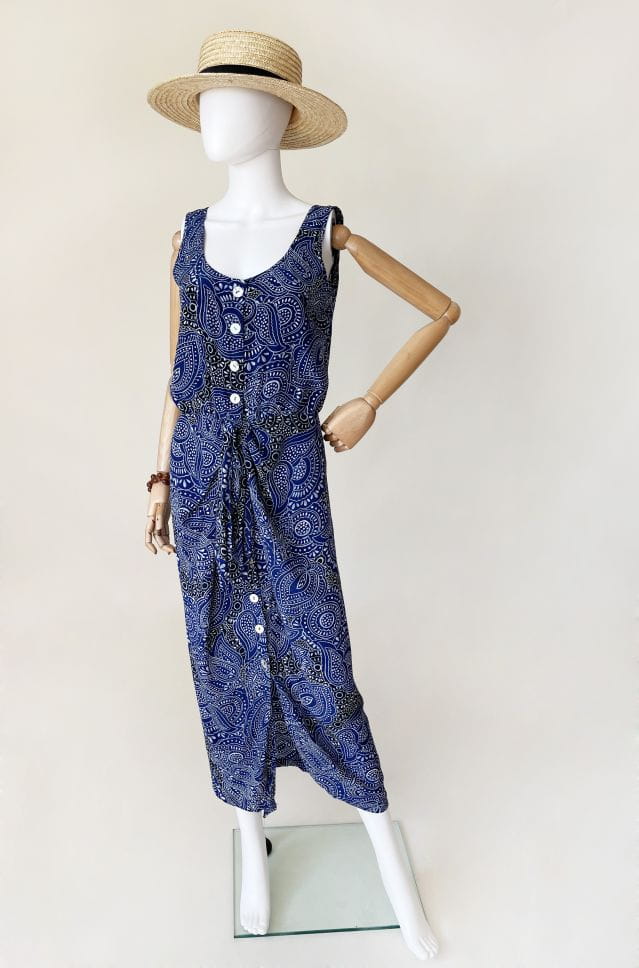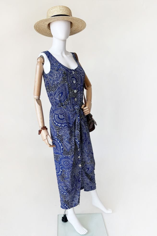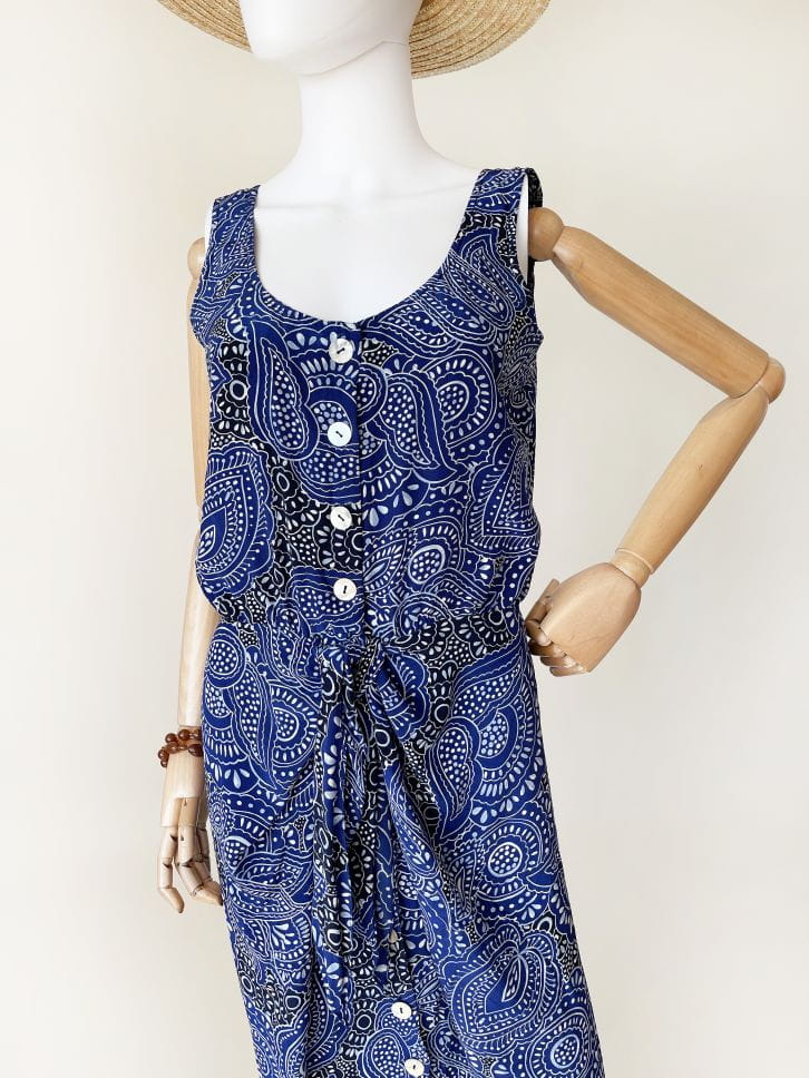 Sukienka vintage marki Maggy London wykonana w całości z jedwabnej zwiewnej tkaniny w etniczne wzory. Rozpinany fason z dopasowaną górą bez rękawów i luźniejszym dołem. Na wysokości pasa dekoracyjne wiązanie. Zapinana na guziki z masy perłowej.
