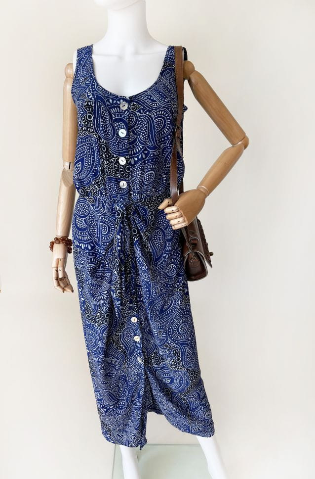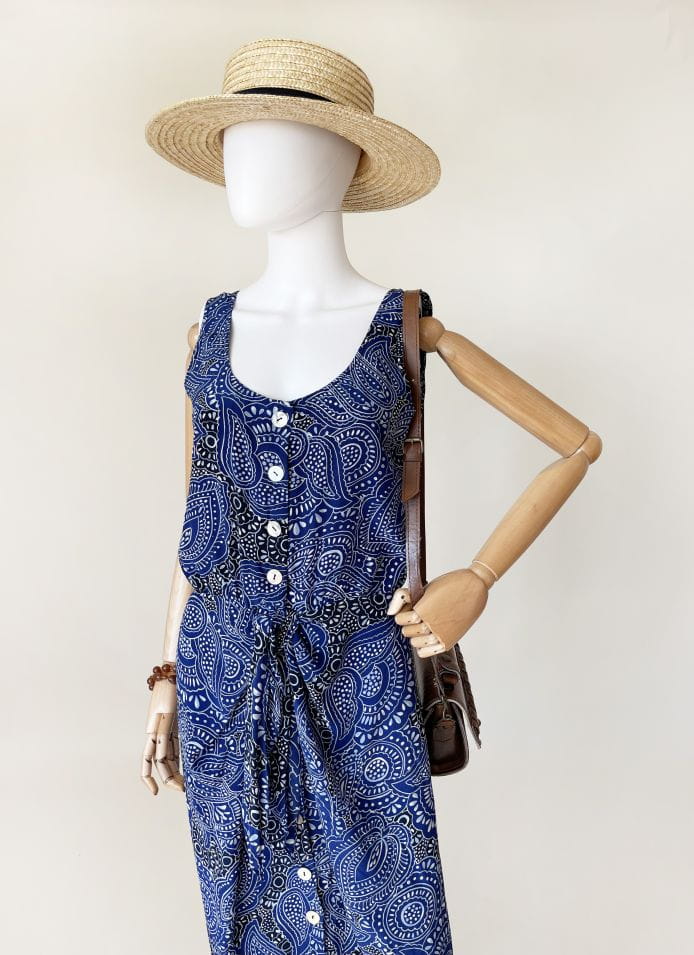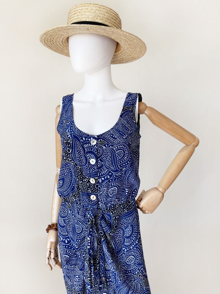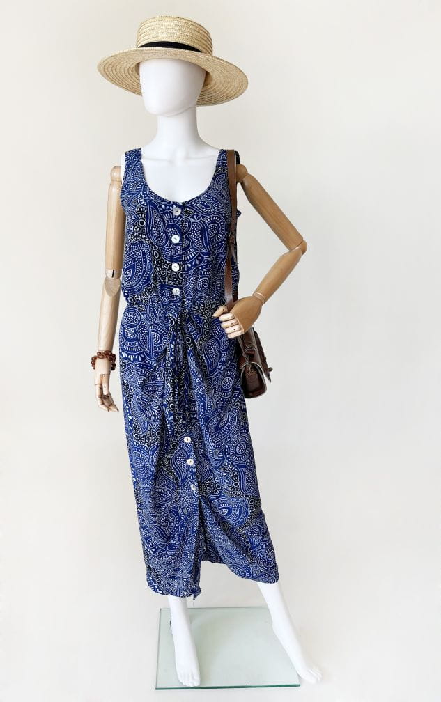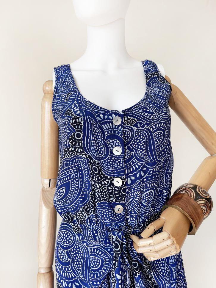 Sukienka vintage marki Maggy London wykonana w całości z jedwabnej zwiewnej tkaniny w etniczne wzory. Rozpinany fason z dopasowaną górą bez rękawów i luźniejszym dołem. Na wysokości pasa dekoracyjne wiązanie. Zapinana na guziki z masy perłowej.
