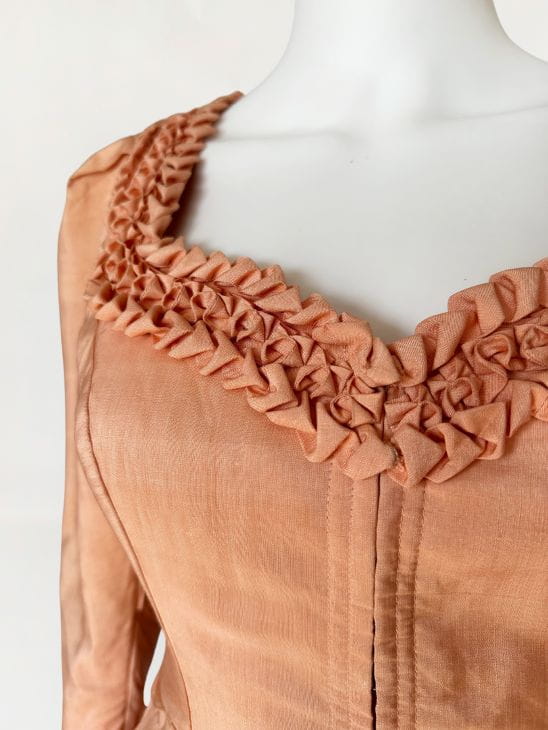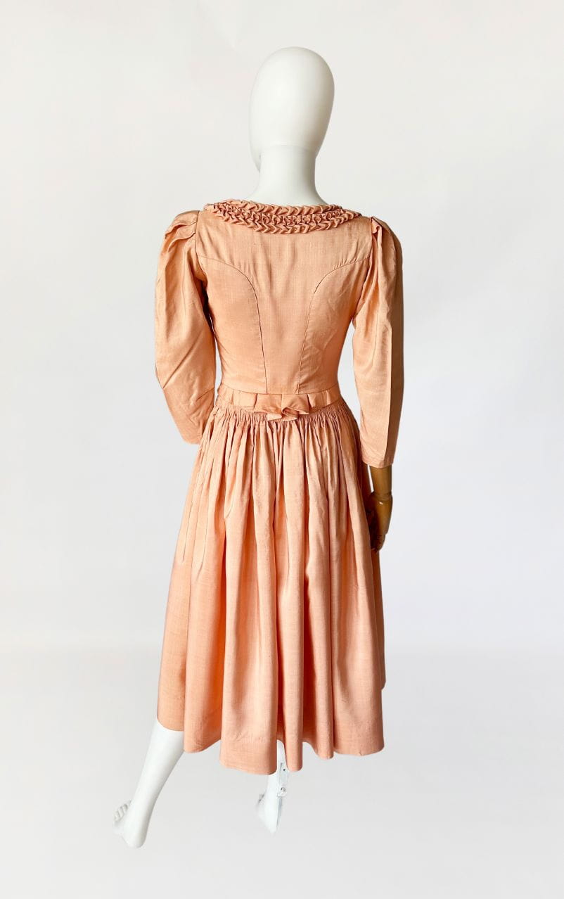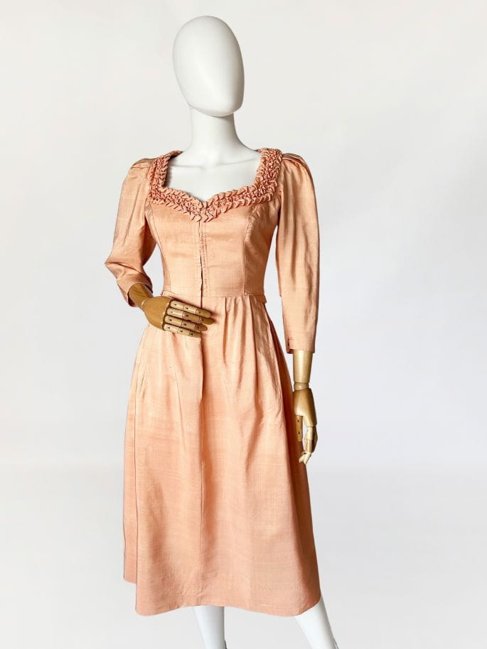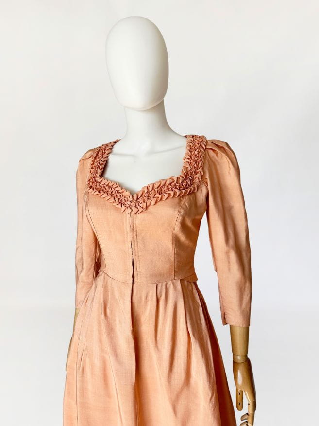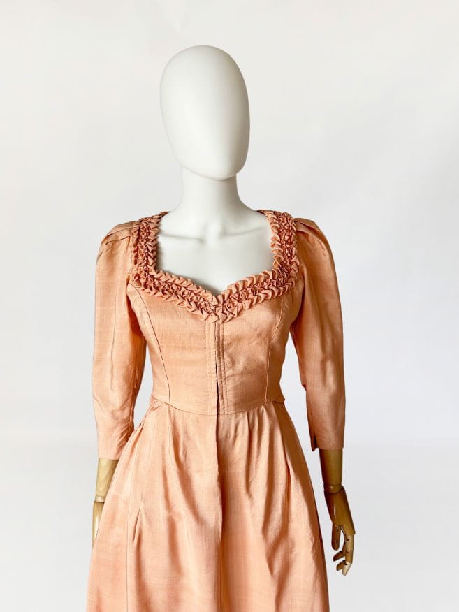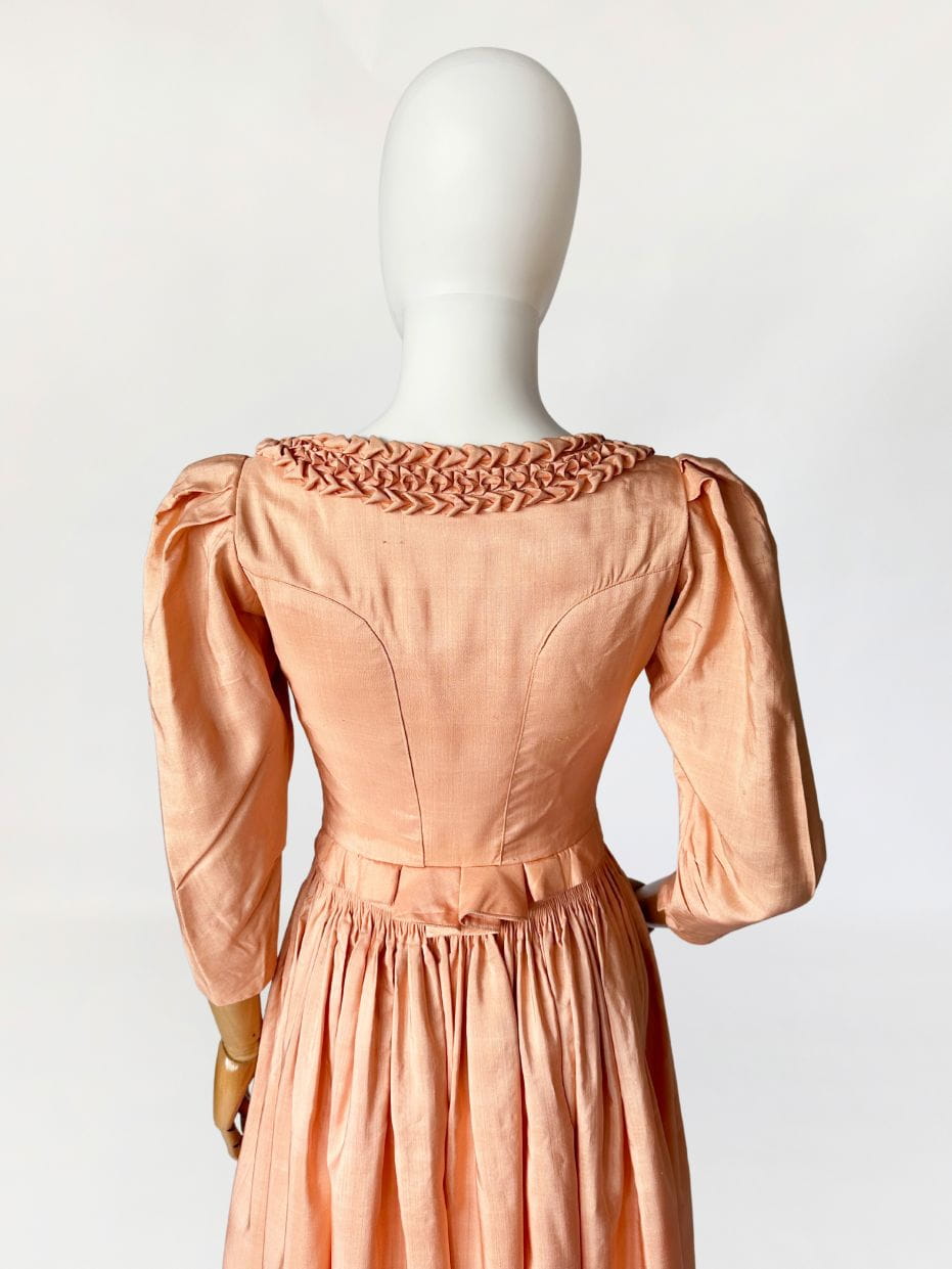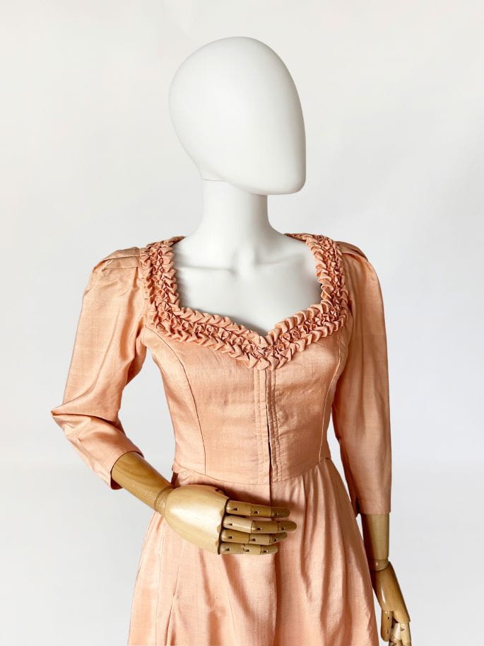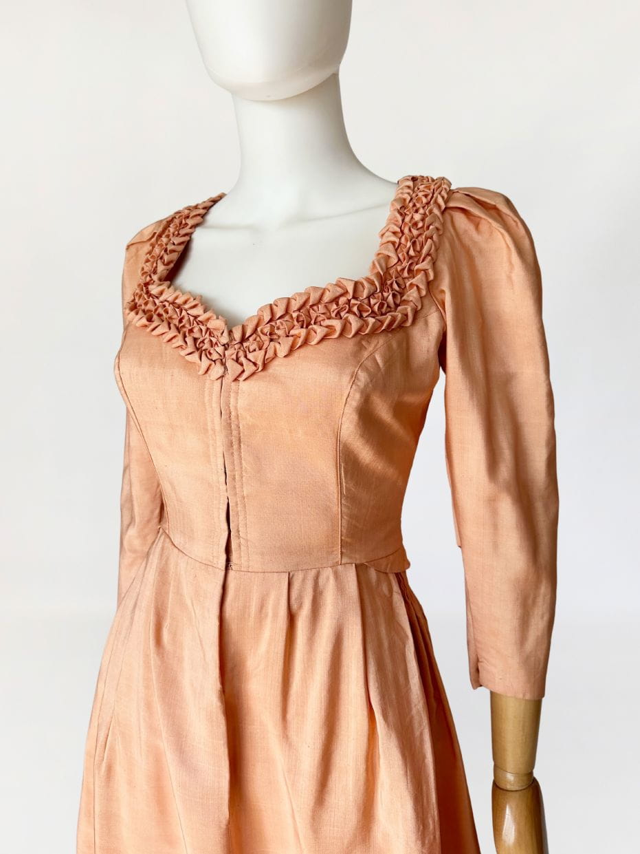 Przepiękna sukienka vintage uszyta kilka dekad temu na wzór sukienek dirndl. Ze względu na szycie przez krawcową, warto wspomnieć że wyjątkowo utalentowaną, - niełatwo o precyzyjne określenie z jakich lat konkretnie pochodzi. Prawdopodobnie są to okolice lat 80-tych, ale nie wykluczamy że jest starsza. Kunszt widać w każdym szwie i detalu. Powstała z doskonałej jakości, maślanej jedwabnej tkaniny w kolorze brzoskwiniowym. Gorsetowa góra ma zapięcie na haftki, a okrągły dekolt wykończono misternymi, ręcznymi zdobieniami z tkaniny. Rękawy o długość 3/4 mają lekko bufiastą formę i zwężają się ku końcom. Spódnica o rozkloszowanym fasonie, z kontrafałami w pasie, gęsto drapowana z tyłu z dekoracyjnym wykończeniem w typie niewielkiej baskinki. Podszewka w górnej części - wykonana z bawełnianego płótna.