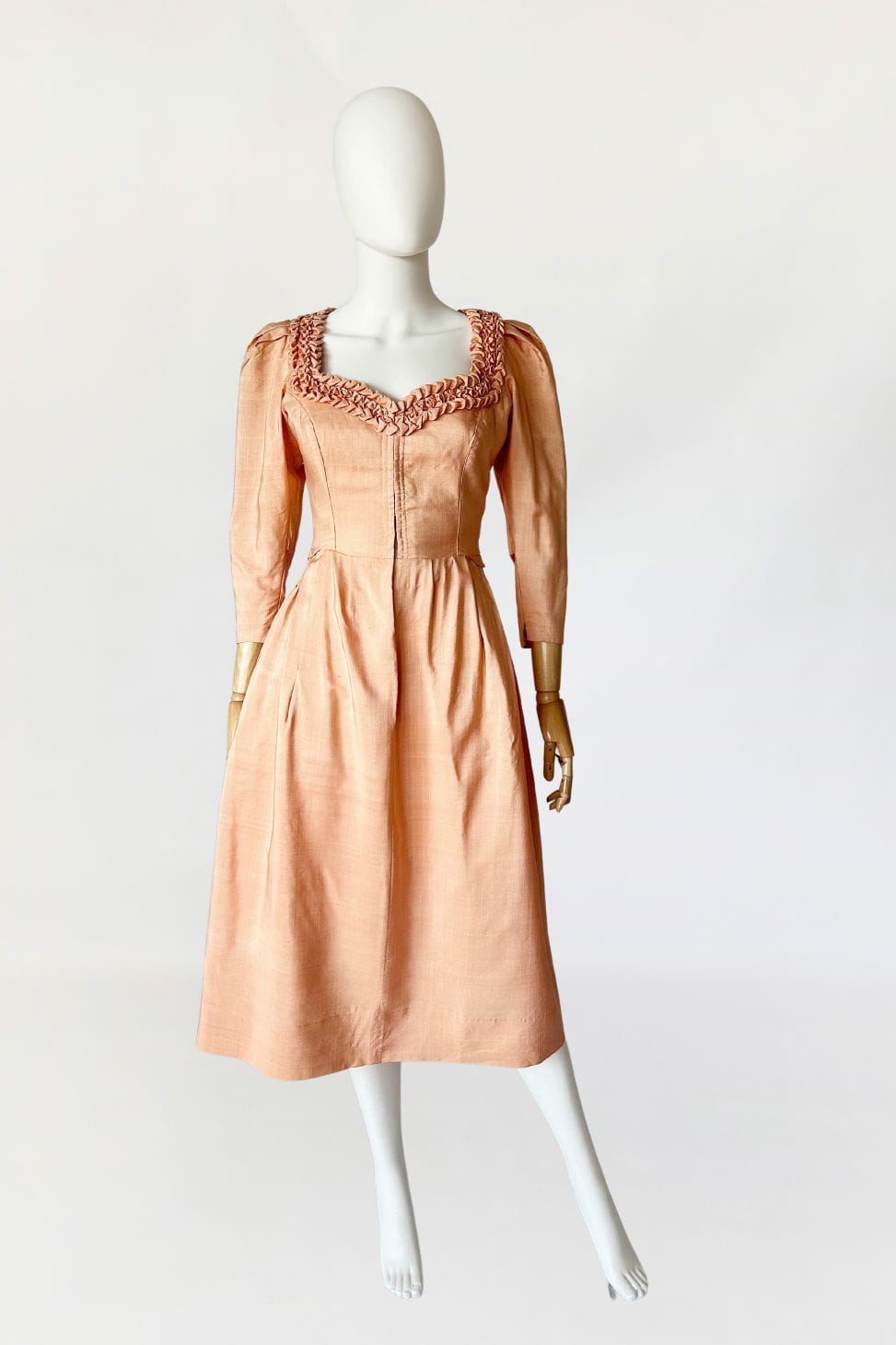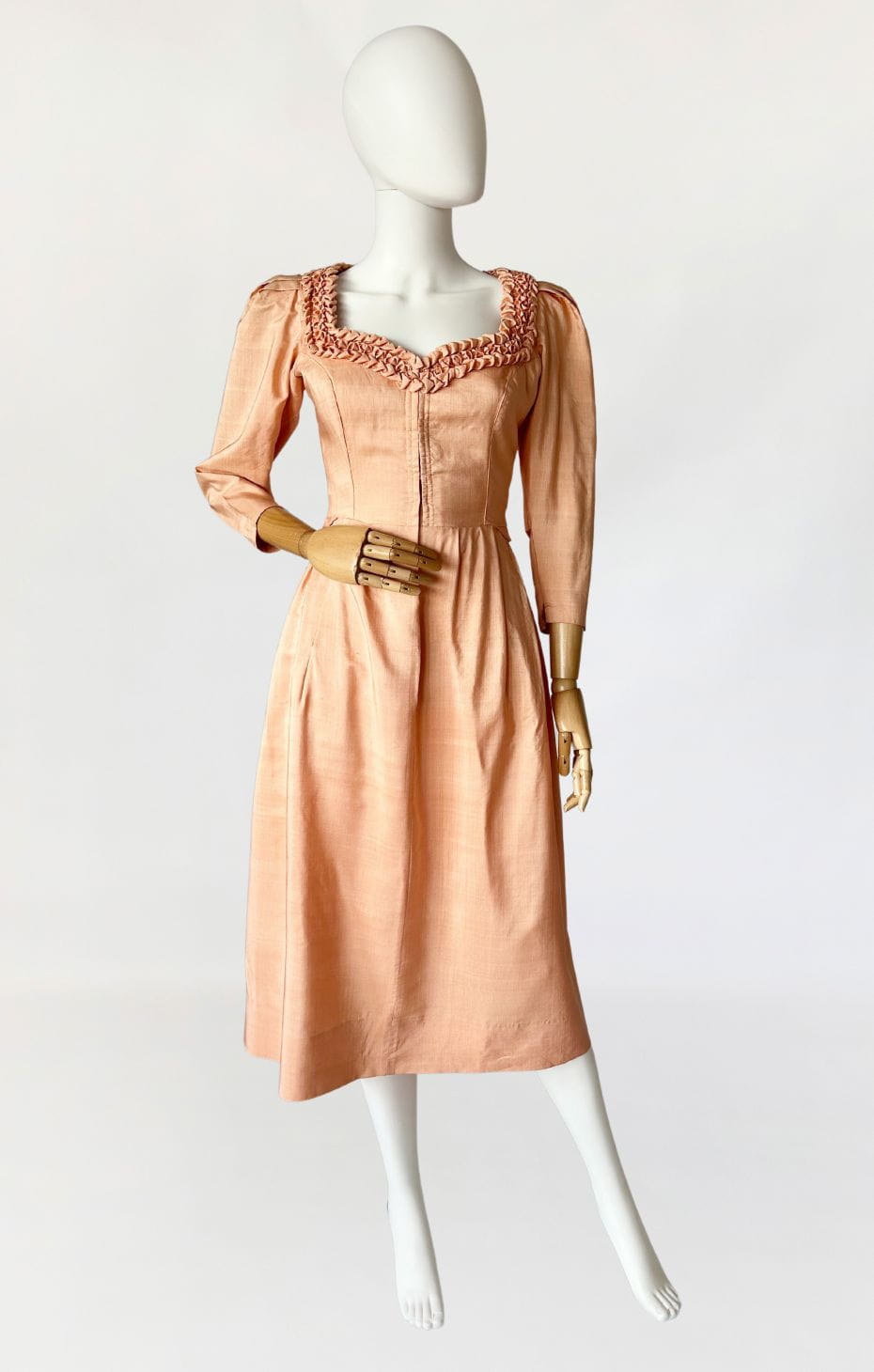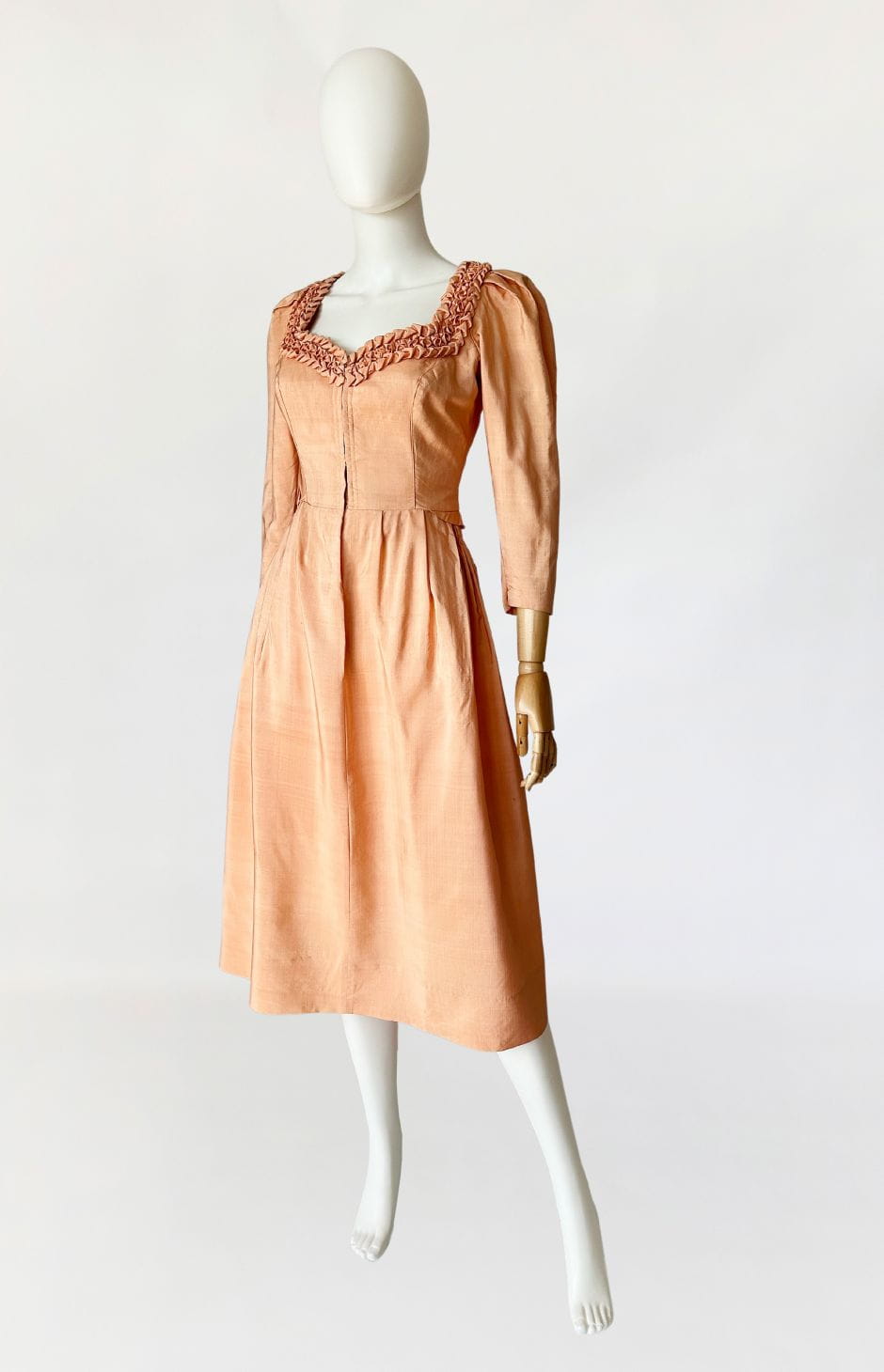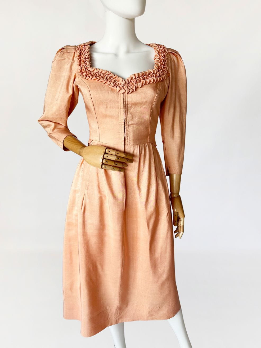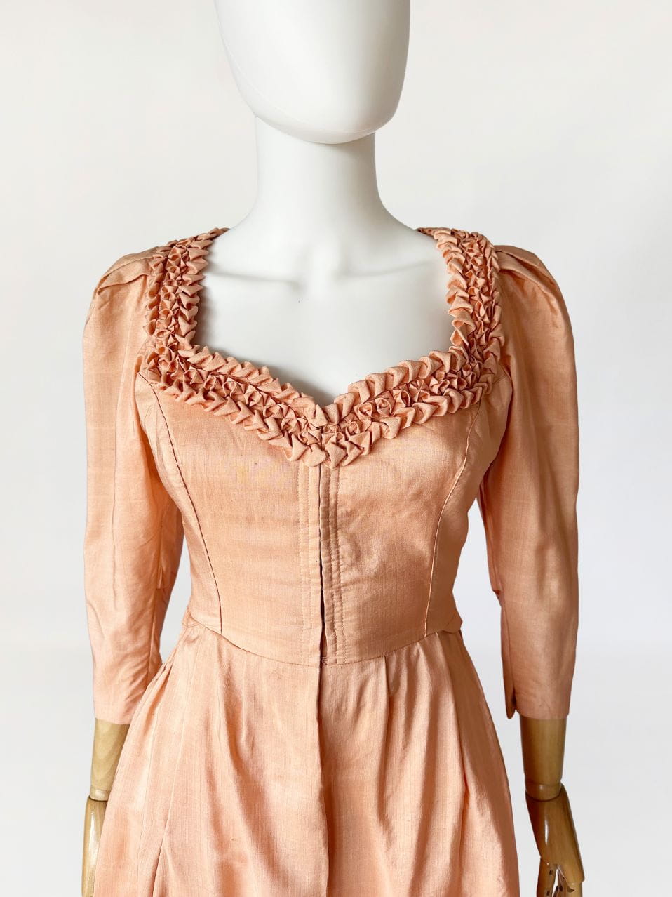 Przepiękna sukienka vintage uszyta kilka dekad temu na wzór sukienek dirndl. Ze względu na szycie przez krawcową, warto wspomnieć że wyjątkowo utalentowaną, - niełatwo o precyzyjne określenie z jakich lat konkretnie pochodzi. Prawdopodobnie są to okolice lat 80-tych, ale nie wykluczamy że jest starsza. Kunszt widać w każdym szwie i detalu. Powstała z doskonałej jakości, maślanej jedwabnej tkaniny w kolorze brzoskwiniowym. Gorsetowa góra ma zapięcie na haftki, a okrągły dekolt wykończono misternymi, ręcznymi zdobieniami z tkaniny. Rękawy o długość 3/4 mają lekko bufiastą formę i zwężają się ku końcom. Spódnica o rozkloszowanym fasonie, z kontrafałami w pasie, gęsto drapowana z tyłu z dekoracyjnym wykończeniem w typie niewielkiej baskinki. Podszewka w górnej części - wykonana z bawełnianego płótna.