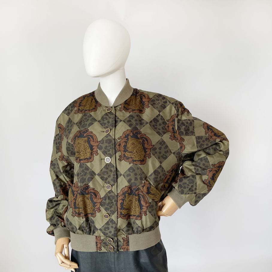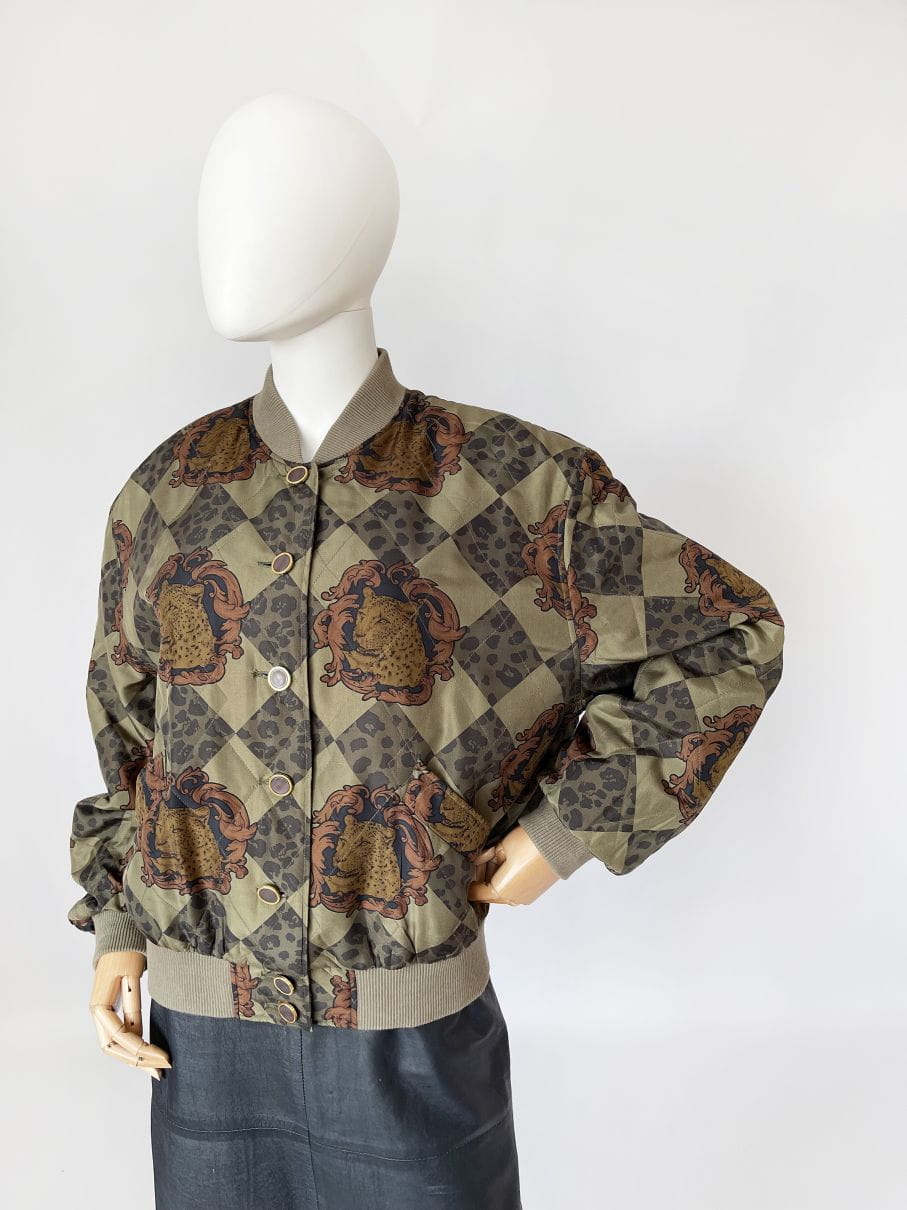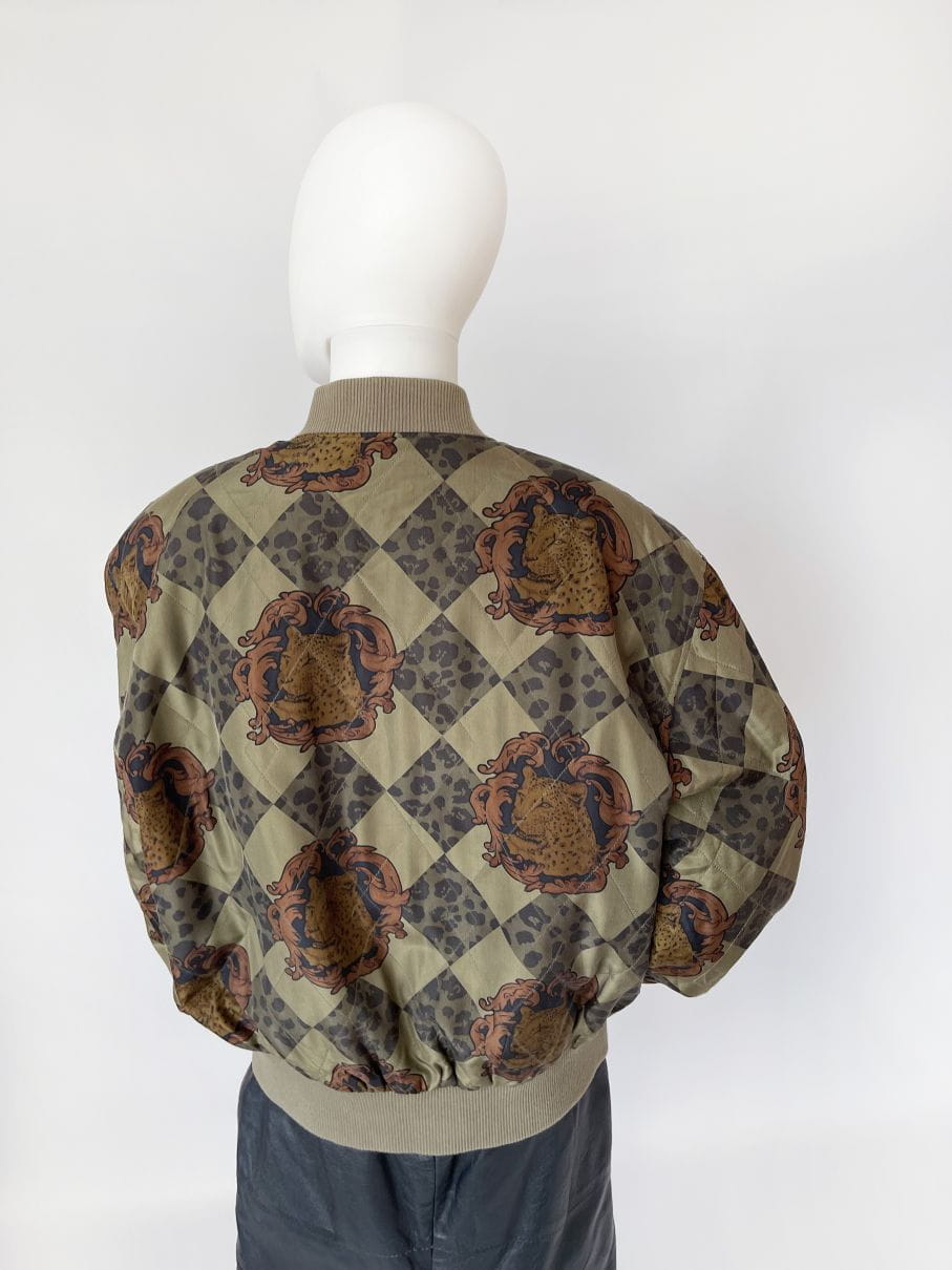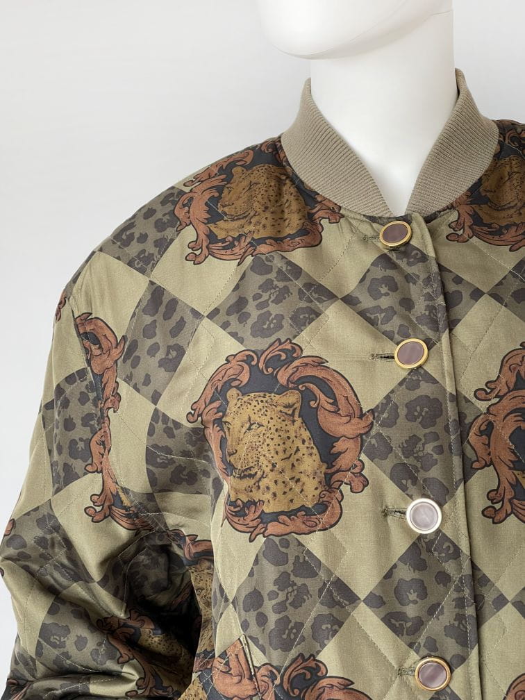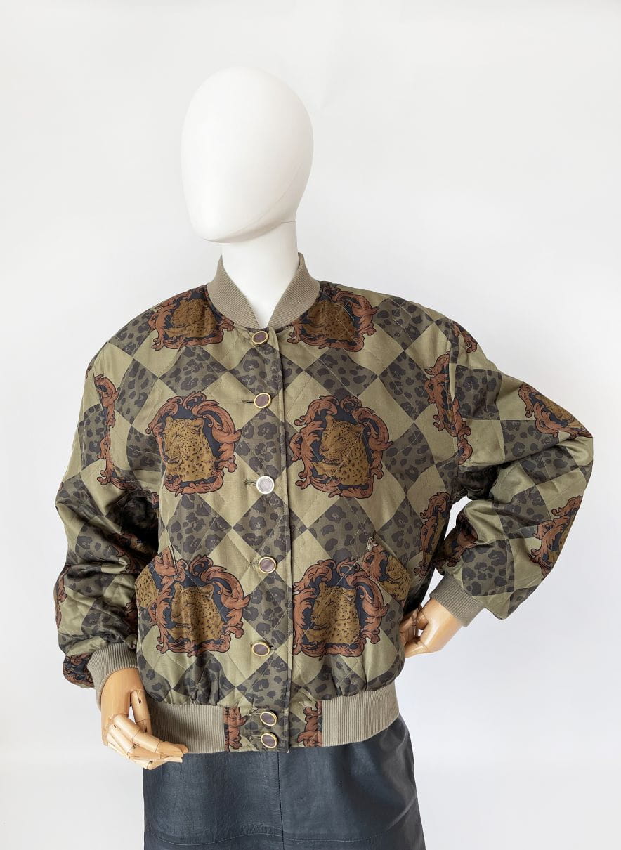 Lekka bomberka true vintage wykonana z jedwabnej tkaniny we wzory: romby, cętki i portrety tygrysów :) Na całości przeszycia tworzące efekt pikowania. Luźny fason z długimi rękawami, linia ramion lekko obniżona. Zapinana na dekoracyjne guziki. W dolnej części wsuwane kieszenie. Dół, mankiety i dekolt wykończone dzianinowym ściągaczem
