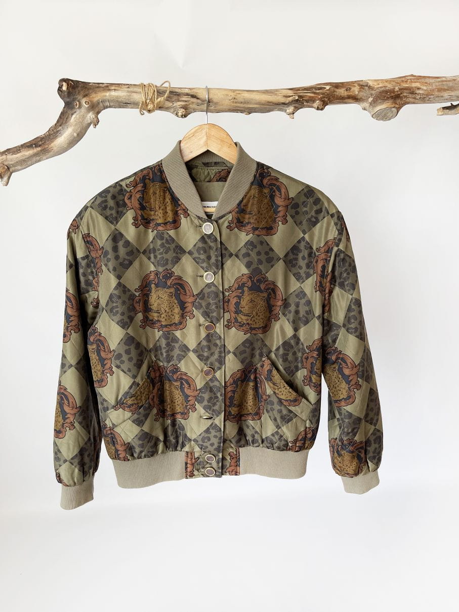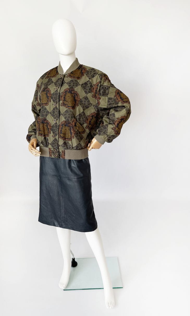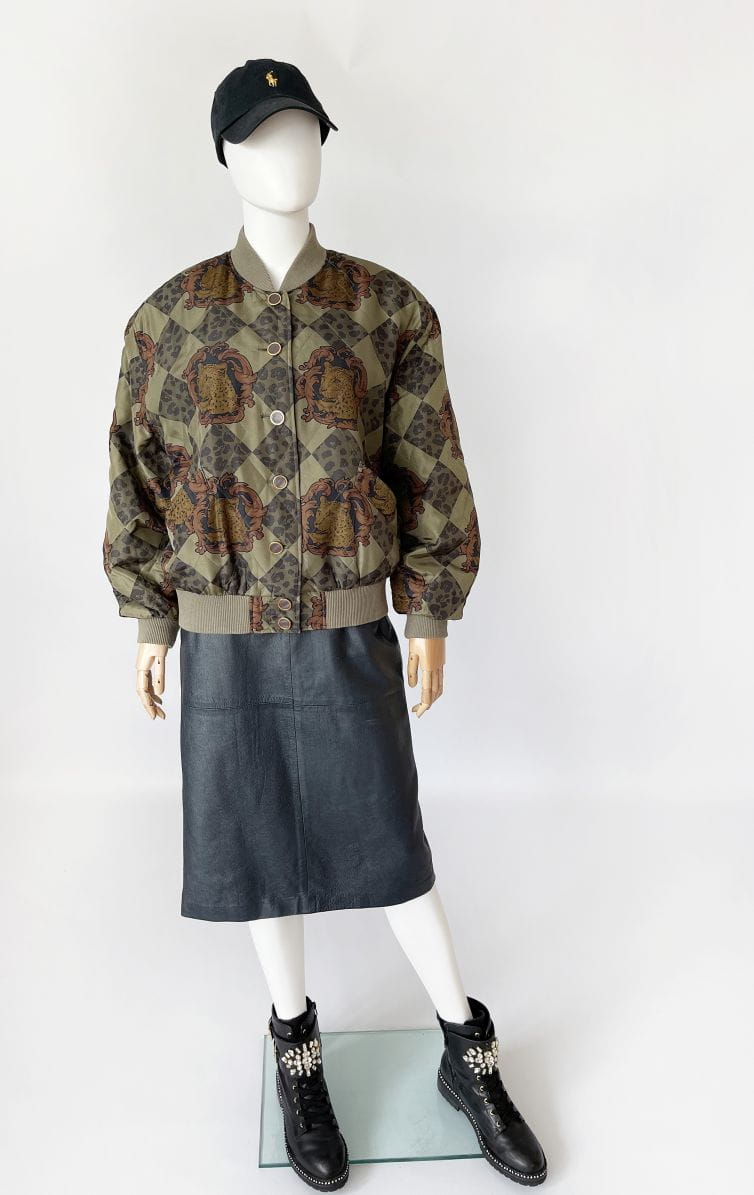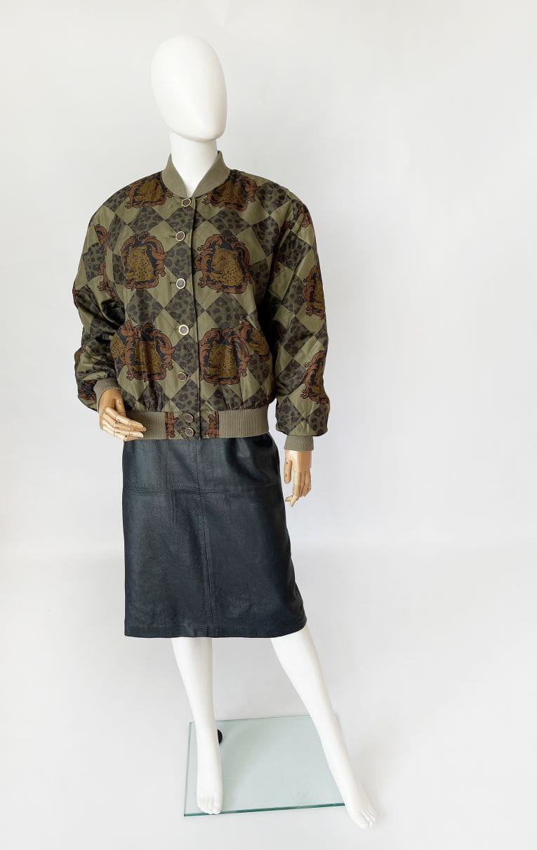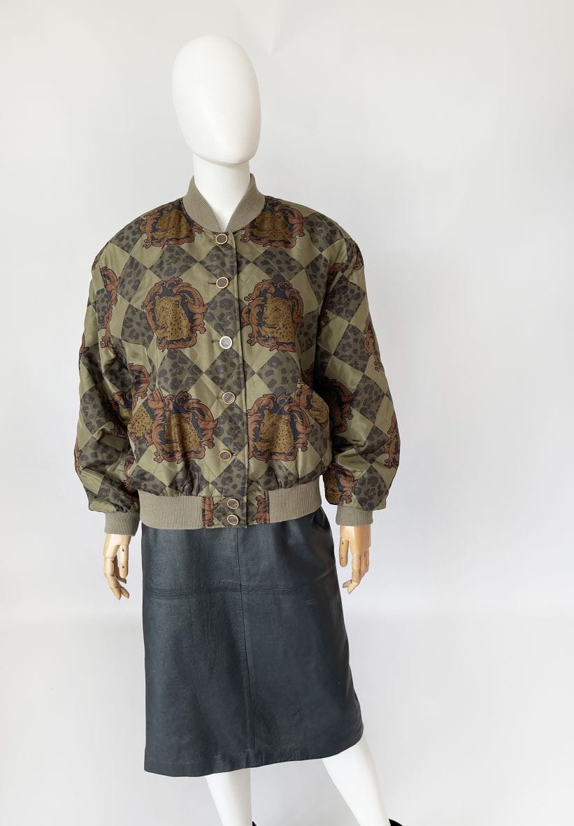 Lekka bomberka true vintage wykonana z jedwabnej tkaniny we wzory: romby, cętki i portrety tygrysów :) Na całości przeszycia tworzące efekt pikowania. Luźny fason z długimi rękawami, linia ramion lekko obniżona. Zapinana na dekoracyjne guziki. W dolnej części wsuwane kieszenie. Dół, mankiety i dekolt wykończone dzianinowym ściągaczem