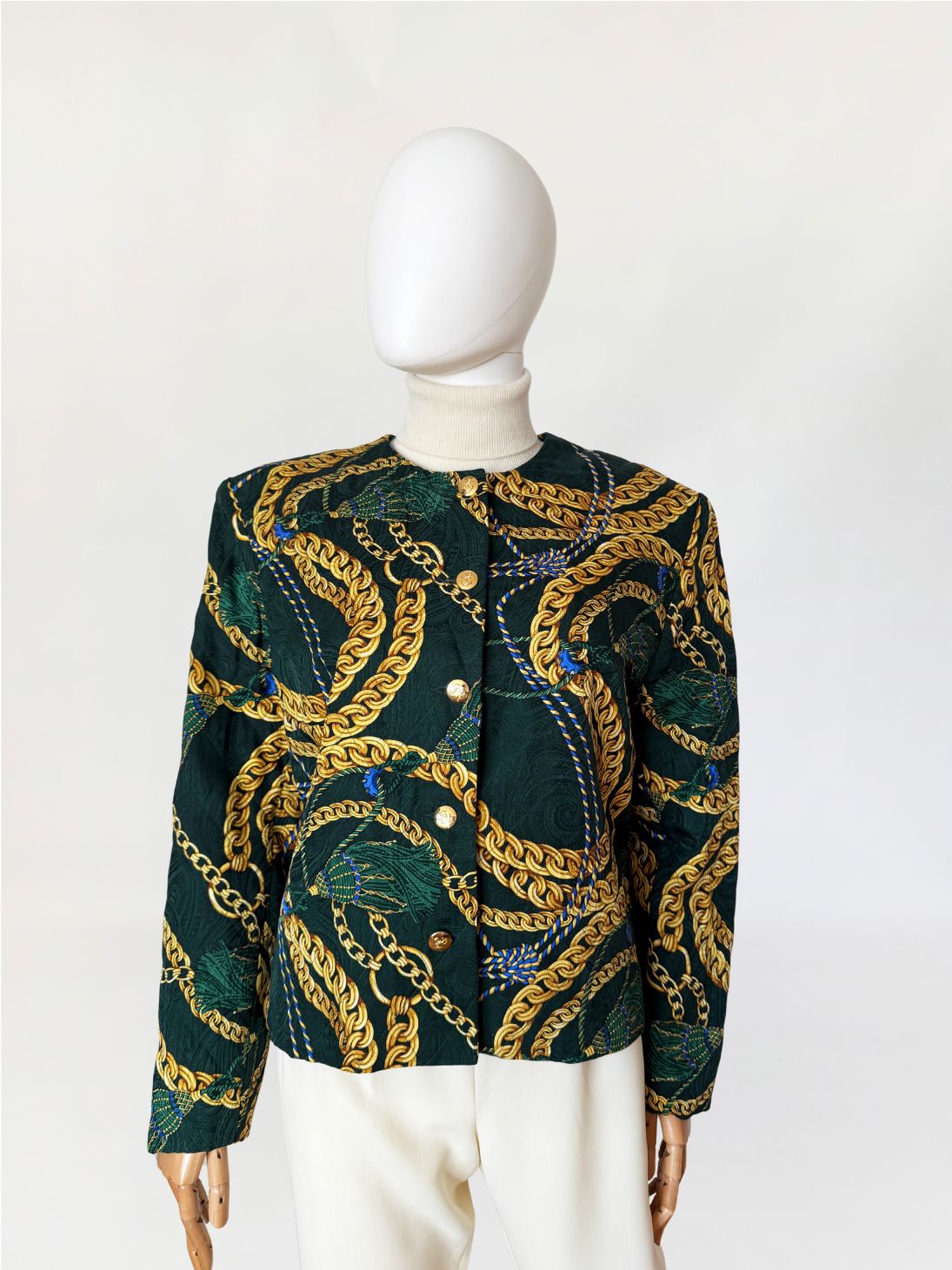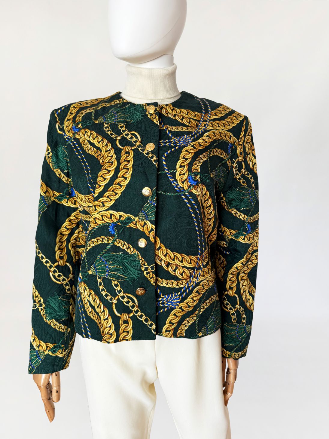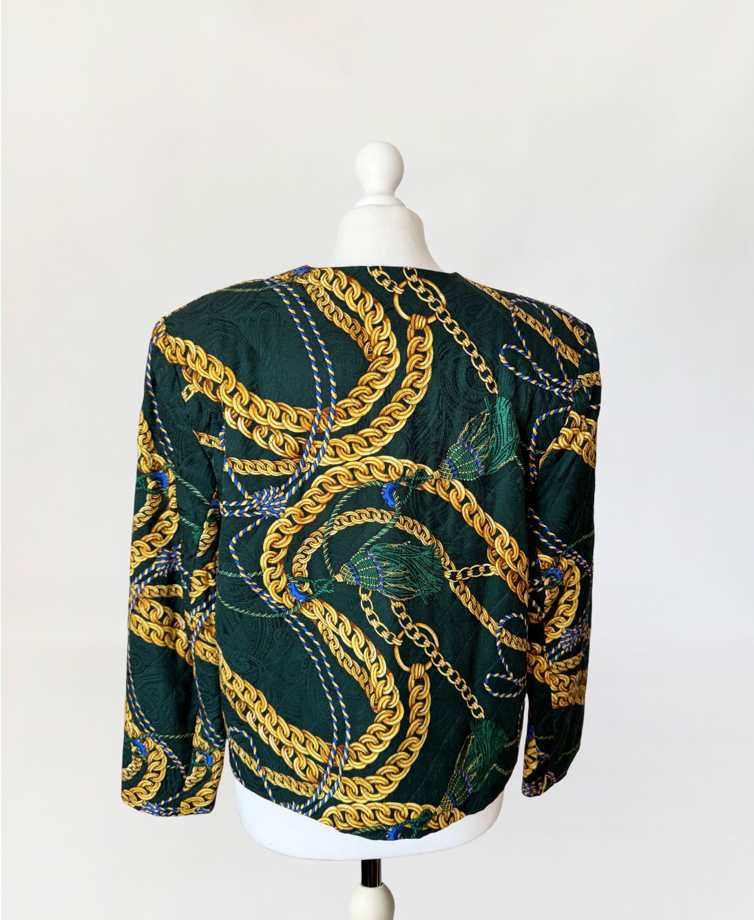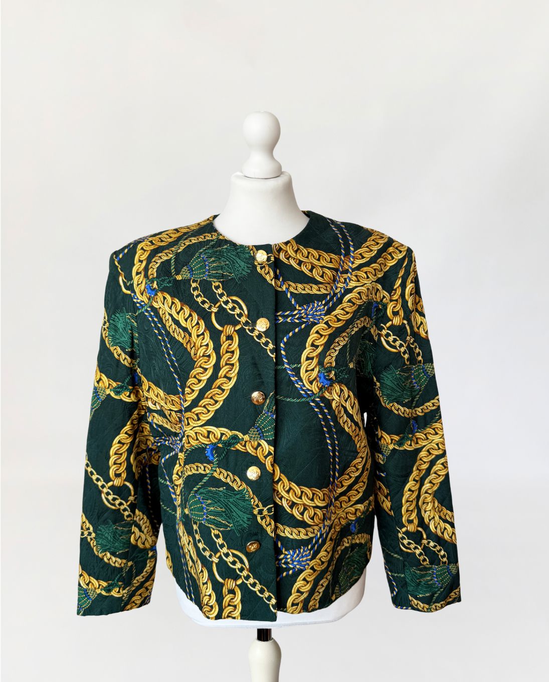 Marynarka vintage z lat 80-tych o pudełkowym kroju, uszyta z jedwabnej tkaniny w odcieniu butelkowej zieleni. Powierzchnię zdobi bogaty, barokowy wzór przedstawiający złoto-beżowe chwosty i łańcuchy, uzupełniony przeszyciami w formie karo, które nadają całości efekt pikowania. Zapinana na rząd ozdobnych, złotych guzików