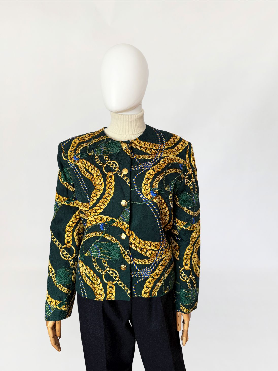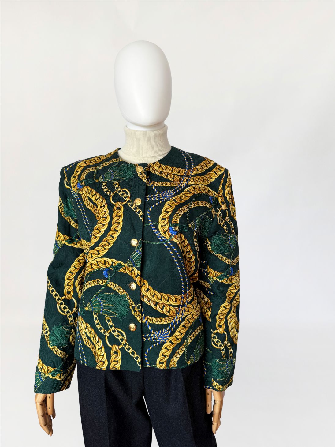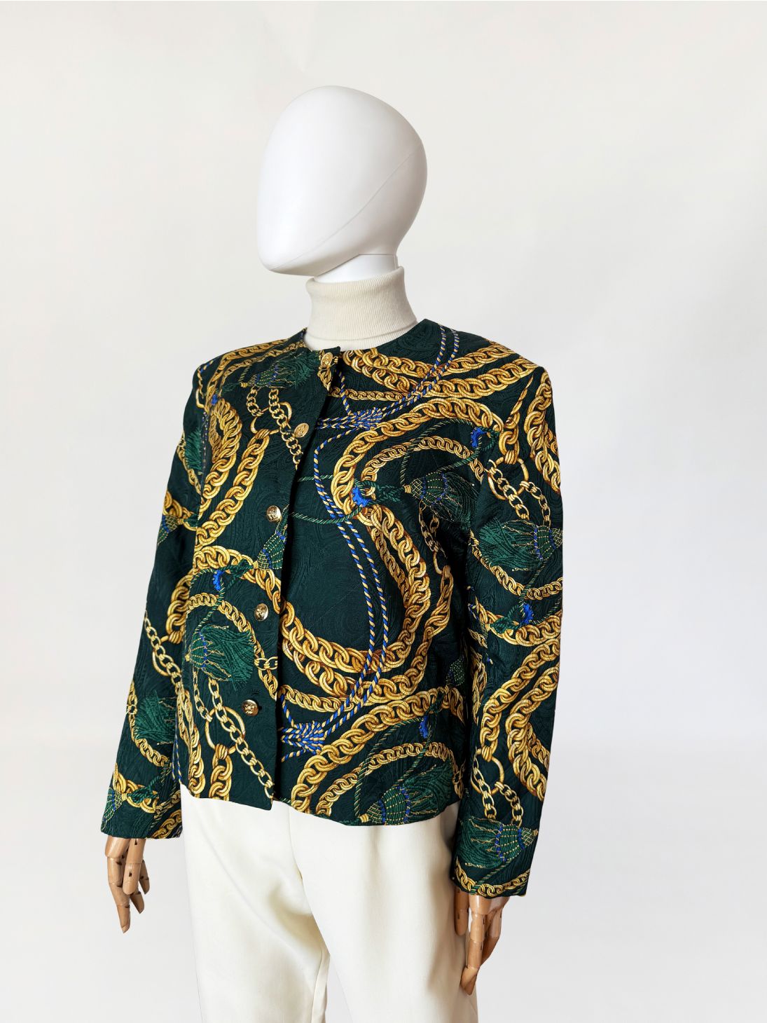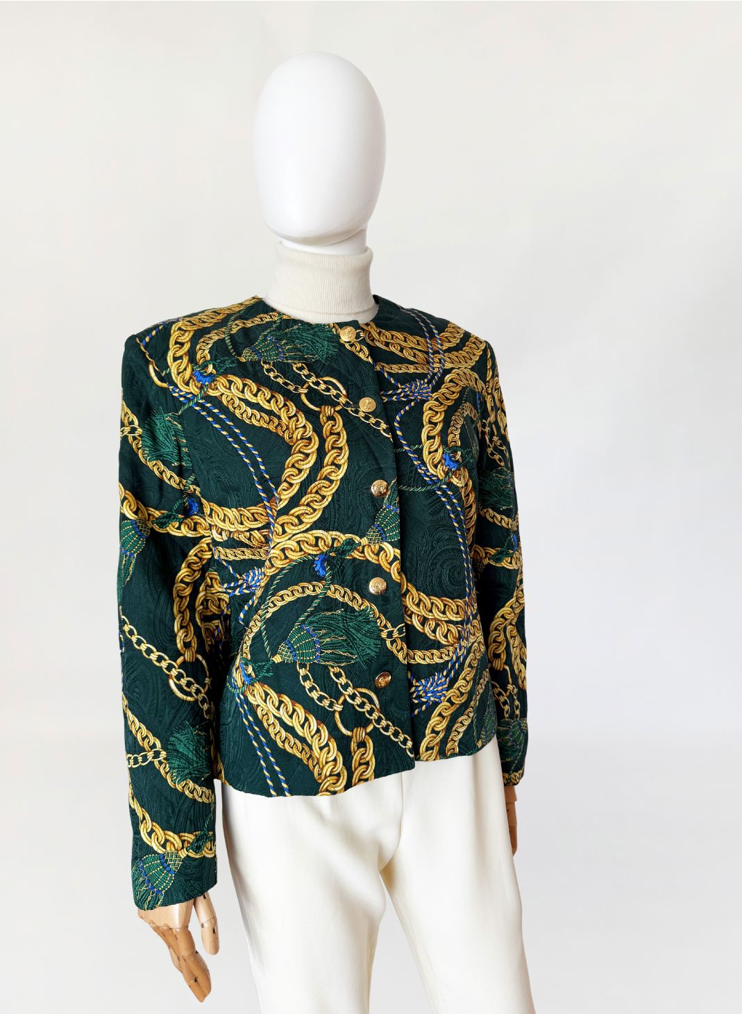 Marynarka vintage z lat 80-tych o pudełkowym kroju, uszyta z jedwabnej tkaniny w odcieniu butelkowej zieleni. Powierzchnię zdobi bogaty, barokowy wzór przedstawiający złoto-beżowe chwosty i łańcuchy, uzupełniony przeszyciami w formie karo, które nadają całości efekt pikowania. Zapinana na rząd ozdobnych, złotych guzików
