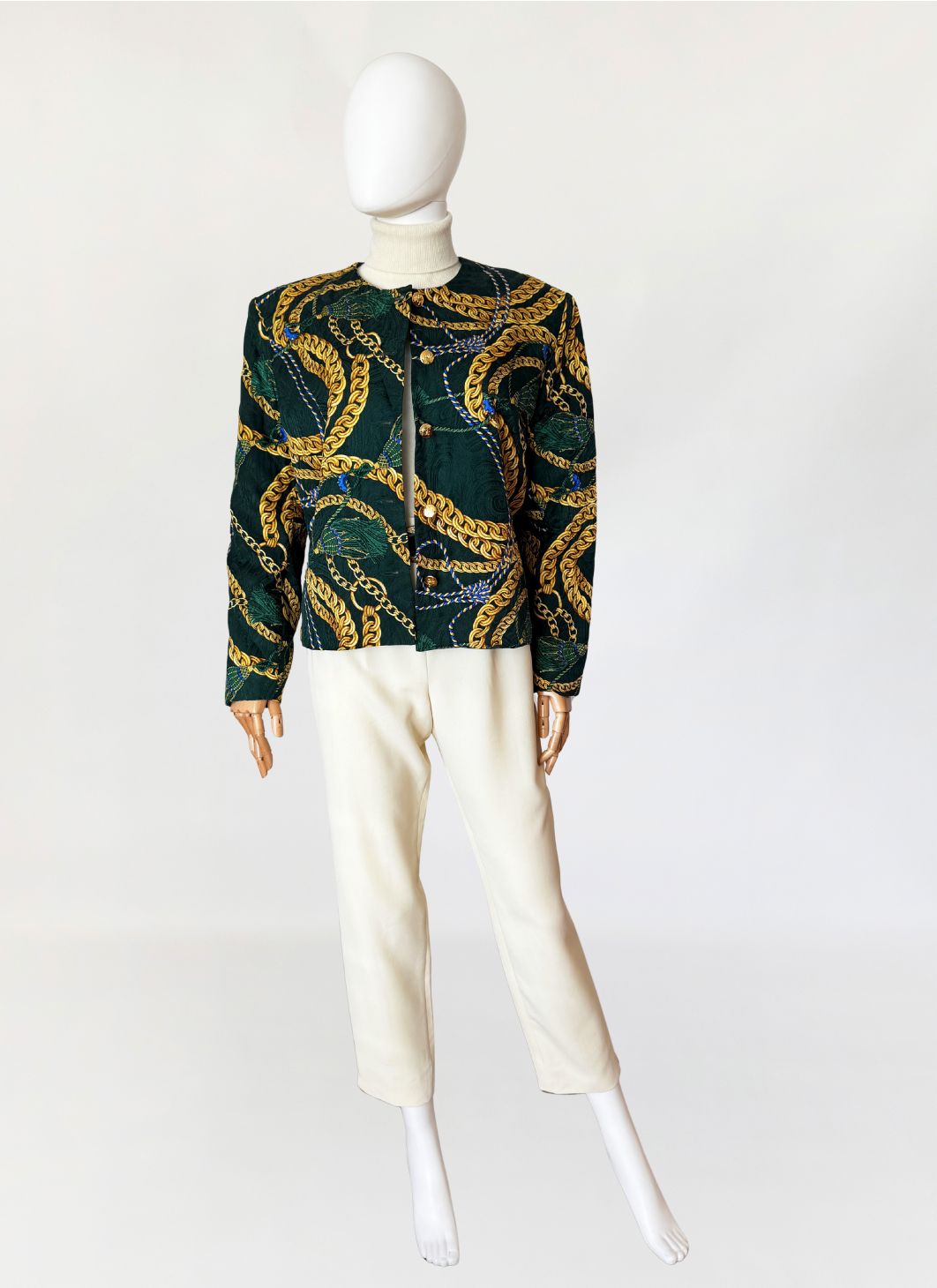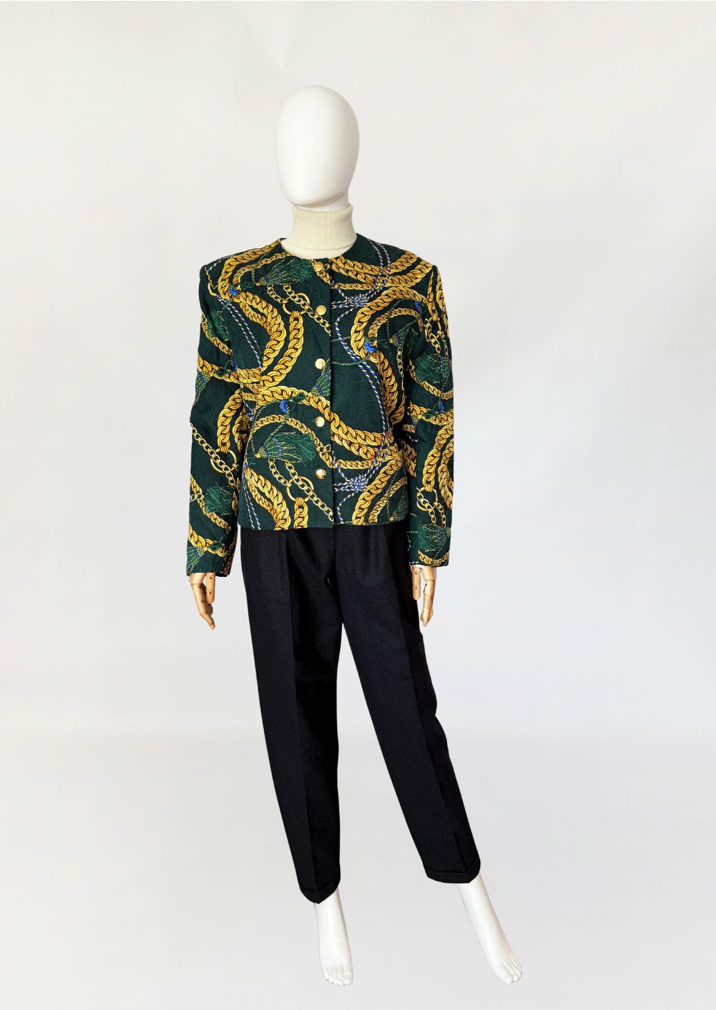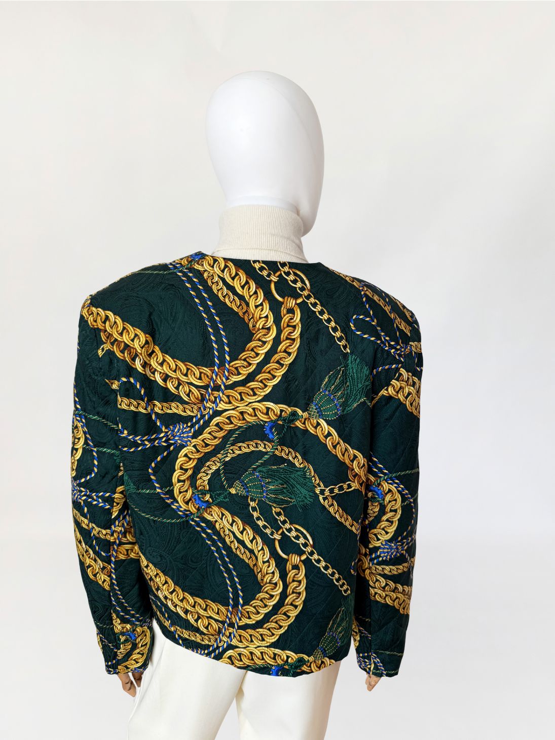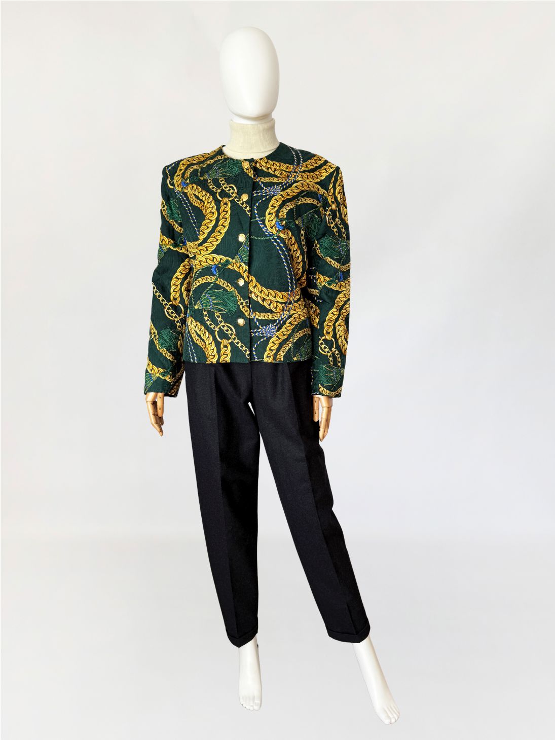 Marynarka vintage z lat 80-tych o pudełkowym kroju, uszyta z jedwabnej tkaniny w odcieniu butelkowej zieleni. Powierzchnię zdobi bogaty, barokowy wzór przedstawiający złoto-beżowe chwosty i łańcuchy, uzupełniony przeszyciami w formie karo, które nadają całości efekt pikowania. Zapinana na rząd ozdobnych, złotych guzików