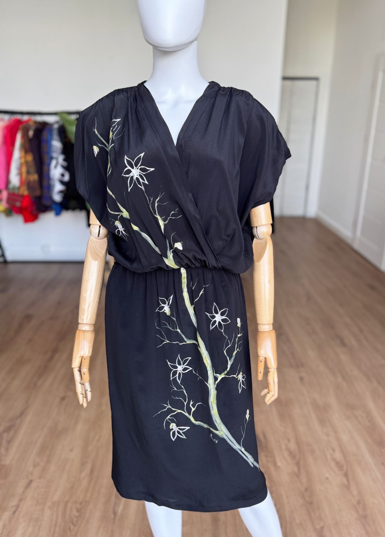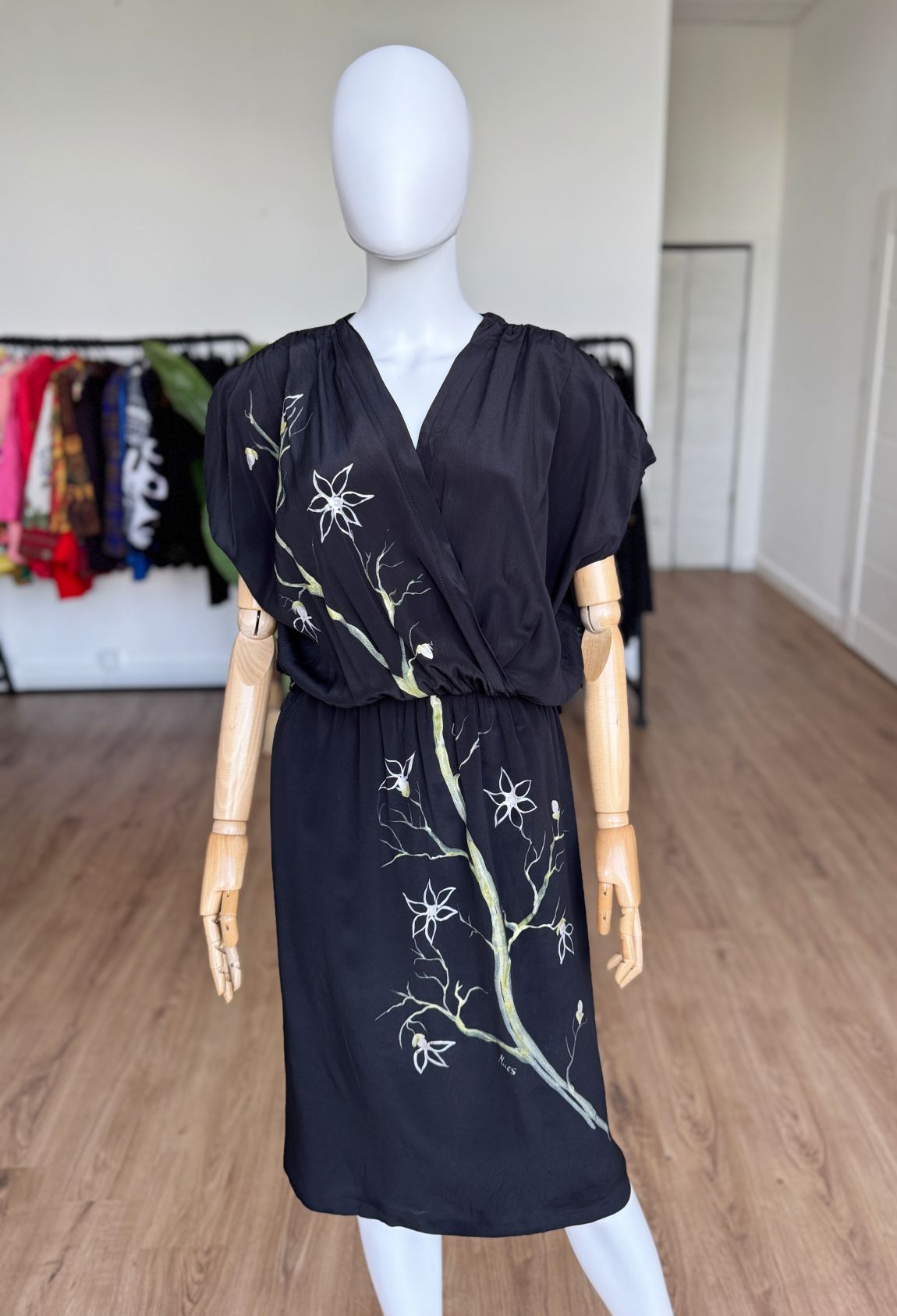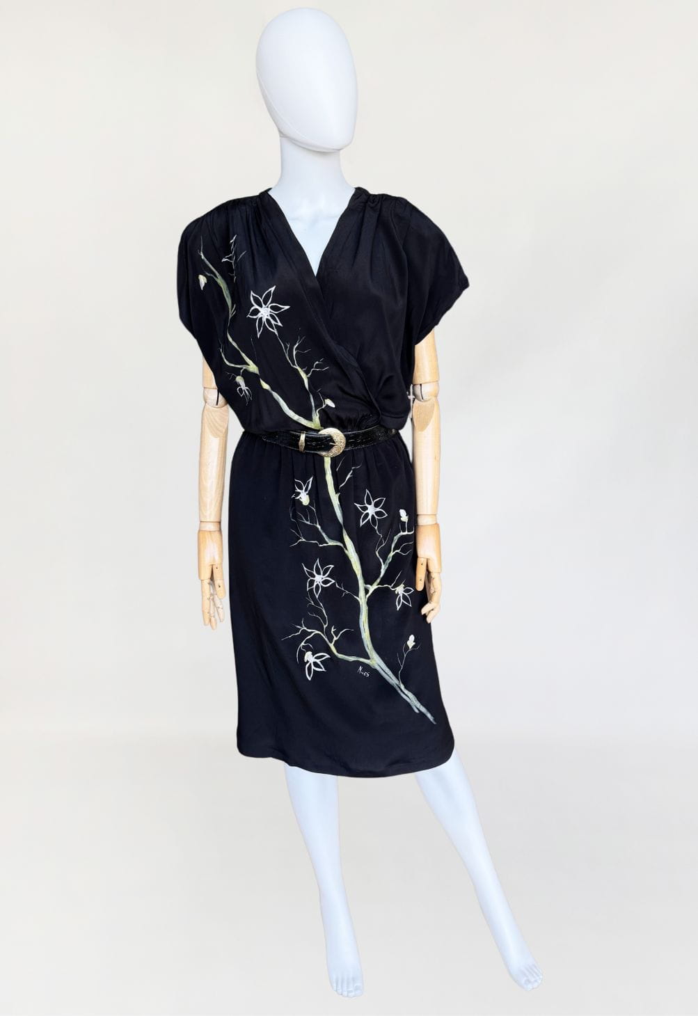 Włoska sukienka vintage wykonana z jedwabnego czarnego szyfonu. Front zdobią ręcznie malowane kwiatowe wzory. Swobodna kopertowa góra z krótkimi rękawami, w ramionach poduszki. W talii wszyta elastyczna gumka, są szlufki - w komplecie nie ma paska. Spódnica o prostym swobodnym fasonie.