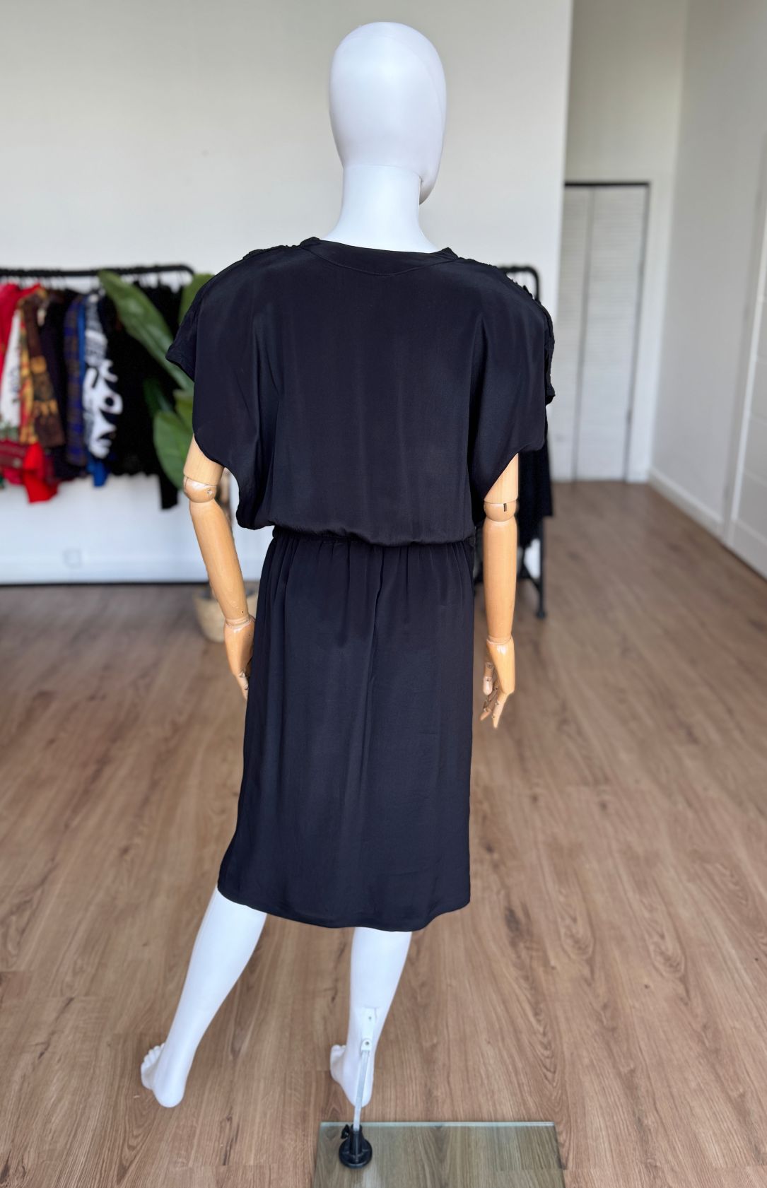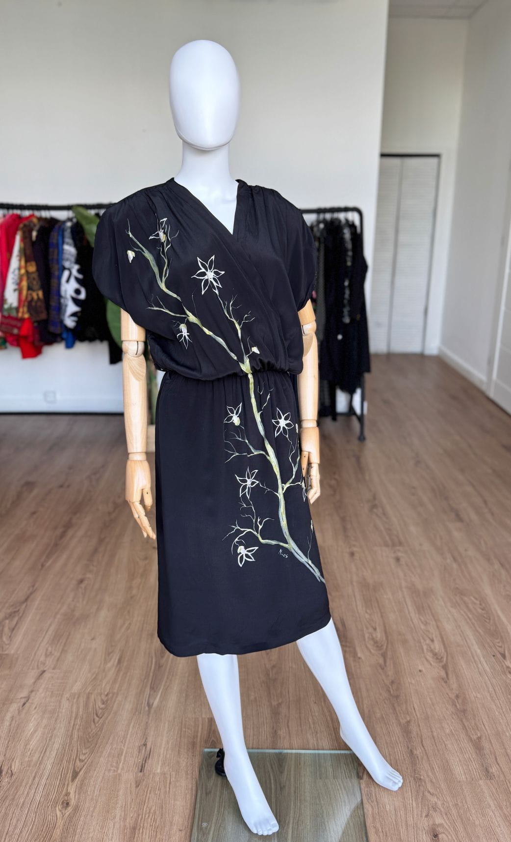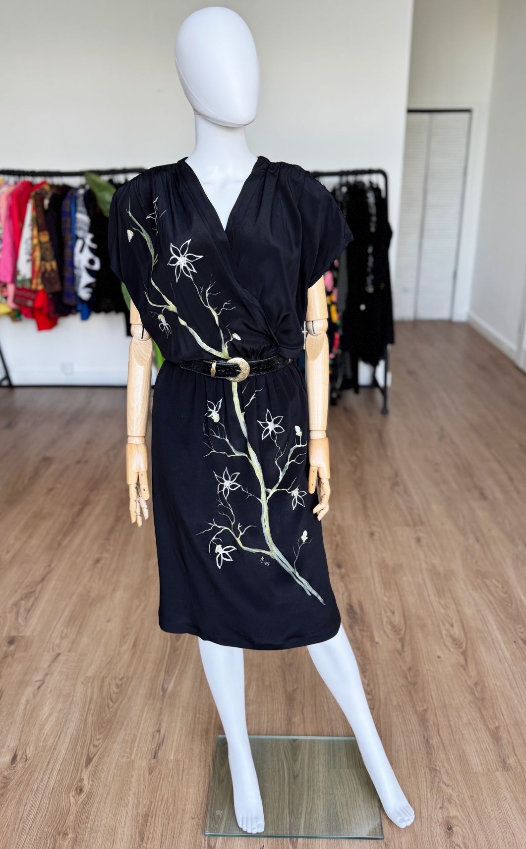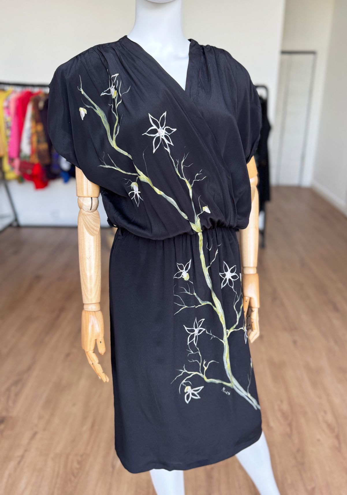 Włoska sukienka vintage wykonana z jedwabnego czarnego szyfonu. Front zdobią ręcznie malowane kwiatowe wzory. Swobodna kopertowa góra z krótkimi rękawami, w ramionach poduszki. W talii wszyta elastyczna gumka, są szlufki - w komplecie nie ma paska. Spódnica o prostym swobodnym fasonie.