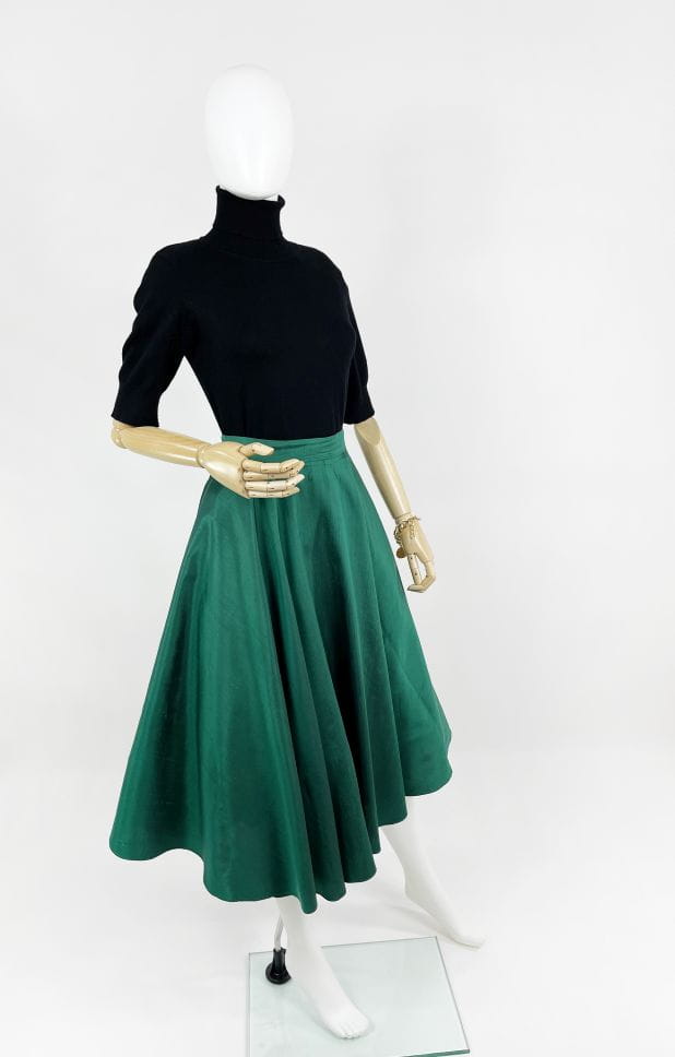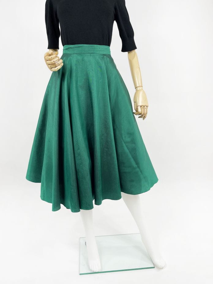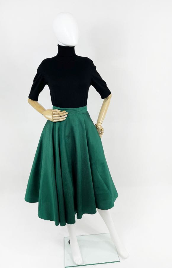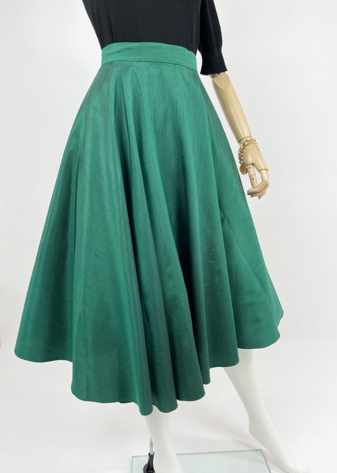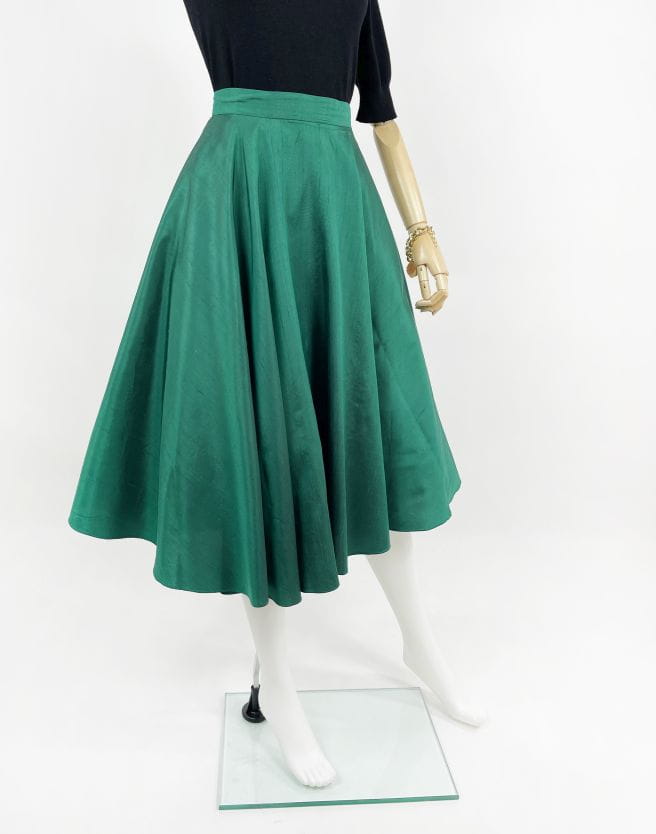 Włoska spódnica vintage wykonana z jedwabnej surówki w kolorze szmaragdowym. Przepiękny rozkloszowany fason, spódnica fantastycznie się unosi dzięki dodatkowej tiulowej podszewce.