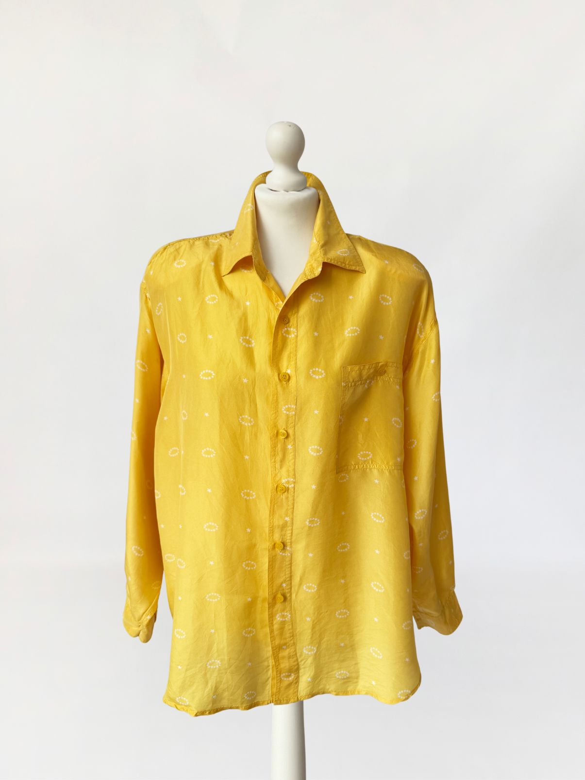Koszula vintage o fasonie oversize z długimi rękawami i obniżoną linią ramion. Wykona z naturalnego jedwabiu w słonecznym żółtym kolorze w drobne jasne wzory. W ramionach poduszki. Od frontu, w górnej części duża kieszeń.