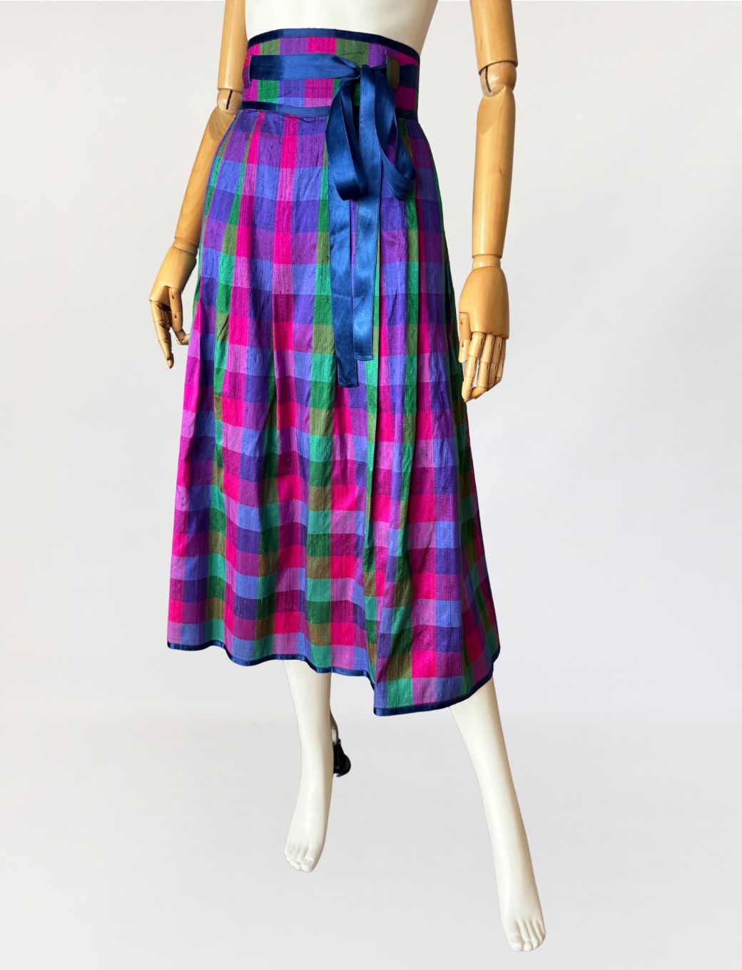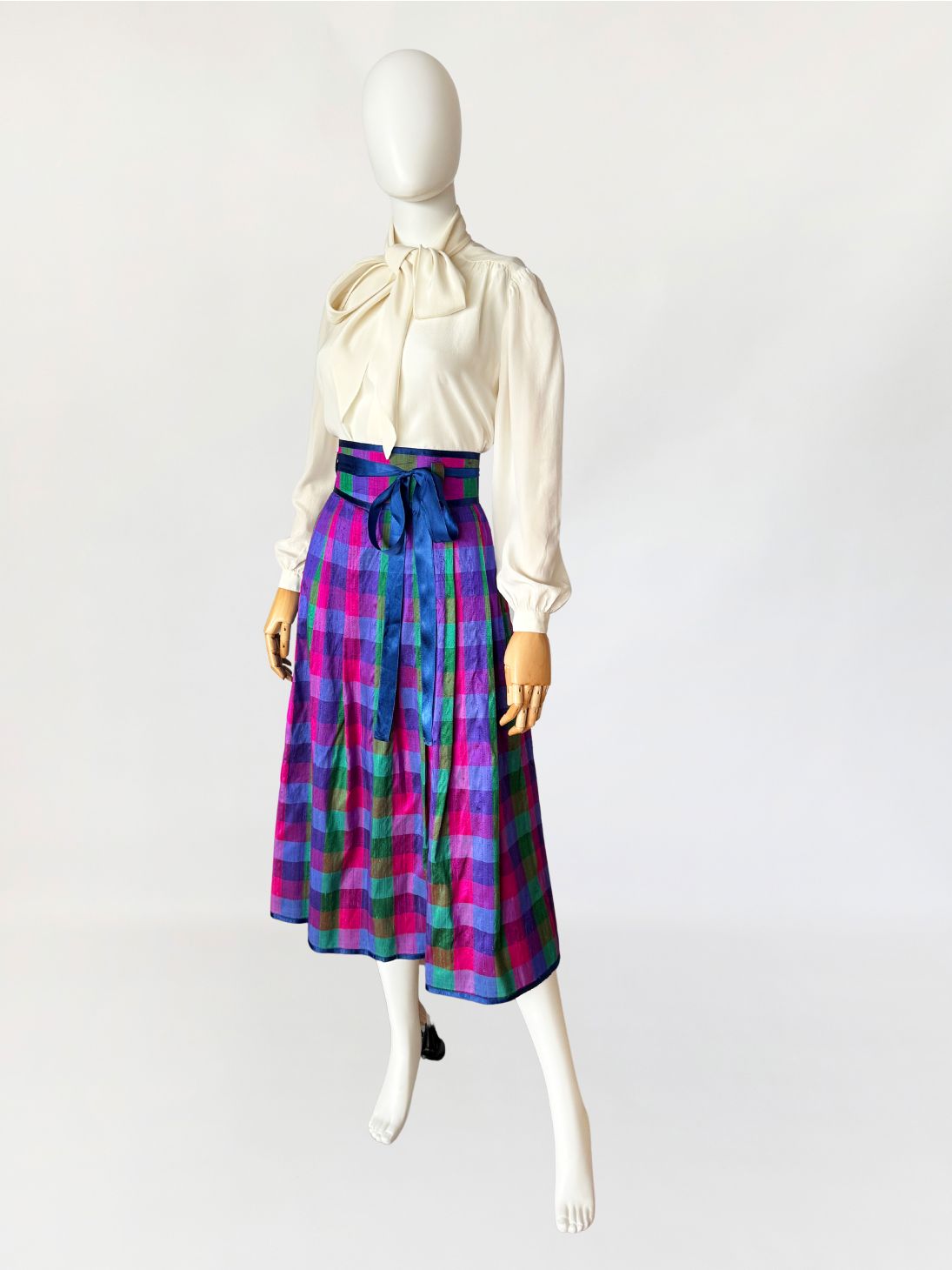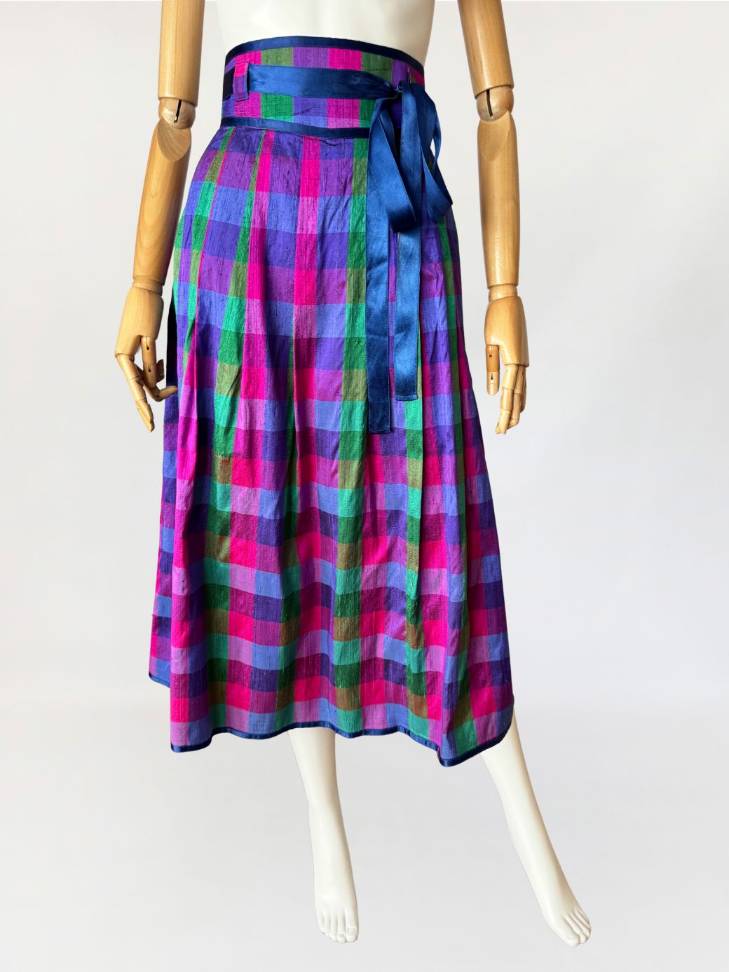 Austriacka spódnica vintage wykonana w całości z naturalnego jedwabiu o delikatnie sztywniejszej, papierowej strukturze charakterystycznej dla jedwabnej tafty. Wzór w klasyczną kratę o nieregularnym charakterze w intensywnych odcieniach fuksji, kobaltu, zieleni i głębokiego granatu. Krój oparty na szerokich, miękko układających się kontrafałdach, które nadają objętość bez budowania ciężaru. W talii szeroki, profilowany pas obszyty po obwodzie i wiązany długą taśmą w granatowym odcieniu. Długość midi, dół wykończony lamówką.