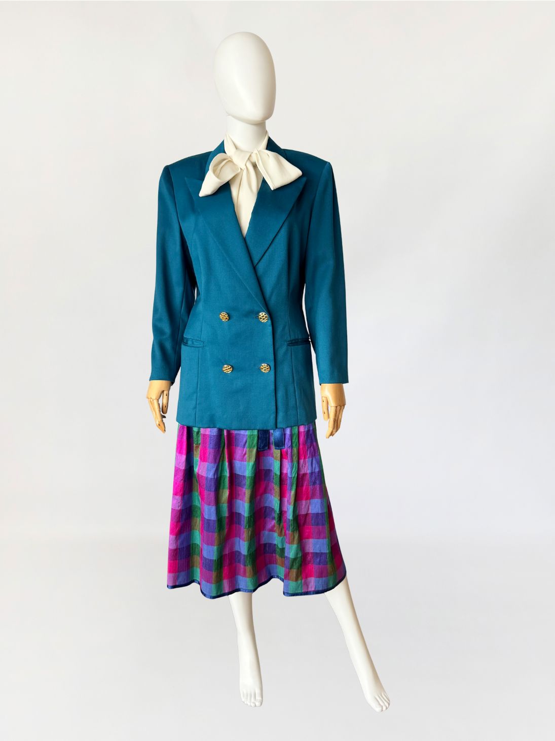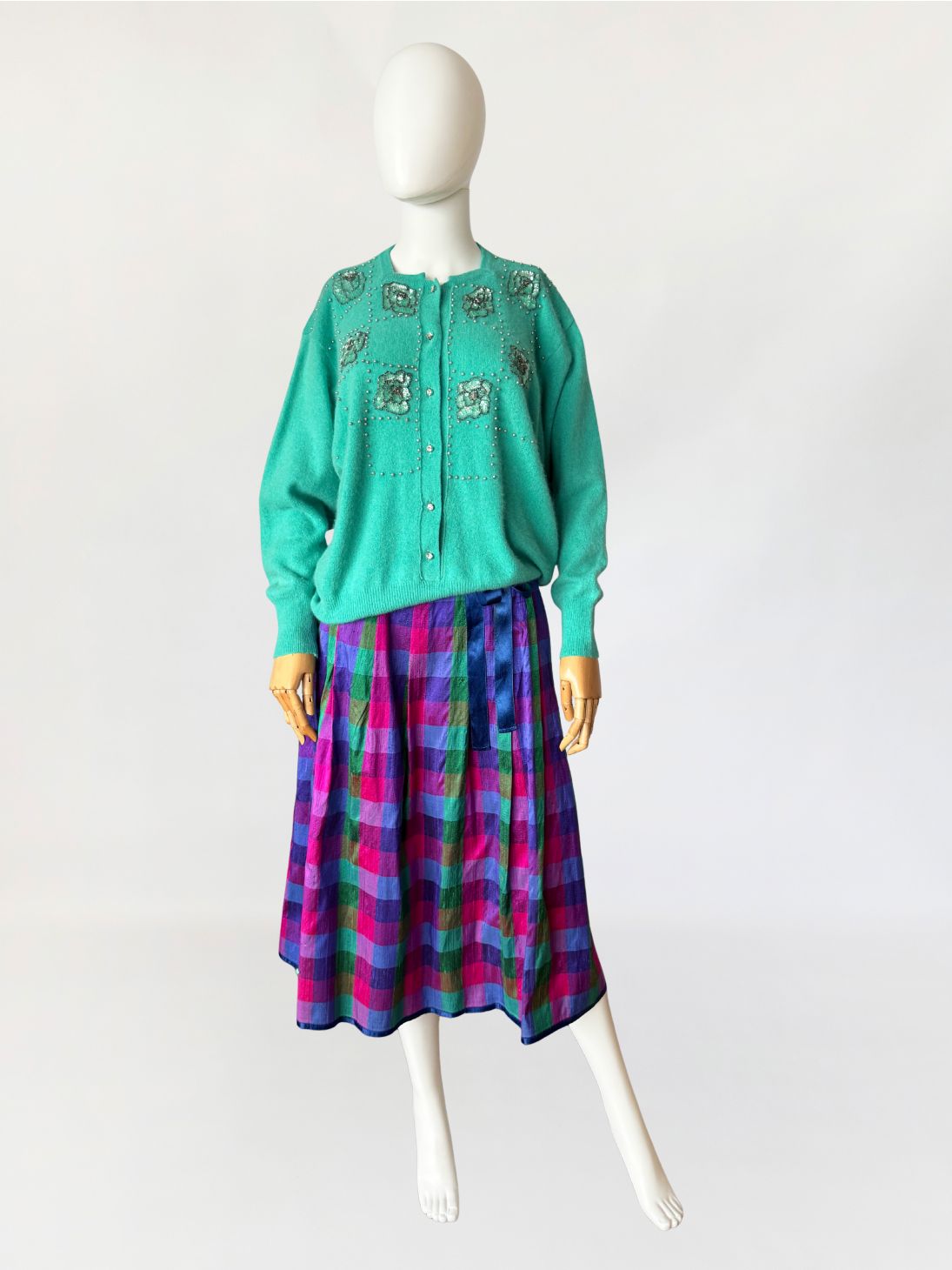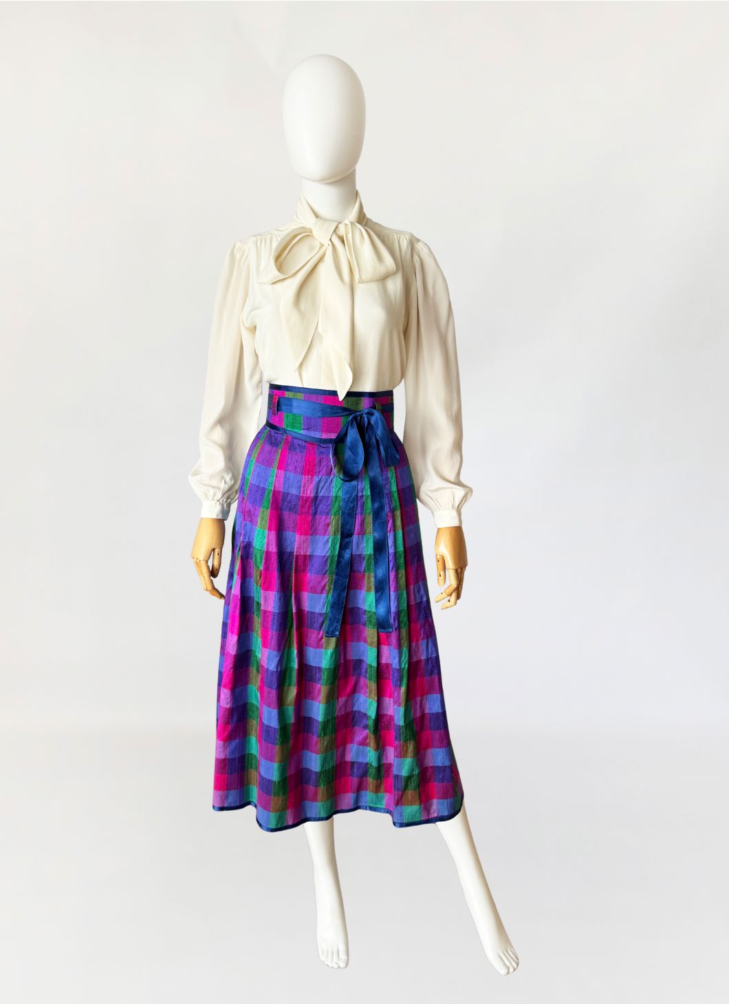Austriacka spódnica vintage wykonana w całości z naturalnego jedwabiu o delikatnie sztywniejszej, papierowej strukturze charakterystycznej dla jedwabnej tafty. Wzór w klasyczną kratę o nieregularnym charakterze w intensywnych odcieniach fuksji, kobaltu, zieleni i głębokiego granatu. Krój oparty na szerokich, miękko układających się kontrafałdach, które nadają objętość bez budowania ciężaru. W talii szeroki, profilowany pas obszyty po obwodzie i wiązany długą taśmą w granatowym odcieniu. Długość midi, dół wykończony lamówką.