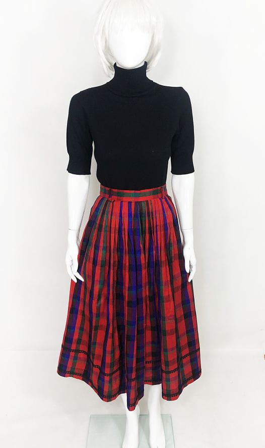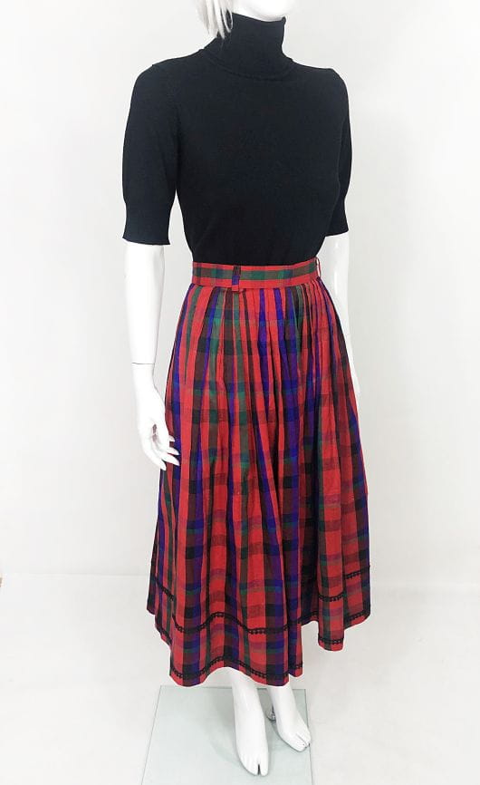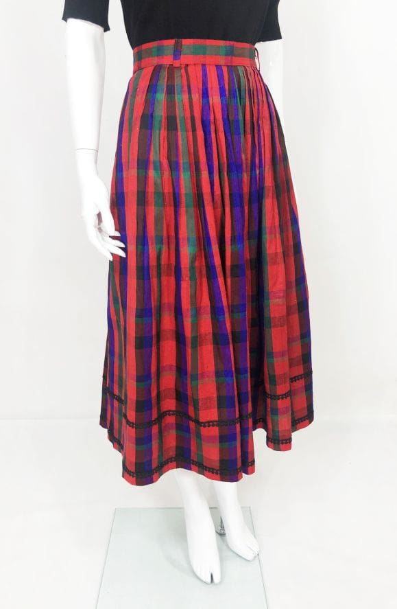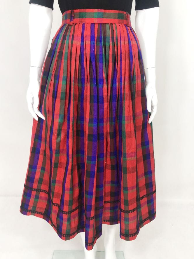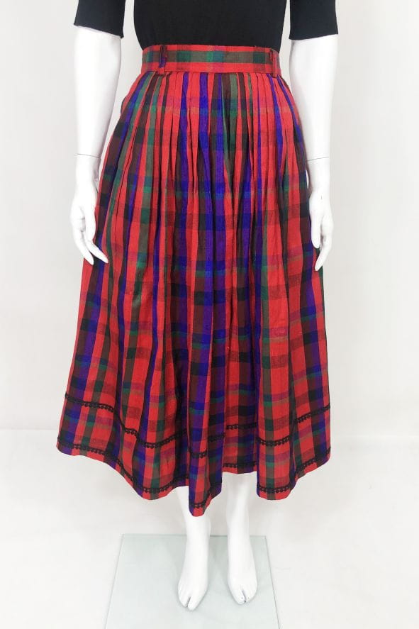 Długa spódnica vintage o rozłożystym kroju. Wykonana z surówki jedwabne w kolorową kratę. Dół wykończony czarnymi drobnymi tasiemkami. Model z podszewką.