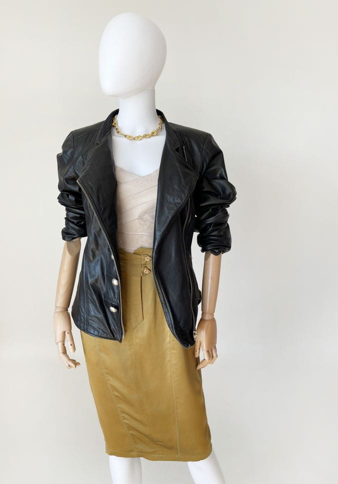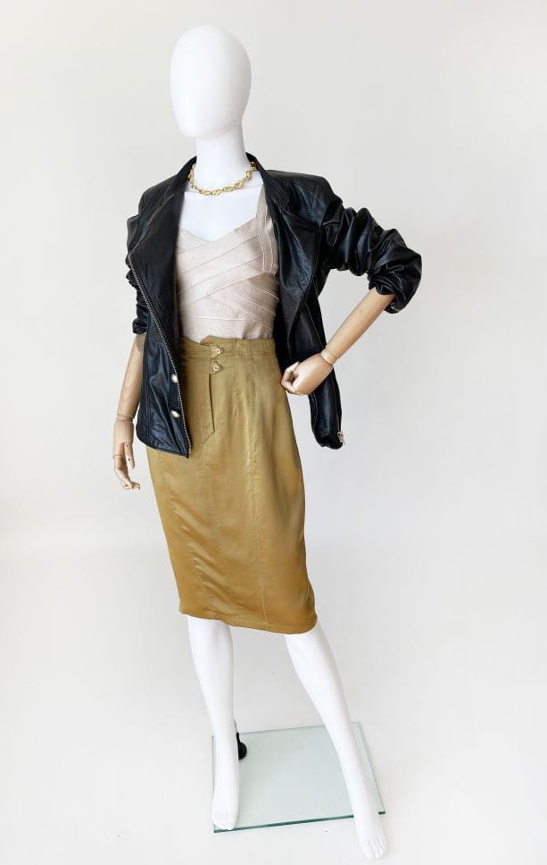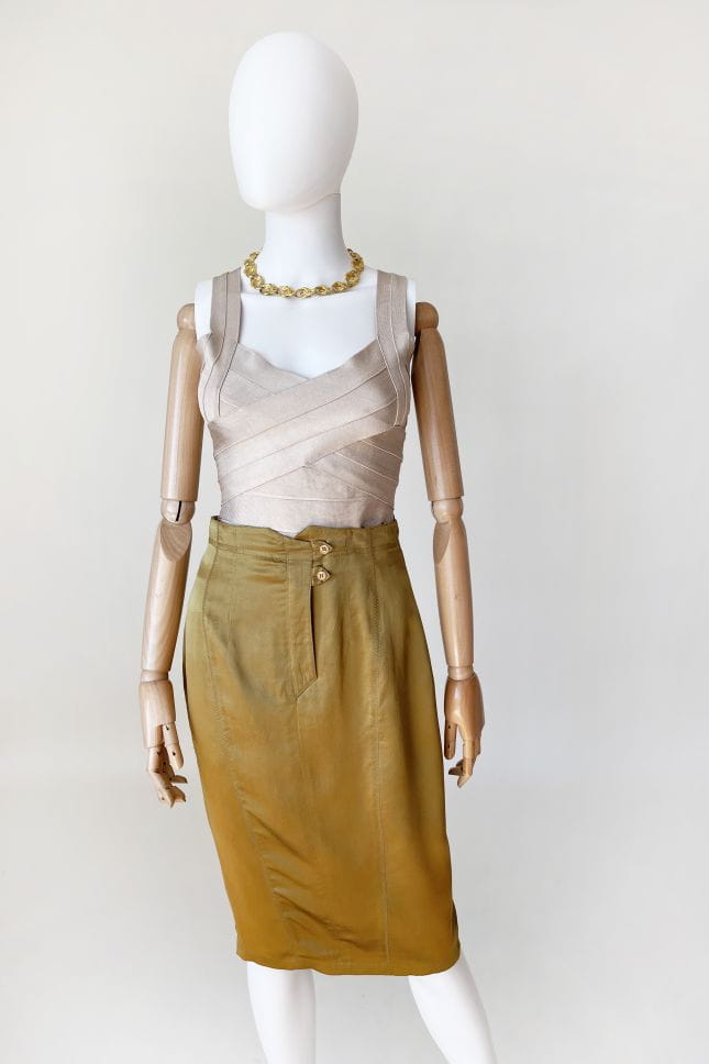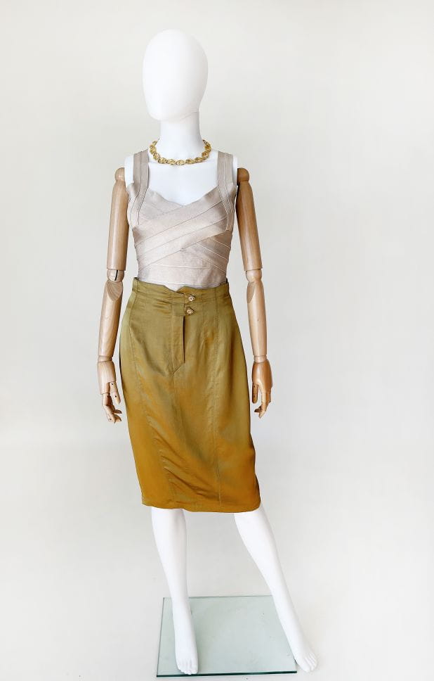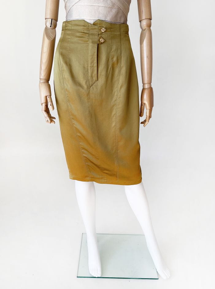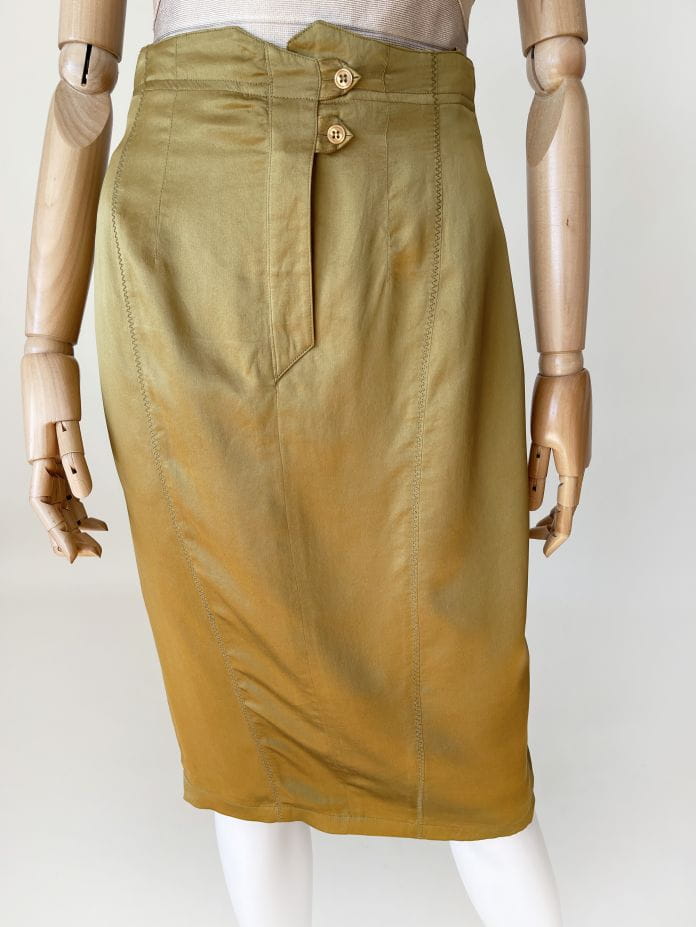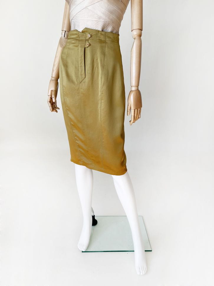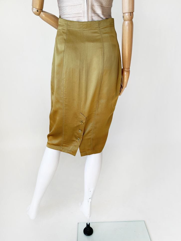 Spódnica vintage wykonana z lekkiej jedwabnej tkaniny w kolorze oliwkowym. Ołówkowy fason z wyższym stanem. Z tyłu u dołu rozporek zapinany na guziki. Model z podszewką.