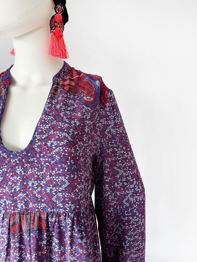 Wzorzysta sukienka marki Mexx. Model z aktualnych kolekcji, który jednak równie dobrze mógłby być okazem z lat 70-tych. Uszyta z kolorowej jedwabnej tkaniny we wzory, przenosi nas w czasie do dekady dzieci kwiatów i hipisowskiego luzu. Góra z dekoltem V i długimi rozkloszowanymi rękawami. W pasie odcinana, z luźnym, swobodnym dołem. Nie ma podszewki, jedwab (jak to jedwab) jest przewiewny i pozwala skórze oddychać.