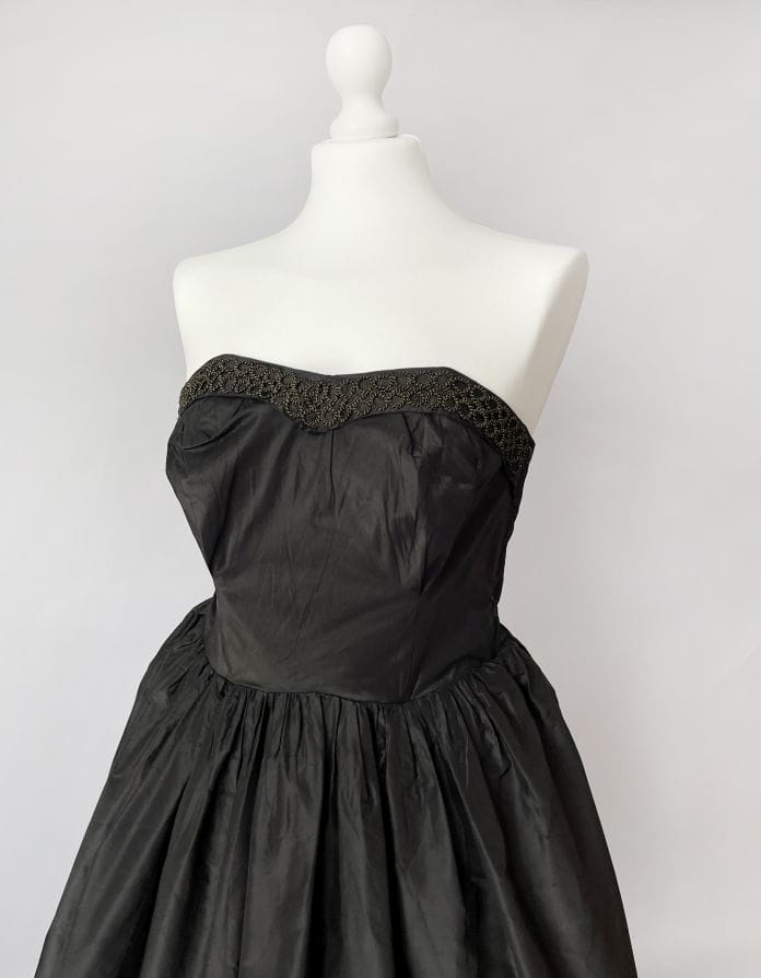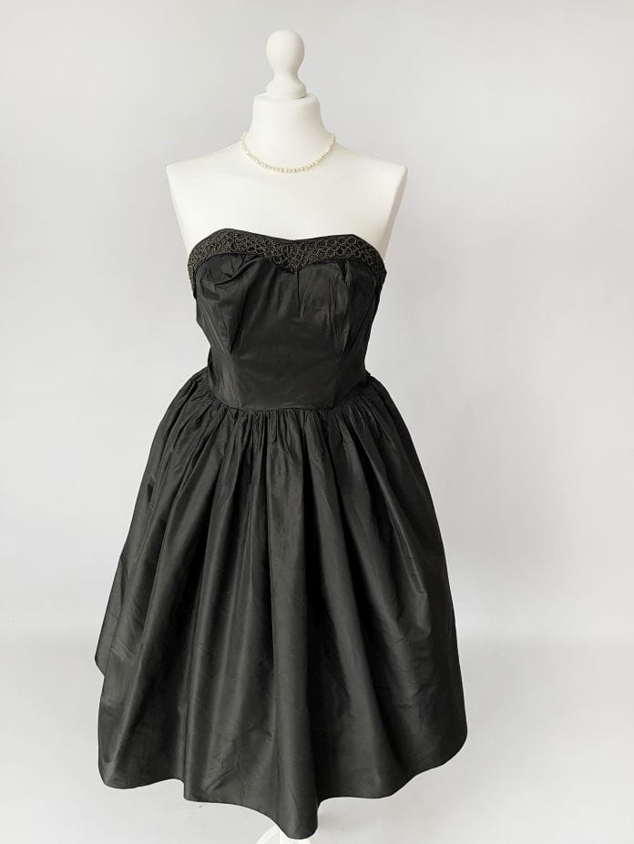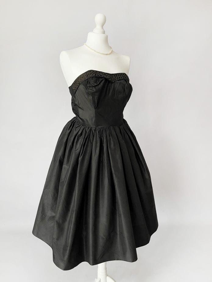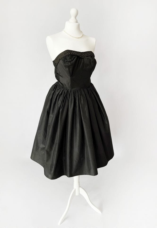 Autentyczna sukienka vintage z lat 50-tych uszyta z jedwabnej tafty. Tkanina jest delikatna, ale dość dobrze trzyma fason i ładnie się unosi, efekt można wzmocnić halką (jak np. na zdjęciu na manekinie). Gorsetowa góra usztywniana fiszbinami z kołnierzem na dekolcie z dekoracyjną plecioną aplikacją. Dół mocno rozkloszowany, w talii drapowana. Sukienka zapinana jest po boku, w całości na haftki i małe metalowe przepinki (w jednej brakuje części zapięcia). Płócienna podszewka wszyta tylko w górnej części.