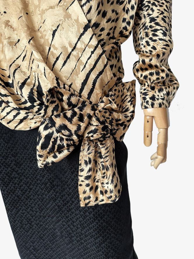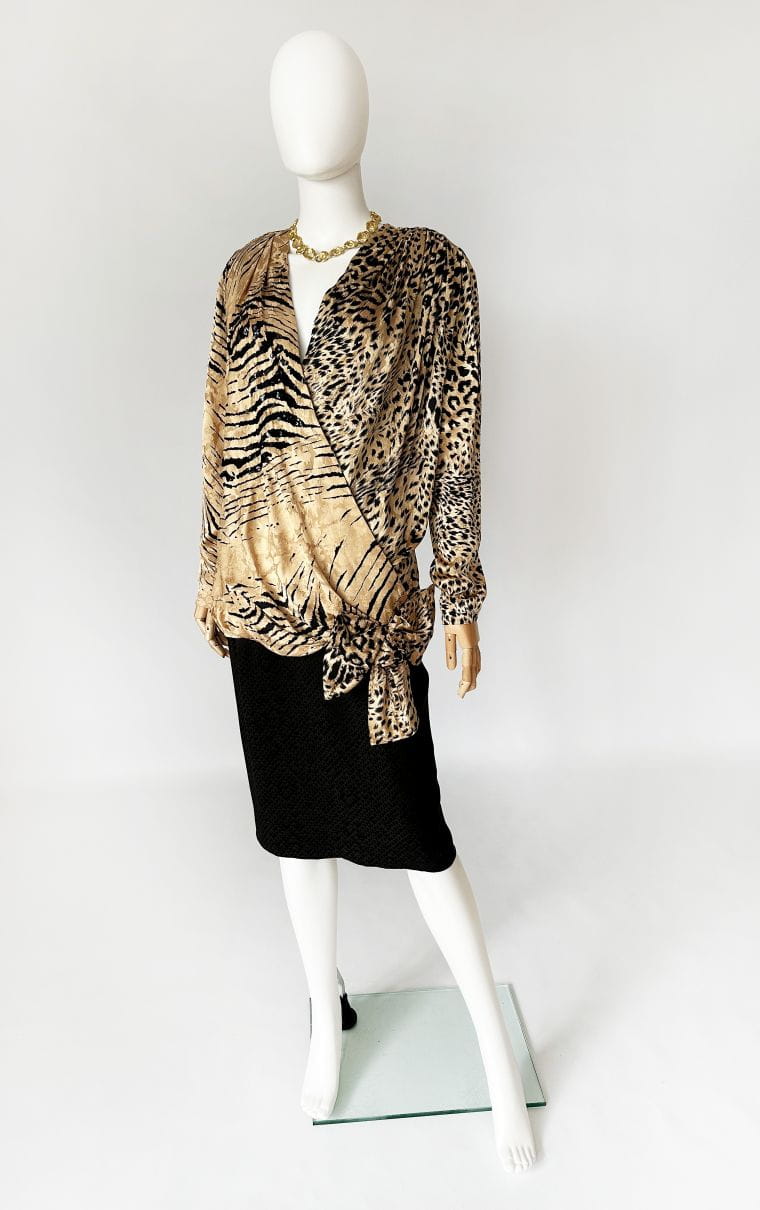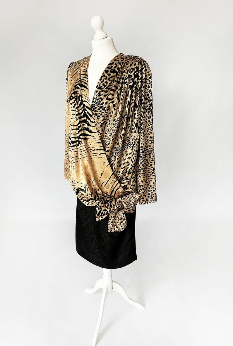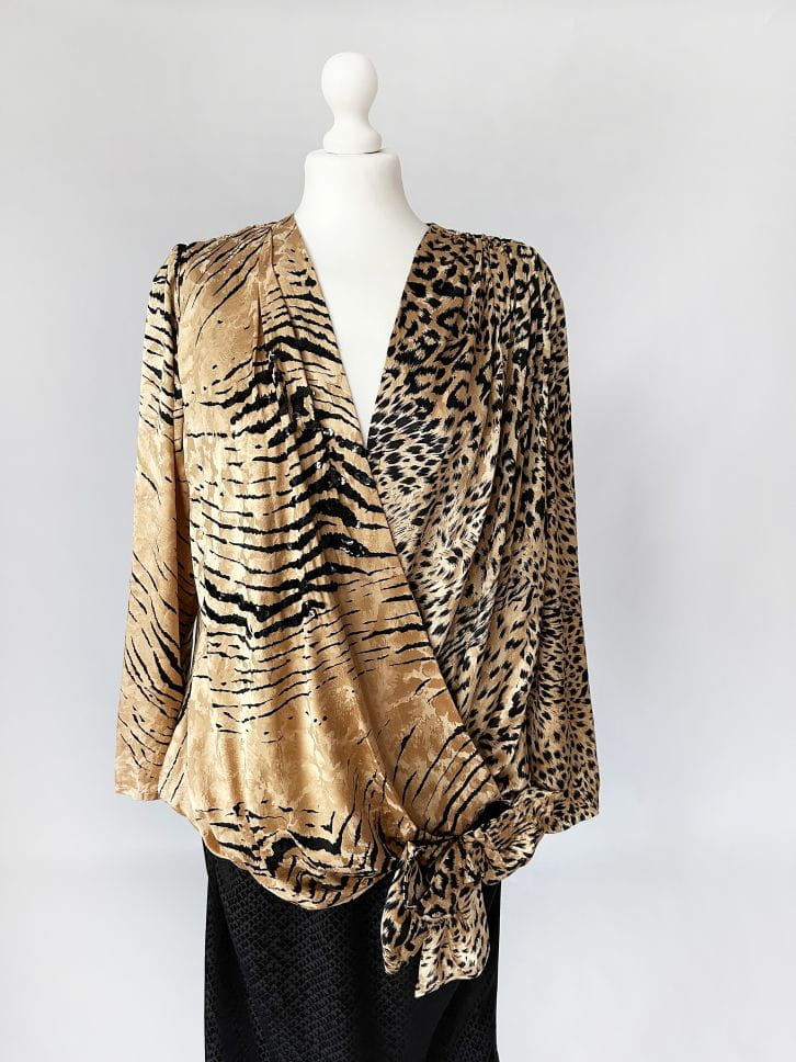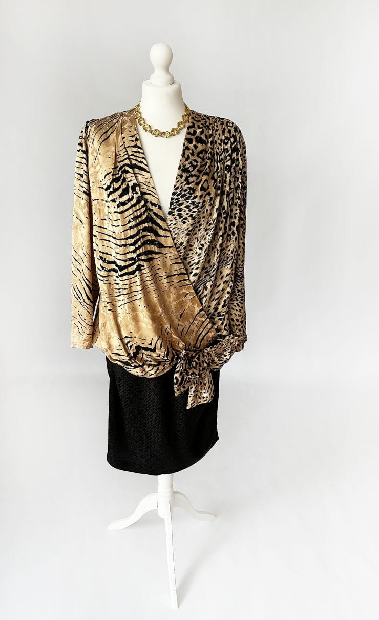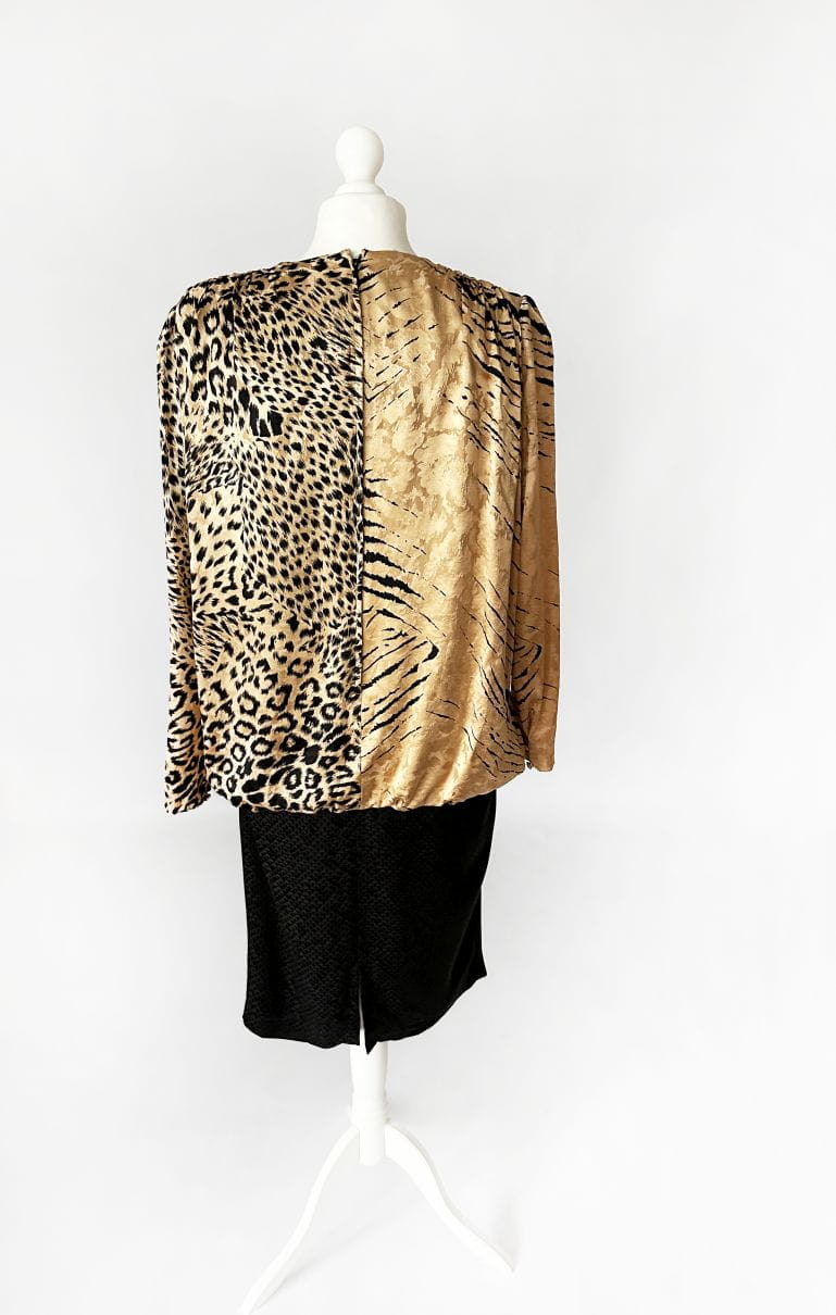 Drapieżna piękność z lat 80-tych, świetnie wpisująca się w stylistykę mob wife. Wykonana w całości z jedwabnej tkaniny. Góra oversize'owa o kopertowym fasonie z długimi rękawami i obniżonym pasem. Beżowo-złota tkanina w tygrysie cętki, gdzieniegdzie przyozdobiona czarnymi cekinami. U dołu duża dekoracyjna kokarda. Spódnica o prostym fasonie, wykonana również z jedwabiu w dyskretne drobne wzory.