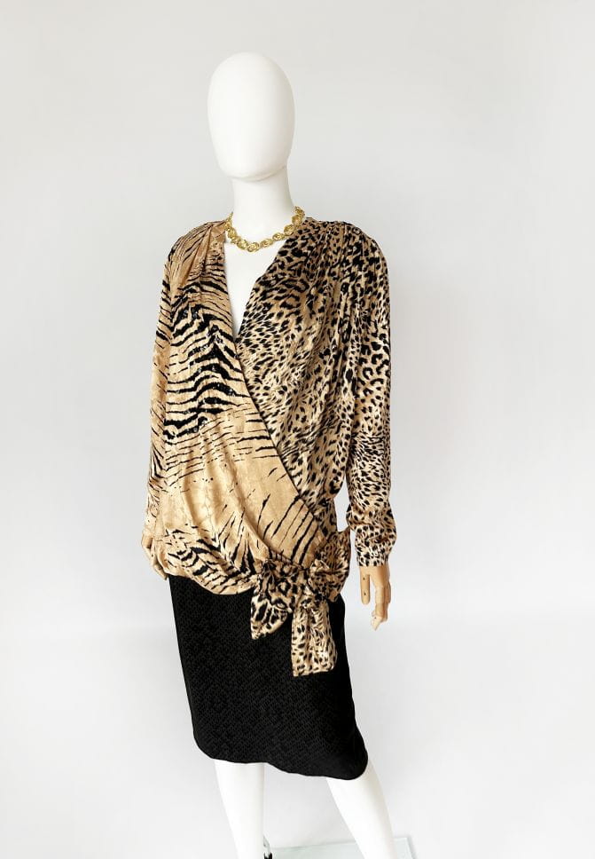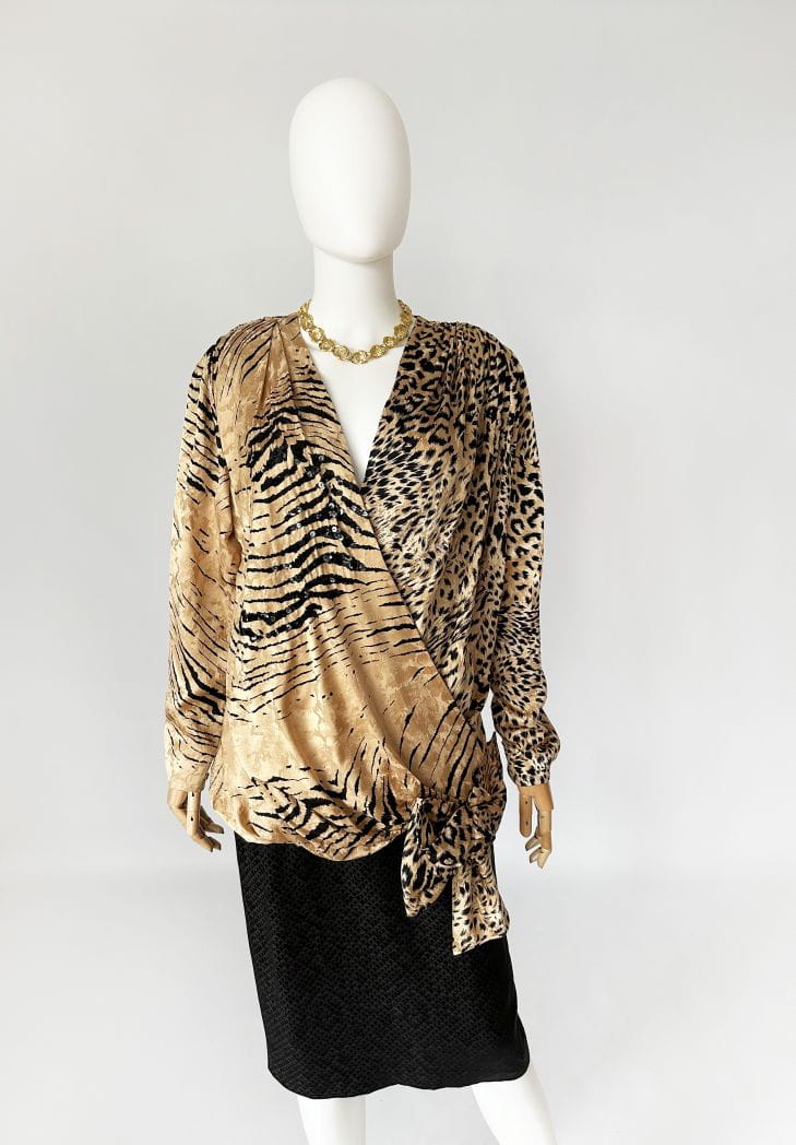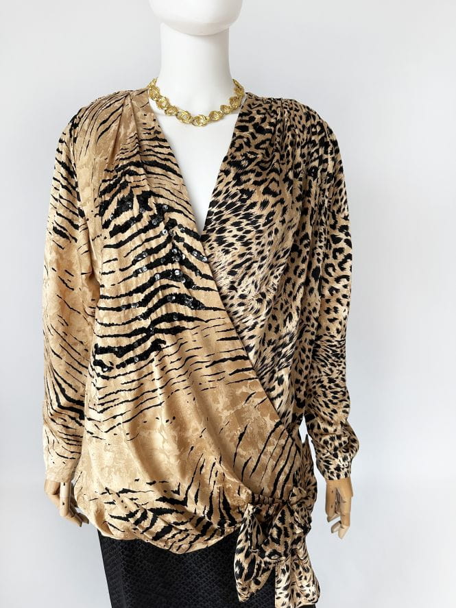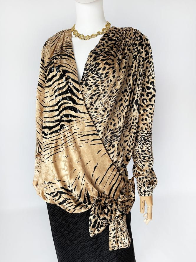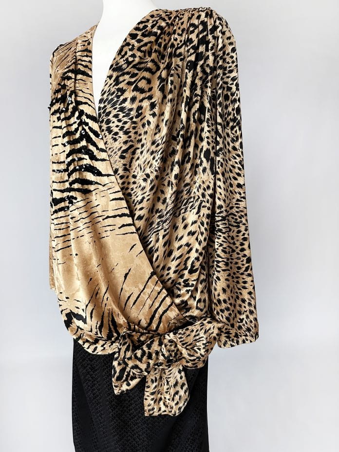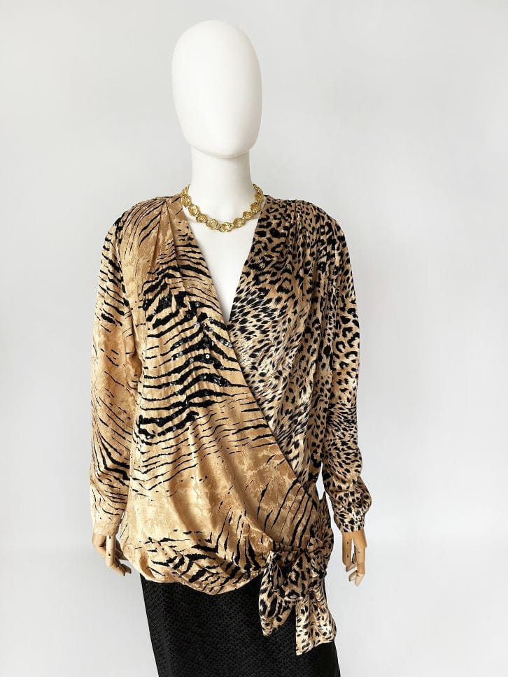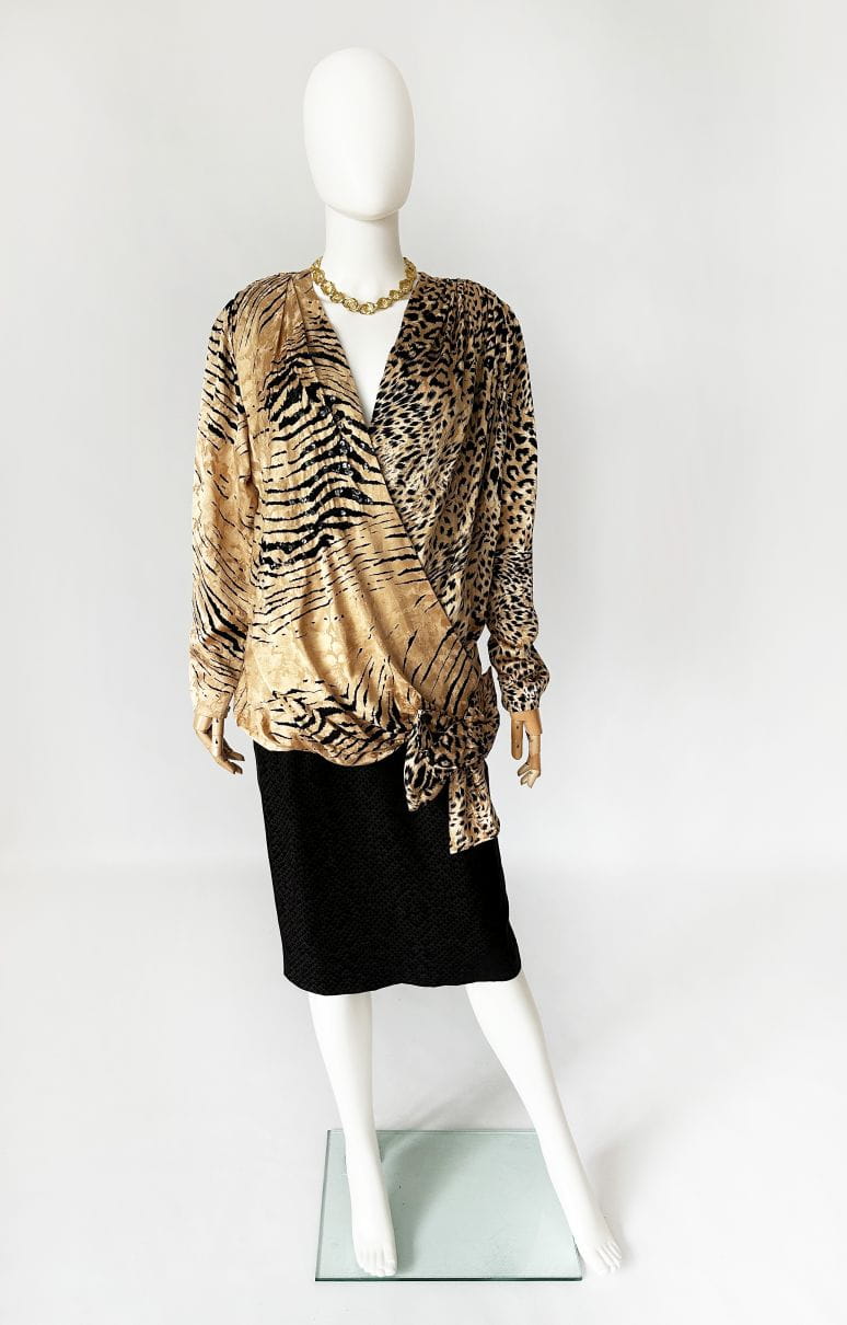 Drapieżna piękność z lat 80-tych, świetnie wpisująca się w stylistykę mob wife. Wykonana w całości z jedwabnej tkaniny. Góra oversize'owa o kopertowym fasonie z długimi rękawami i obniżonym pasem. Beżowo-złota tkanina w tygrysie cętki, gdzieniegdzie przyozdobiona czarnymi cekinami. U dołu duża dekoracyjna kokarda. Spódnica o prostym fasonie, wykonana również z jedwabiu w dyskretne drobne wzory.