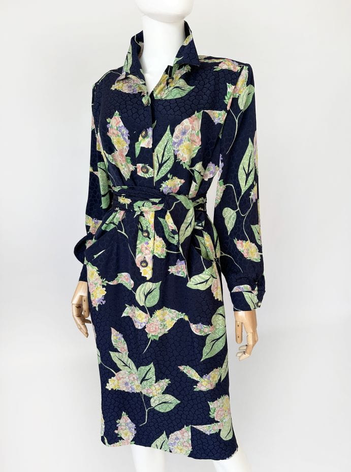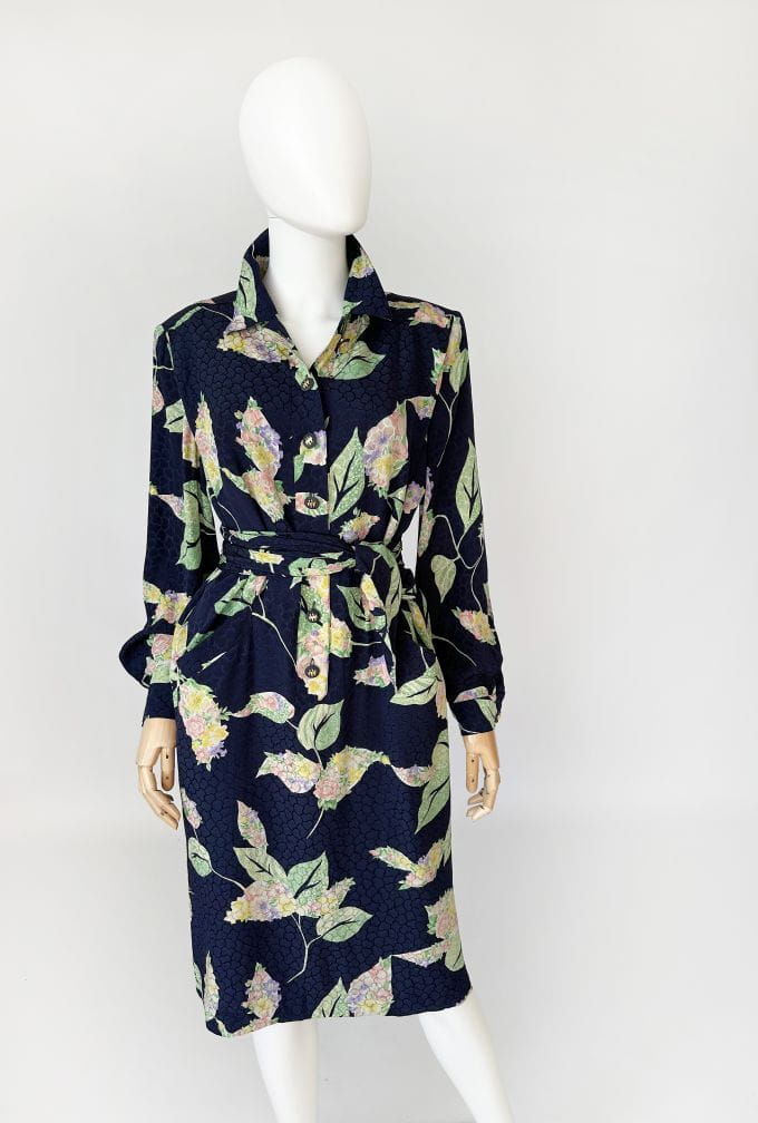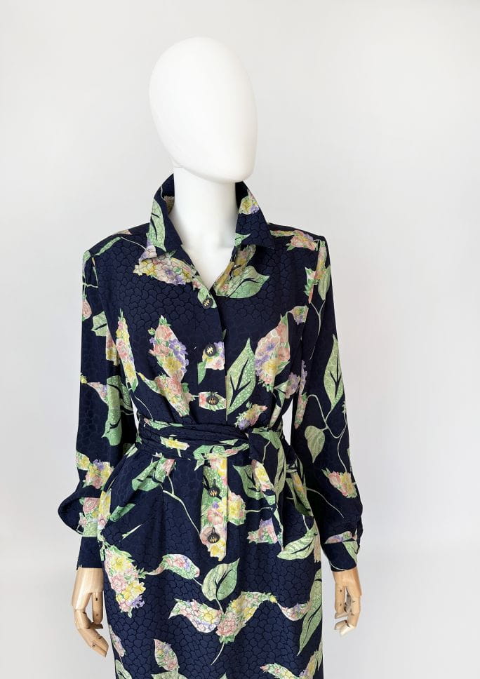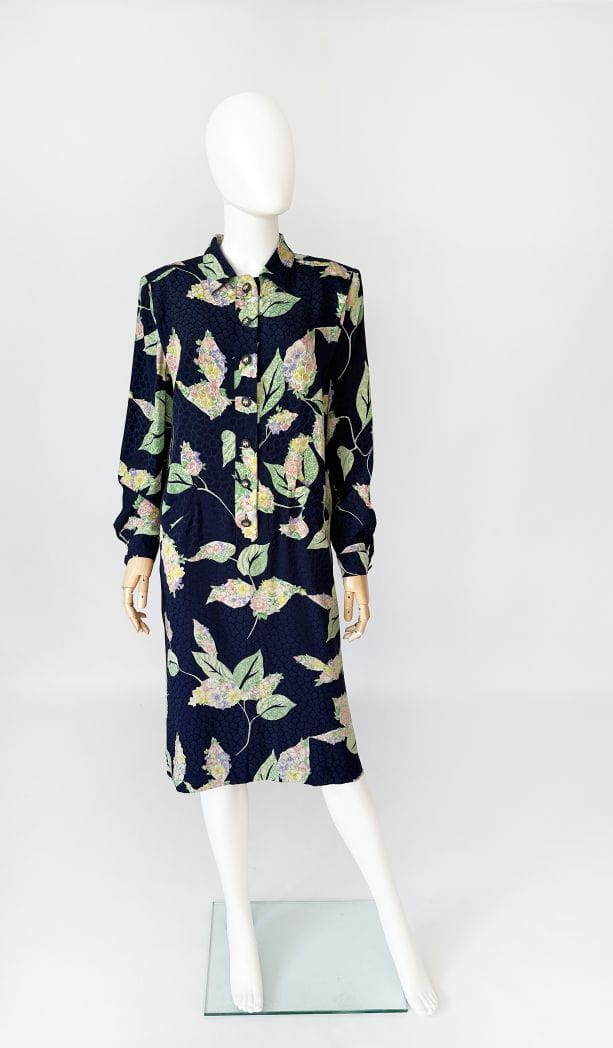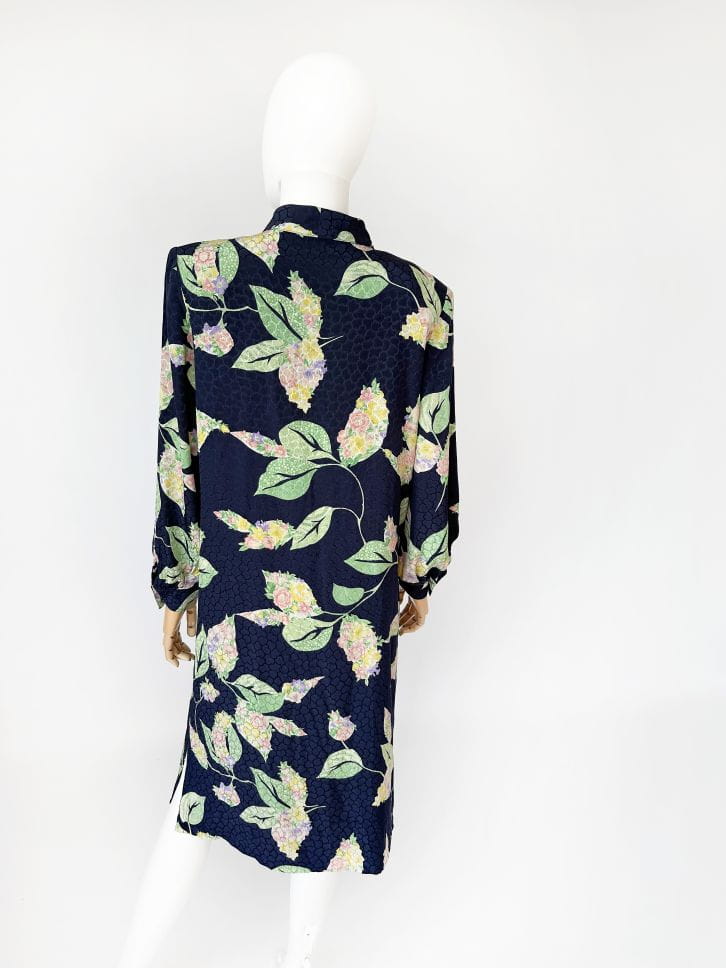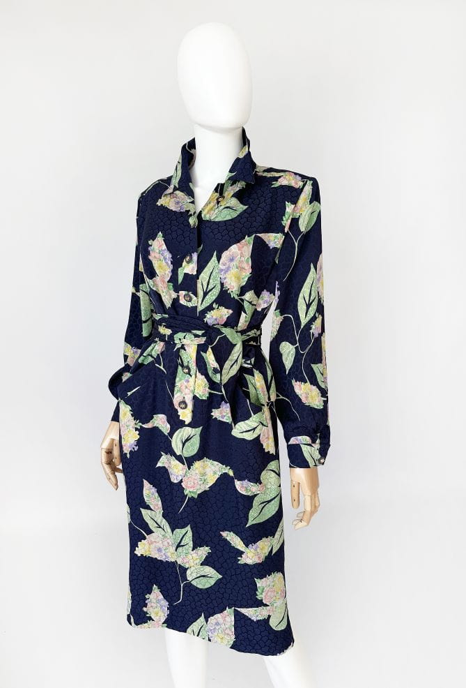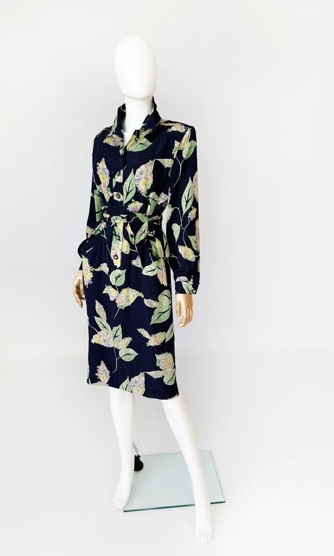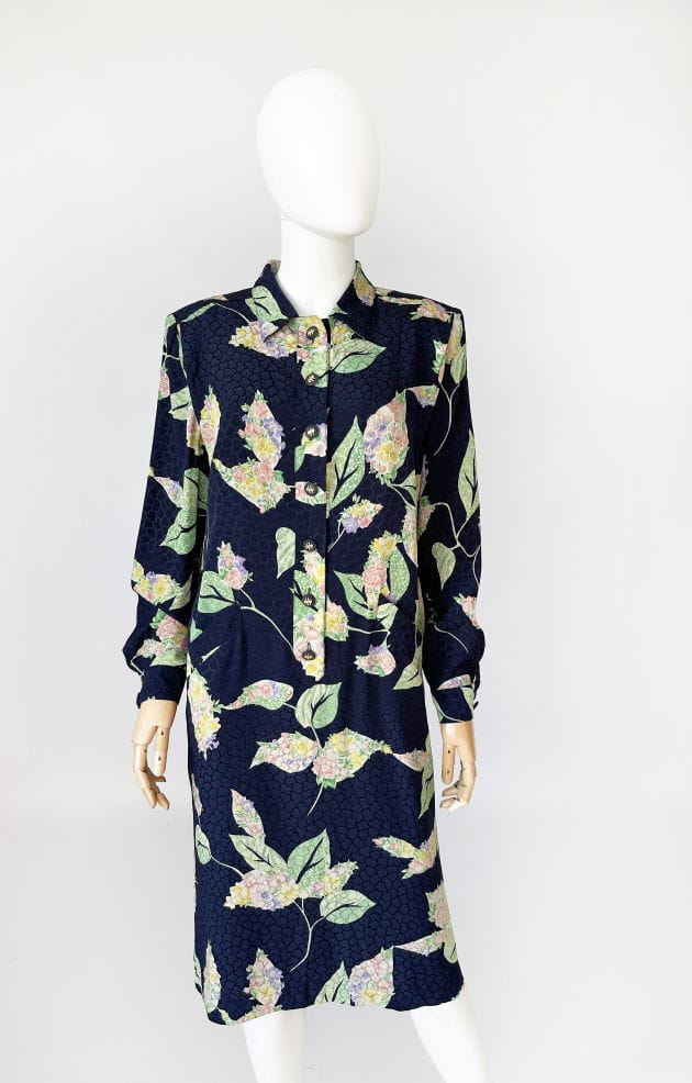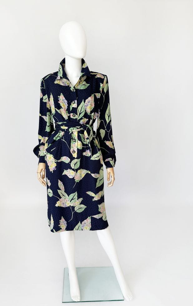 Francuska sukienka vintage z lat 80-tych. Uszyta z jedwabnej tkaniny w delikatne, kwiatowo - liściaste wzory na granatowym tle. Prosty fason o długości midi. W komplecie szarfa, którą można przewiązać w talii. Koszulowa rozpinana góra z długimi rękawami i kołnierzykiem. W ramionach poduszki w stylu 80's. Na wysokości bioder nieduże kieszenie. Od wewnątrz na podszewce.
