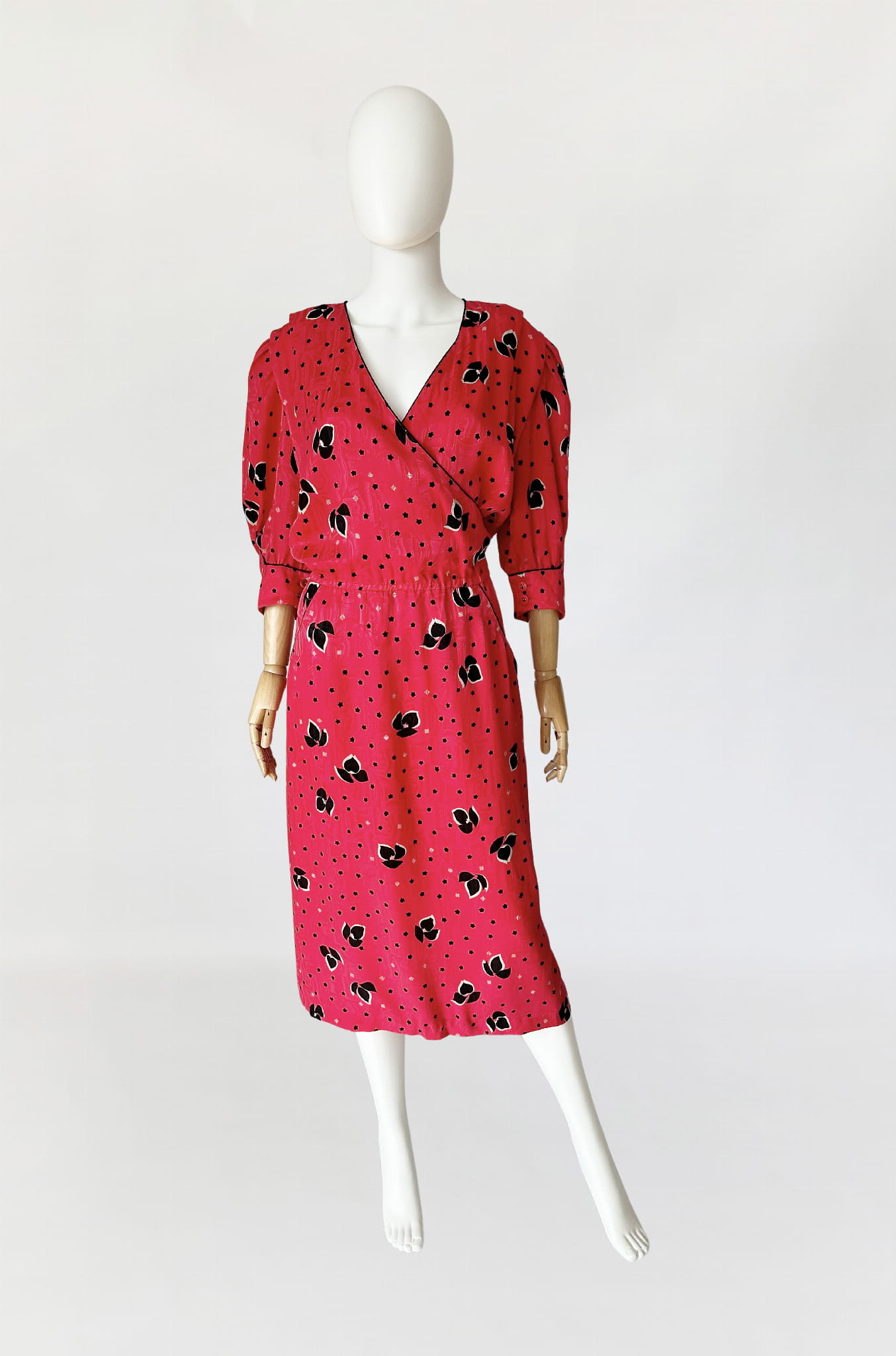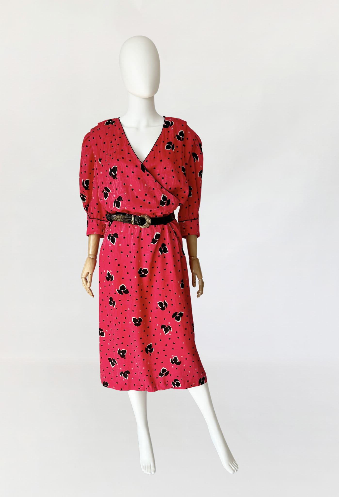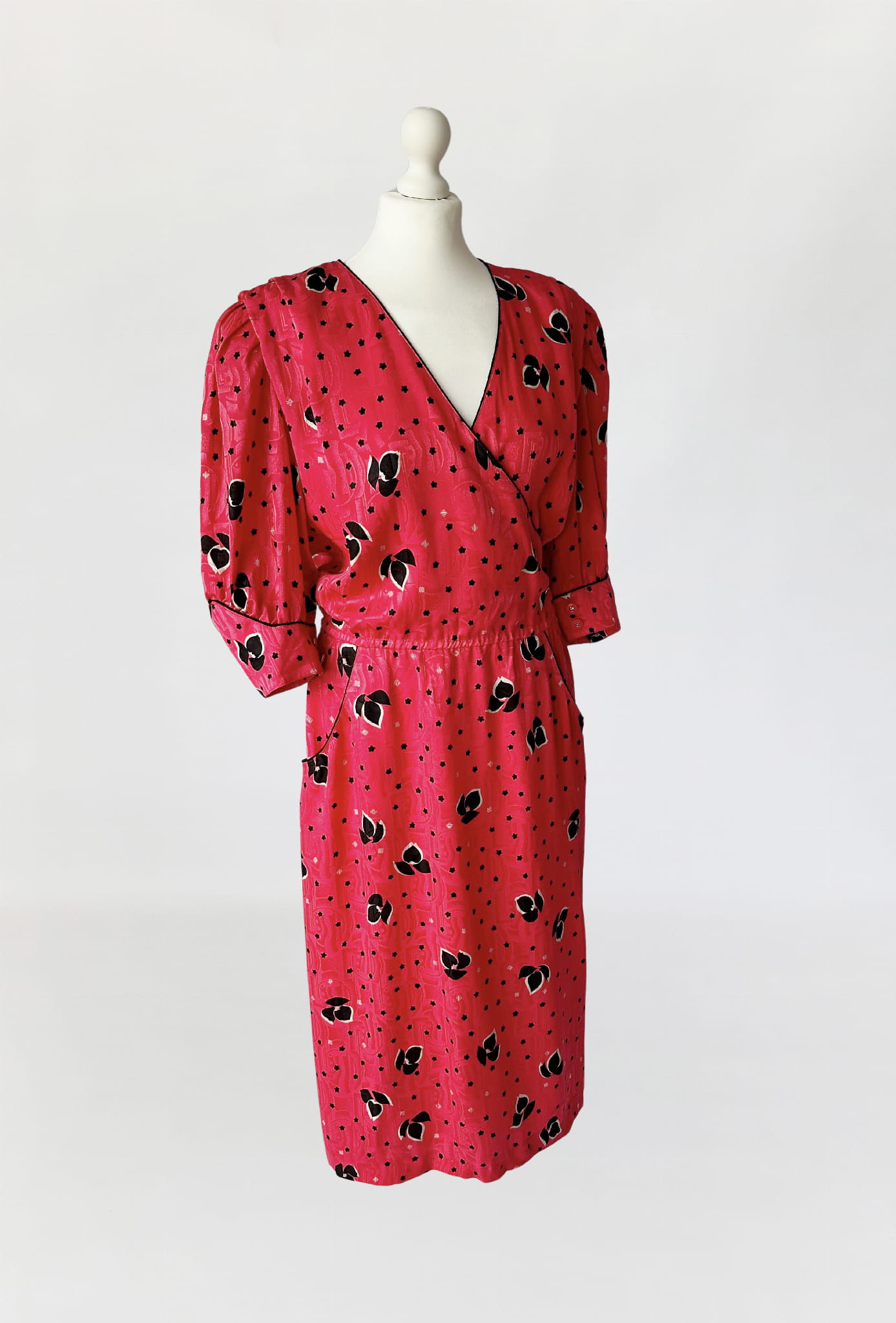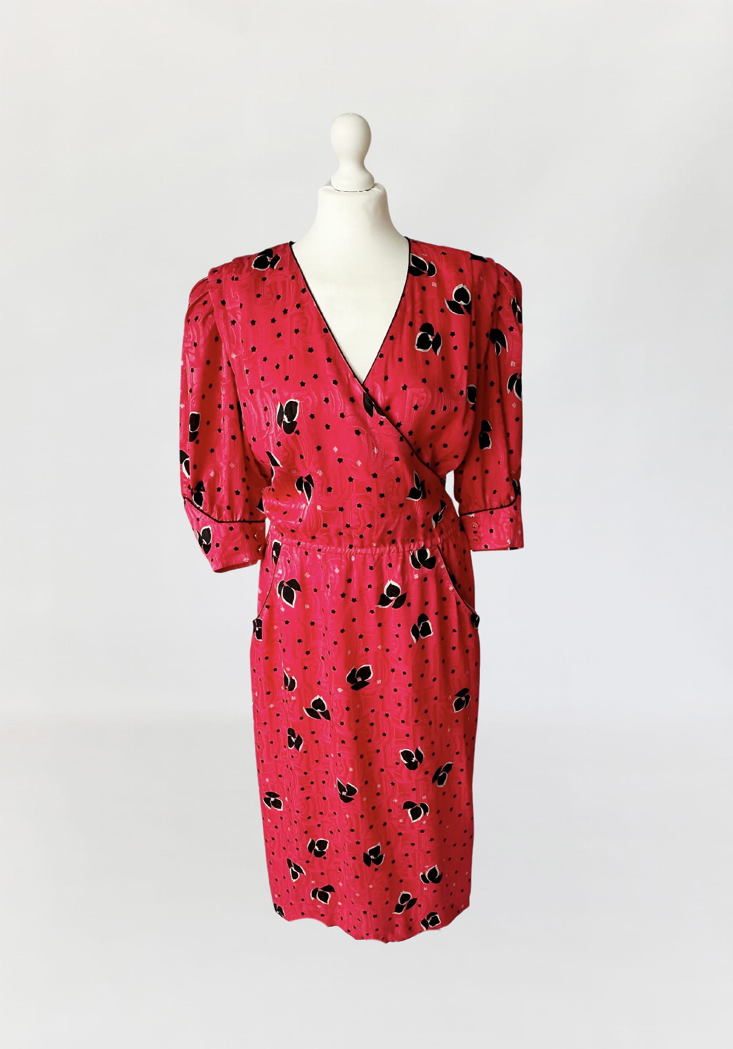 Rzadkie znalezisko z lat 80-tych marki Werner Graumann. Sukienka midi wykonana w całości z naturalnego jedwabiu w drobne regularne wzory. Góra z krótkimi rękawami zapinanymi na guziki na końcu. W ramionach zaszewki, w oryginale były tam również poduszki. Kopertowy dekolt, w pasie na gumce. Spódnica o klasycznym, prostym fasonie z kieszeniami na wysokości bioder.