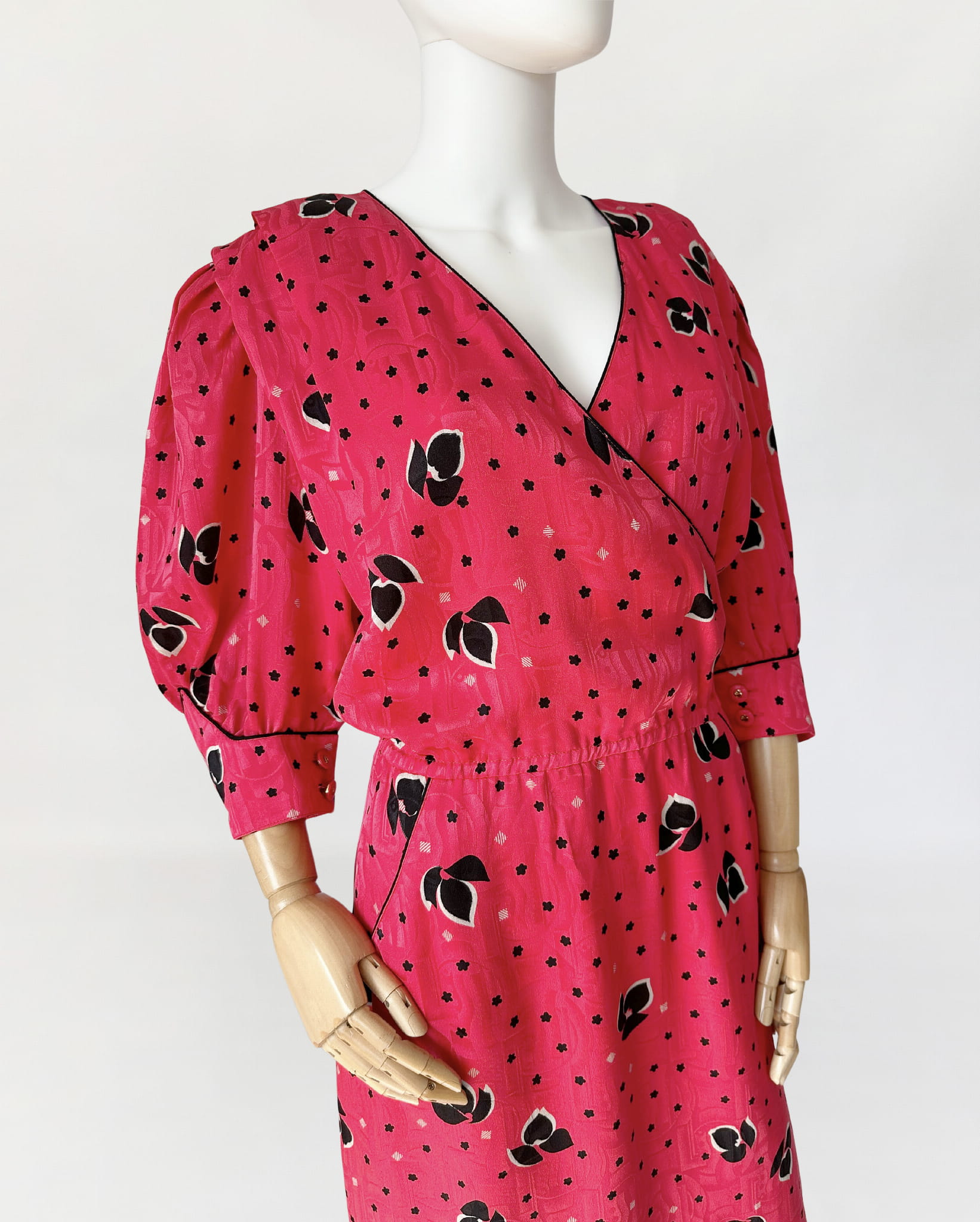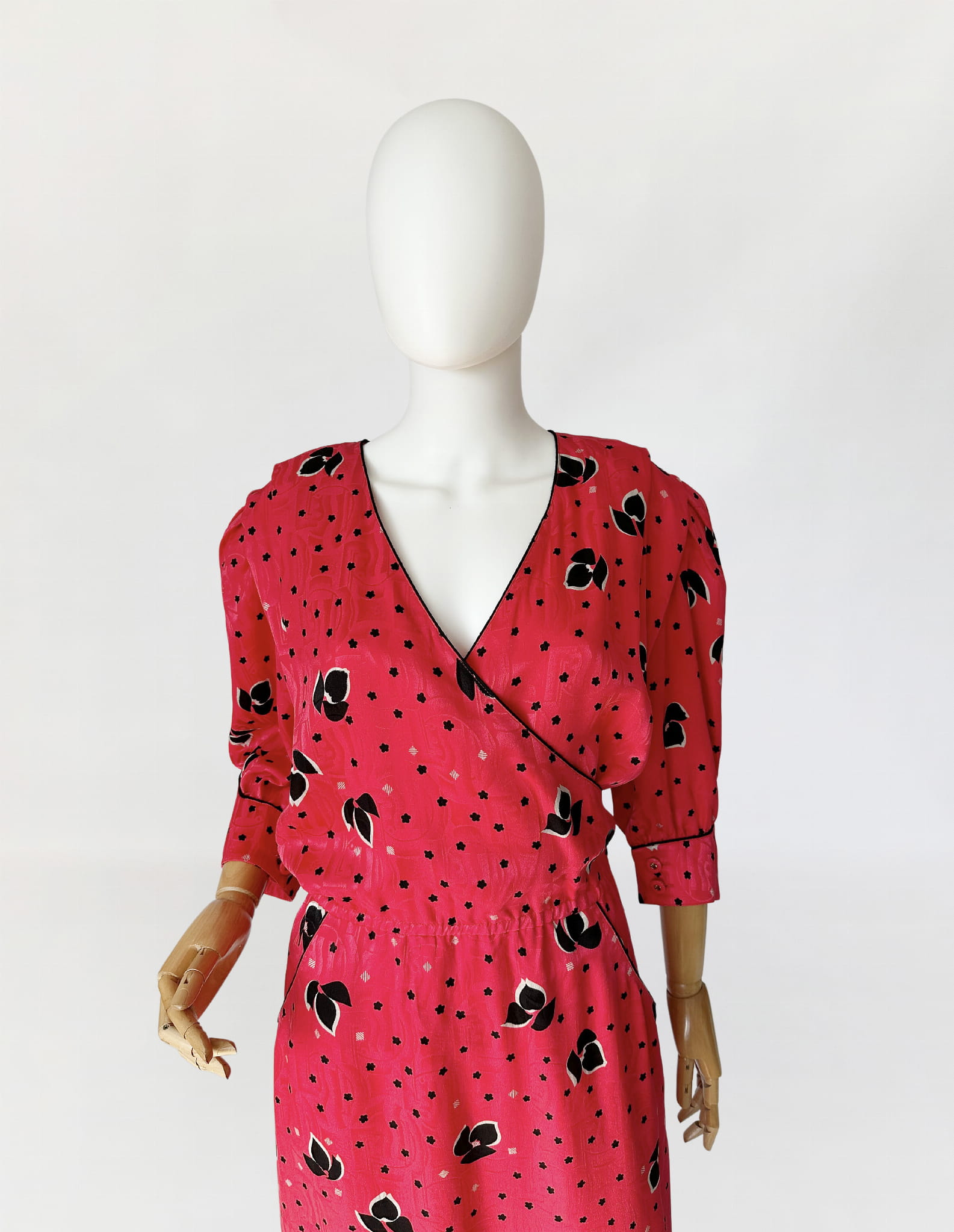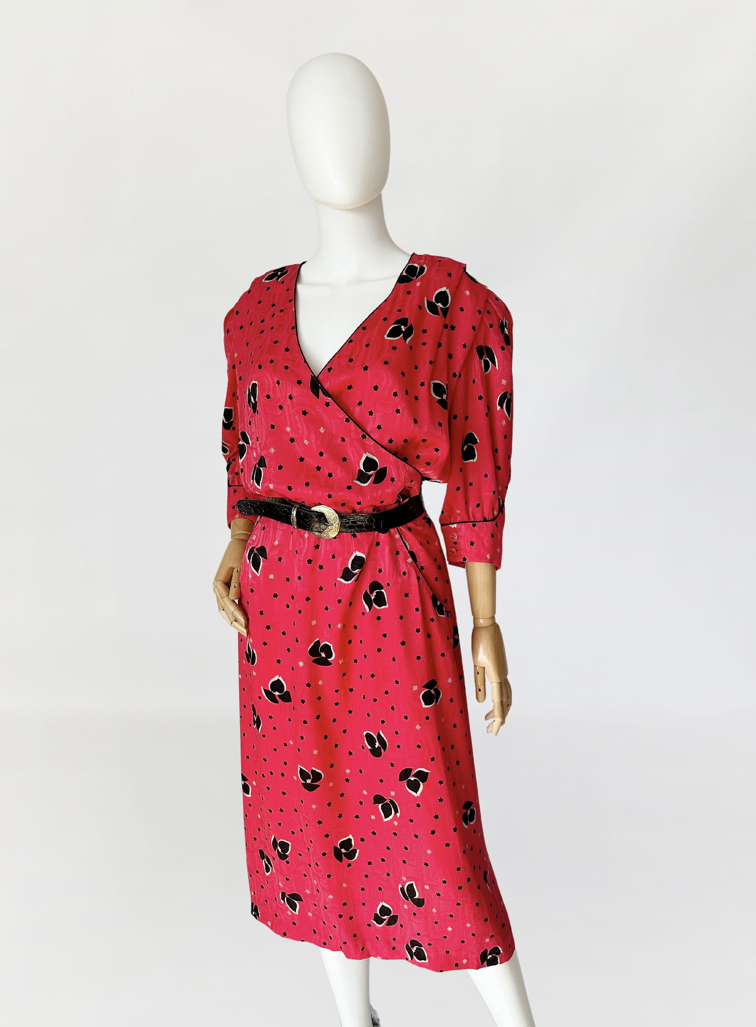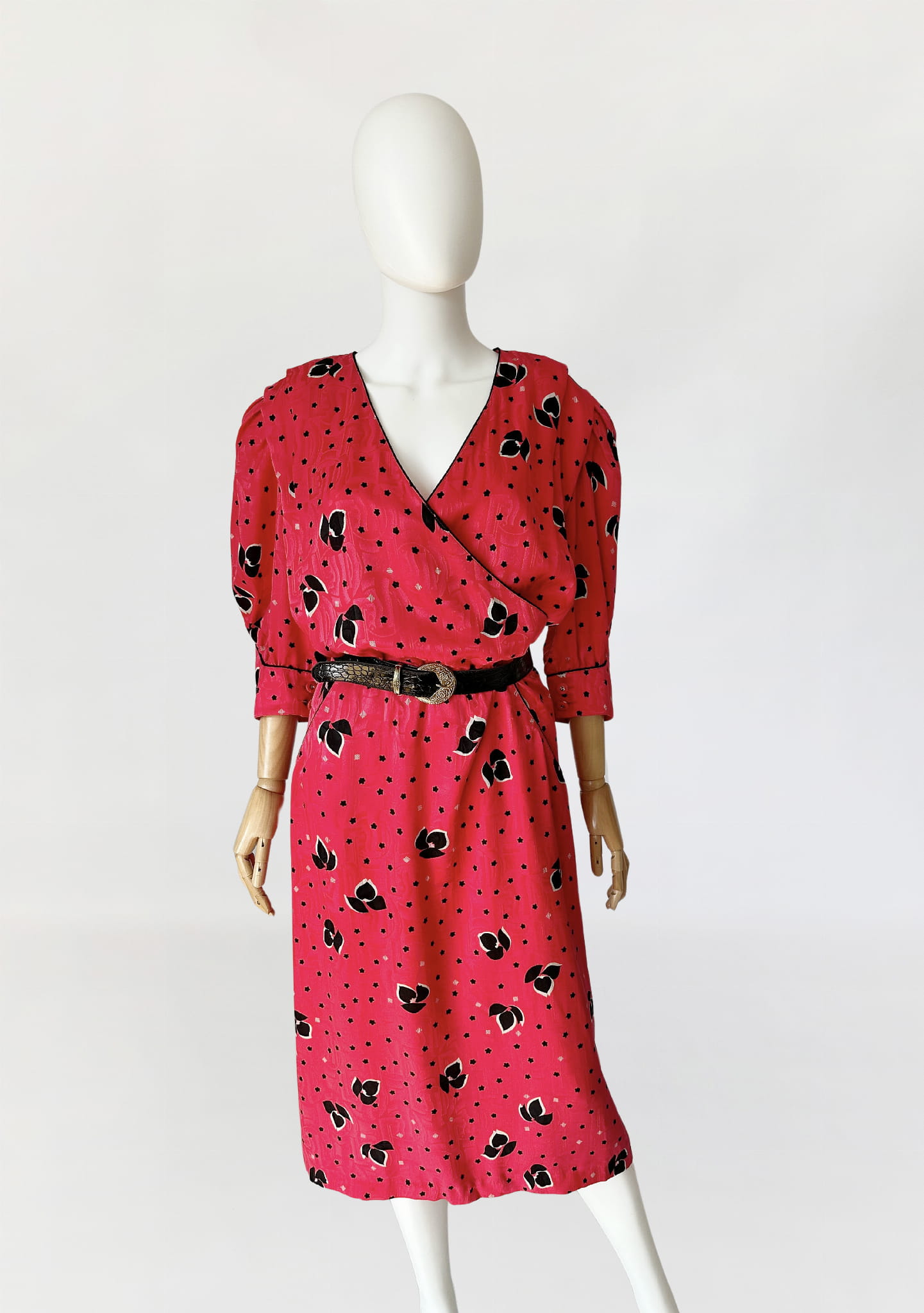 Rzadkie znalezisko z lat 80-tych marki Werner Graumann. Sukienka midi wykonana w całości z naturalnego jedwabiu w drobne regularne wzory. Góra z krótkimi rękawami zapinanymi na guziki na końcu. W ramionach zaszewki, w oryginale były tam również poduszki. Kopertowy dekolt, w pasie na gumce. Spódnica o klasycznym, prostym fasonie z kieszeniami na wysokości bioder.
