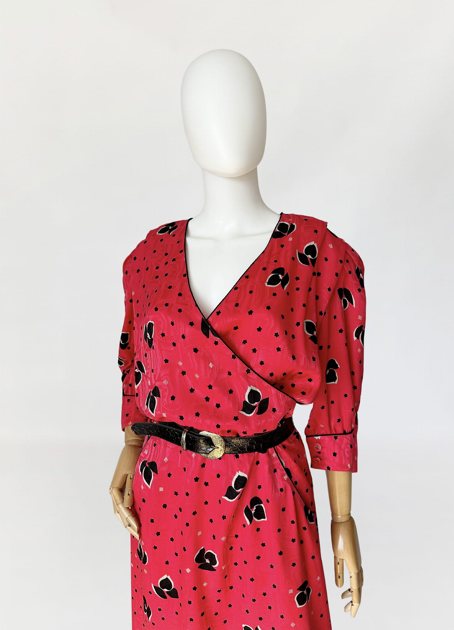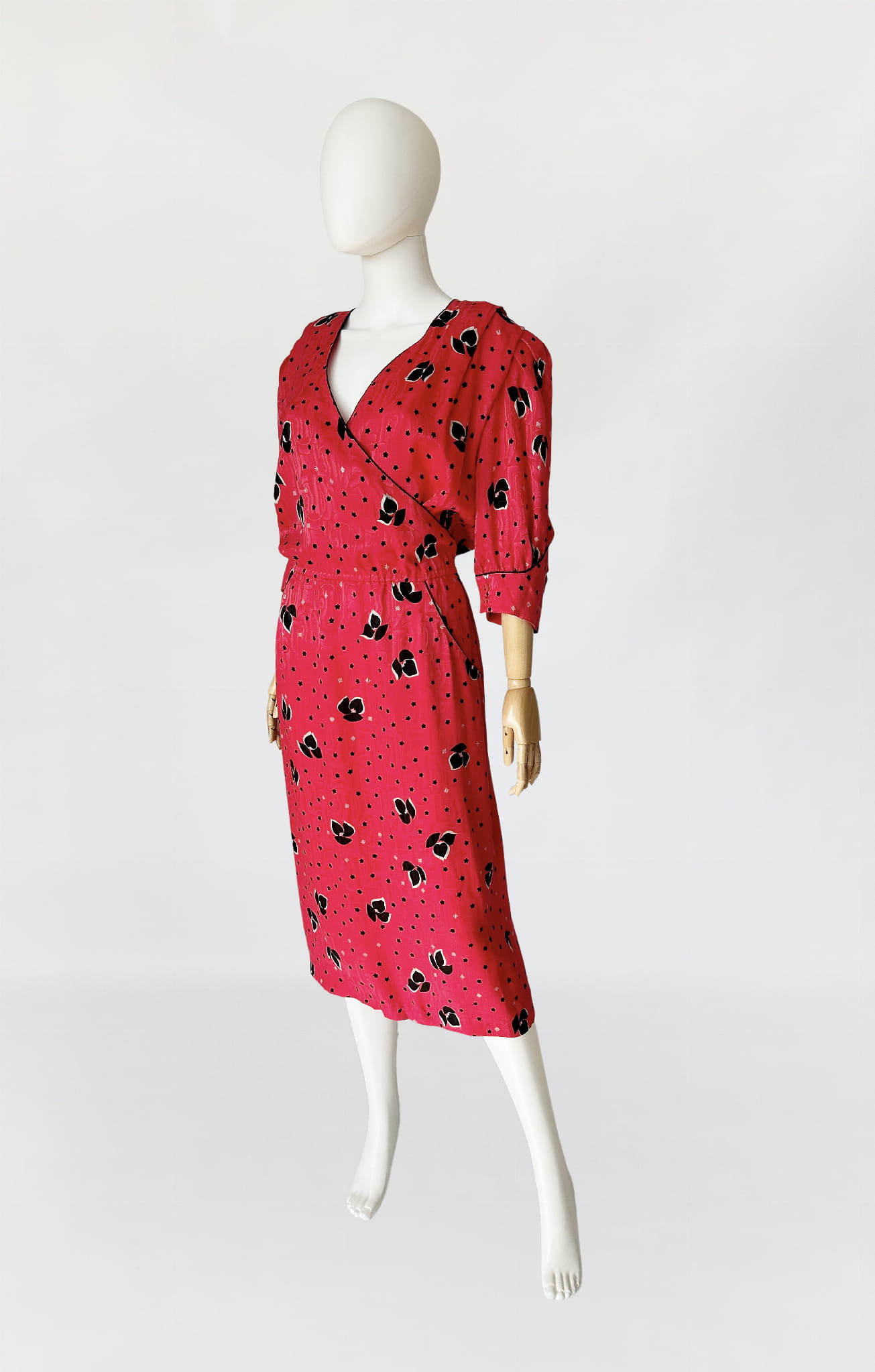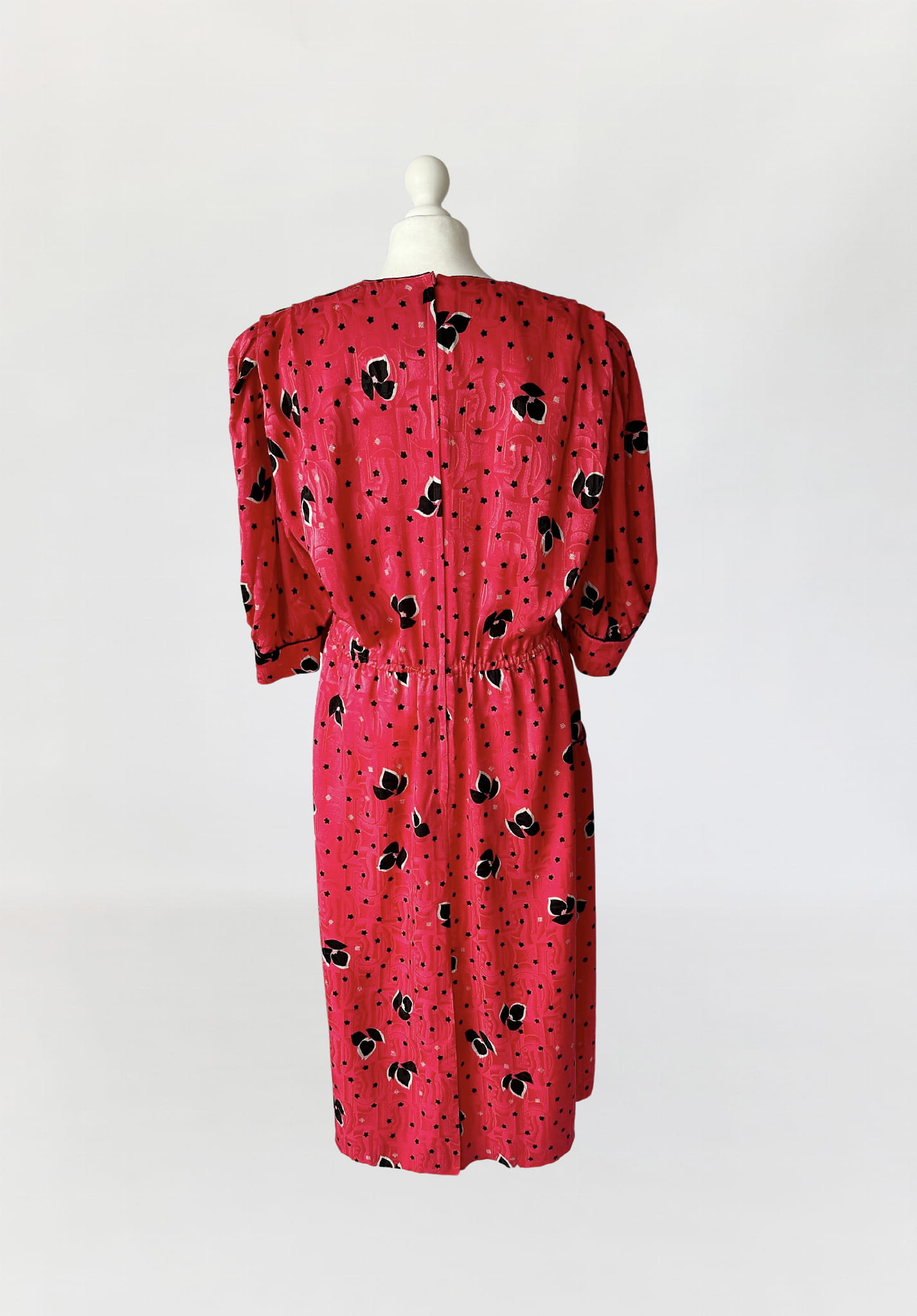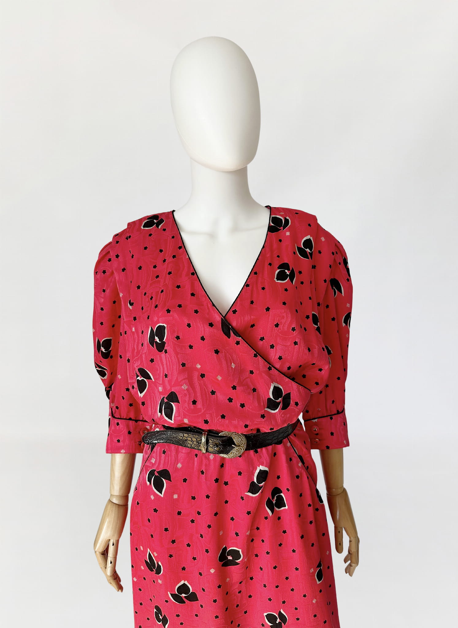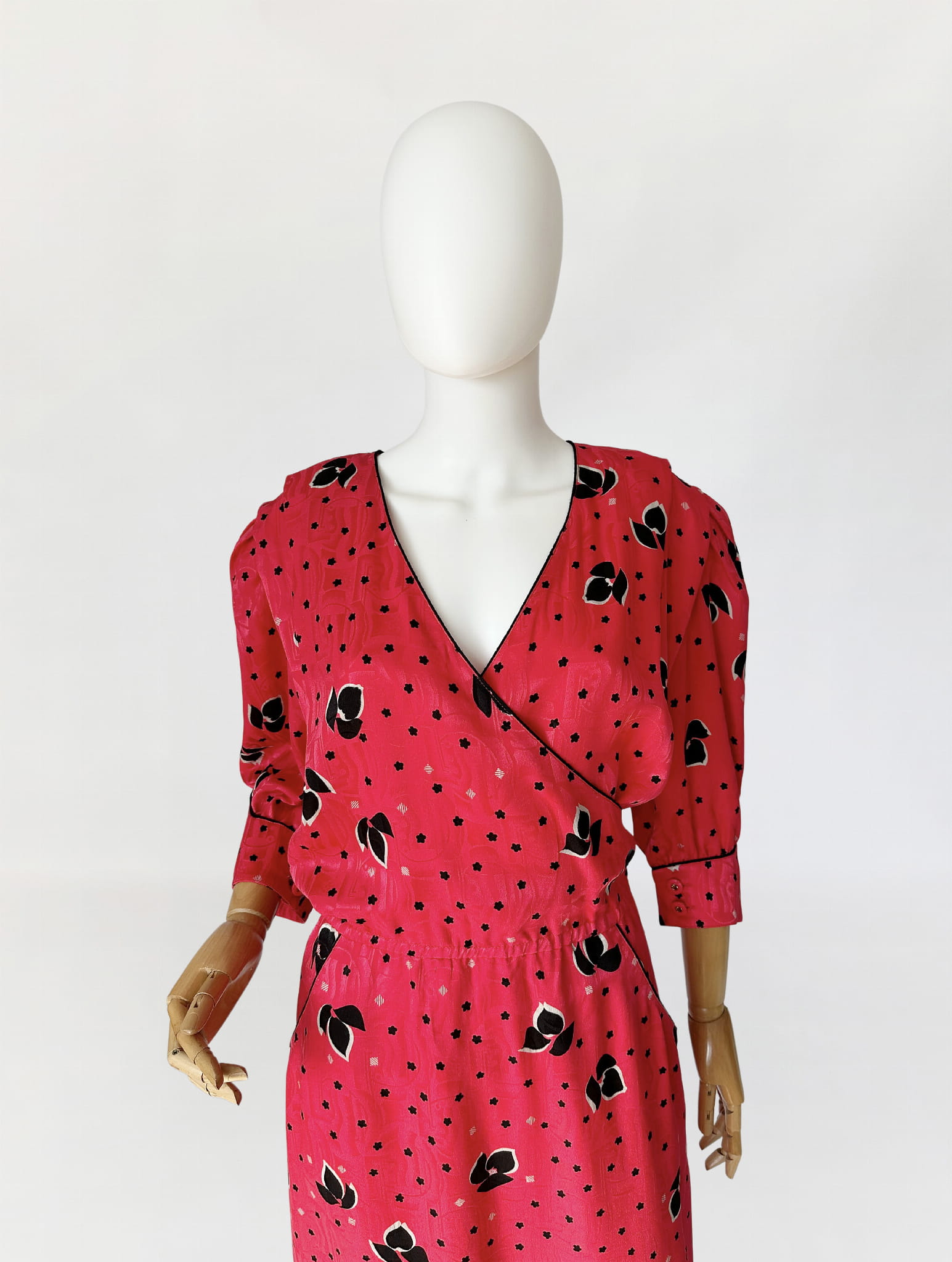 Rzadkie znalezisko z lat 80-tych marki Werner Graumann. Sukienka midi wykonana w całości z naturalnego jedwabiu w drobne regularne wzory. Góra z krótkimi rękawami zapinanymi na guziki na końcu. W ramionach zaszewki, w oryginale były tam również poduszki. Kopertowy dekolt, w pasie na gumce. Spódnica o klasycznym, prostym fasonie z kieszeniami na wysokości bioder.