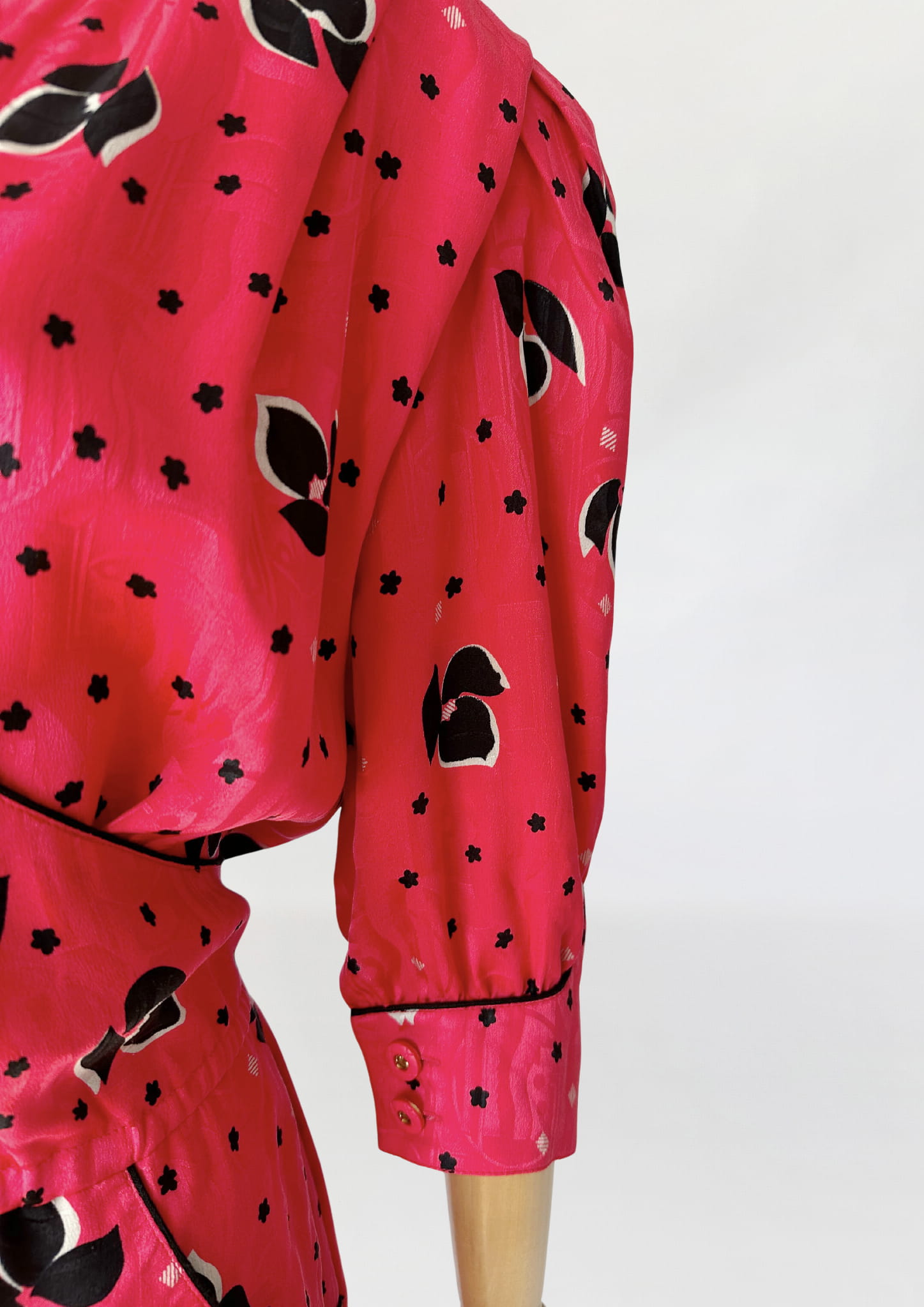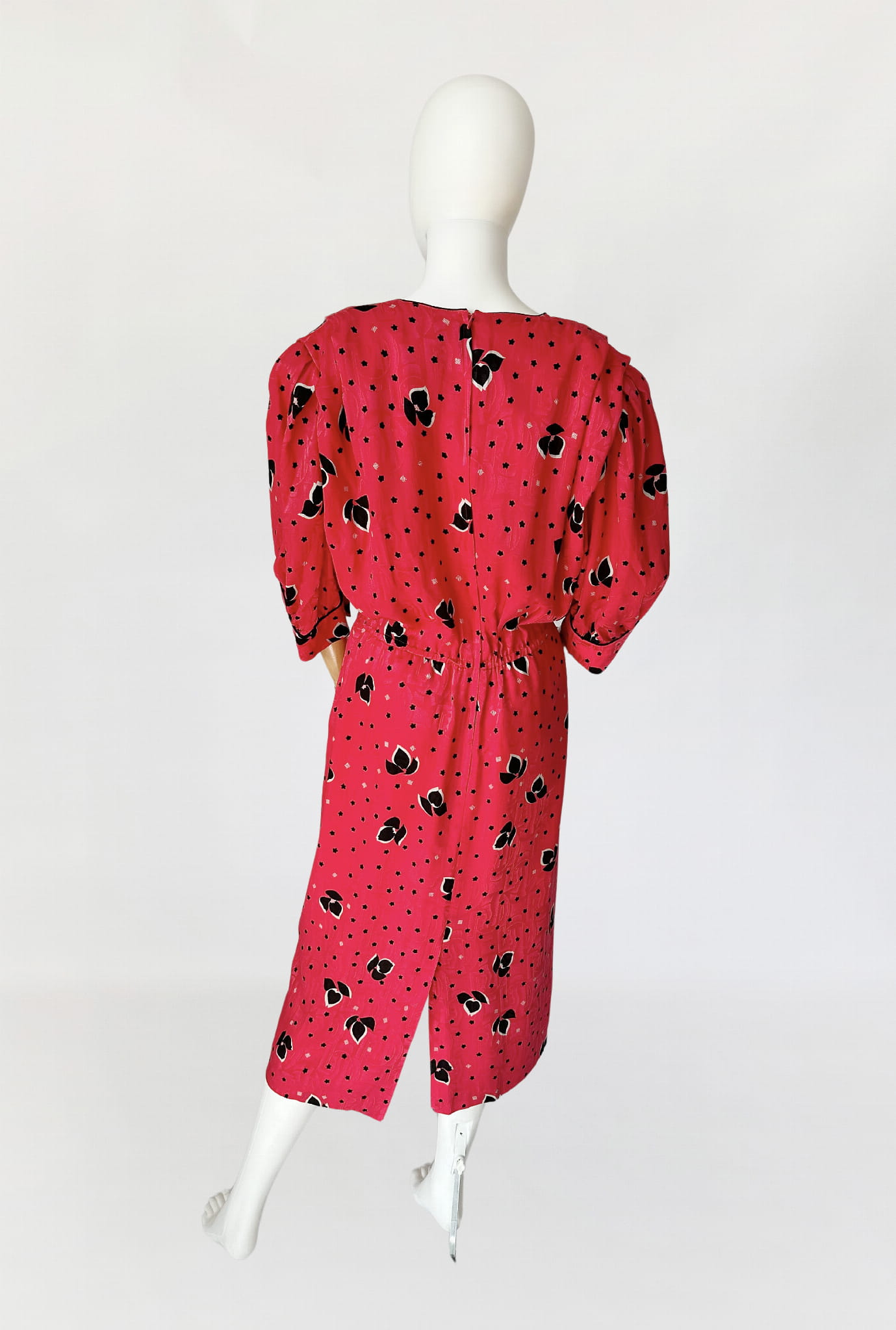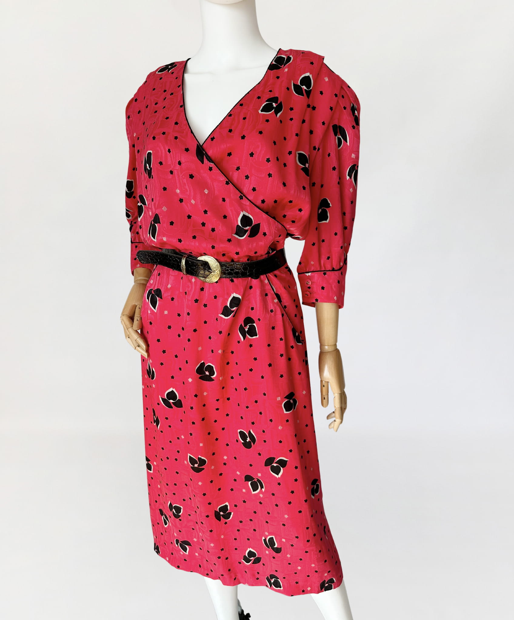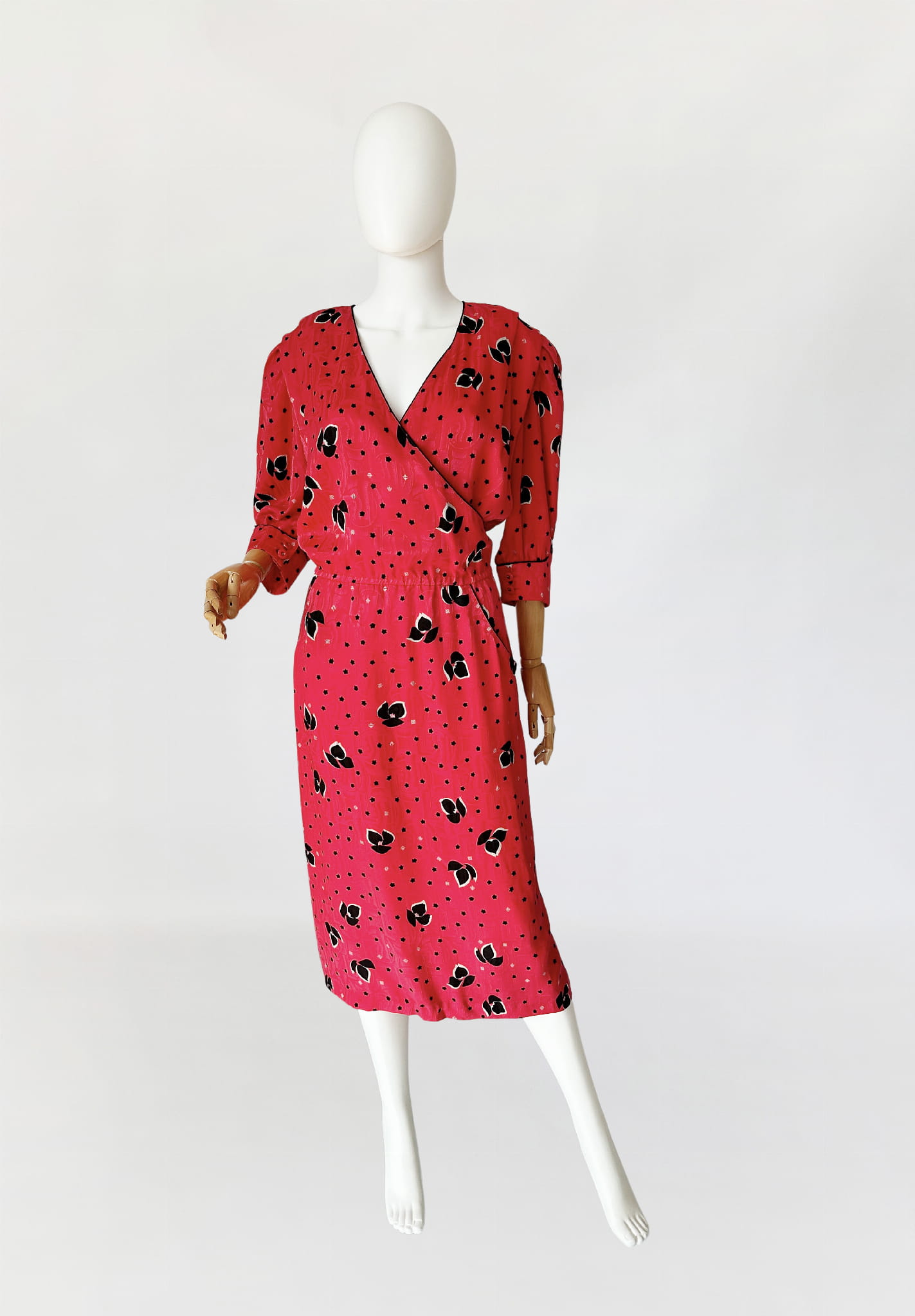 Rzadkie znalezisko z lat 80-tych marki Werner Graumann. Sukienka midi wykonana w całości z naturalnego jedwabiu w drobne regularne wzory. Góra z krótkimi rękawami zapinanymi na guziki na końcu. W ramionach zaszewki, w oryginale były tam również poduszki. Kopertowy dekolt, w pasie na gumce. Spódnica o klasycznym, prostym fasonie z kieszeniami na wysokości bioder.