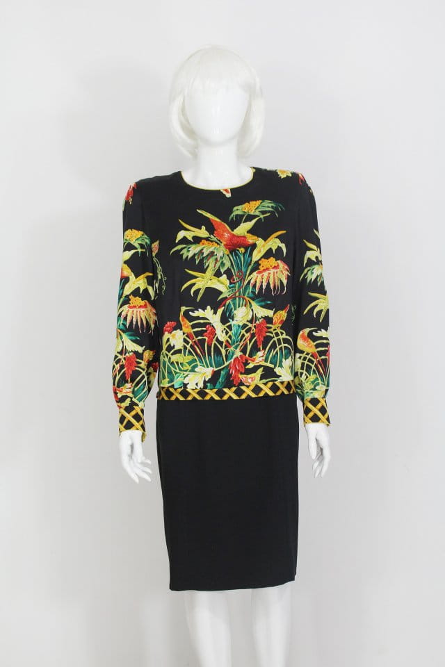Unikatowa sukienka vintage wykonana z naturalnego jedwabiu. Góra w efektowne barwne printy: kwiaty, ptaki. Dół gładki, czarny. Rękawy długie, w ramionach poduszki (do ewentualnego bezproblemowego odprucia).