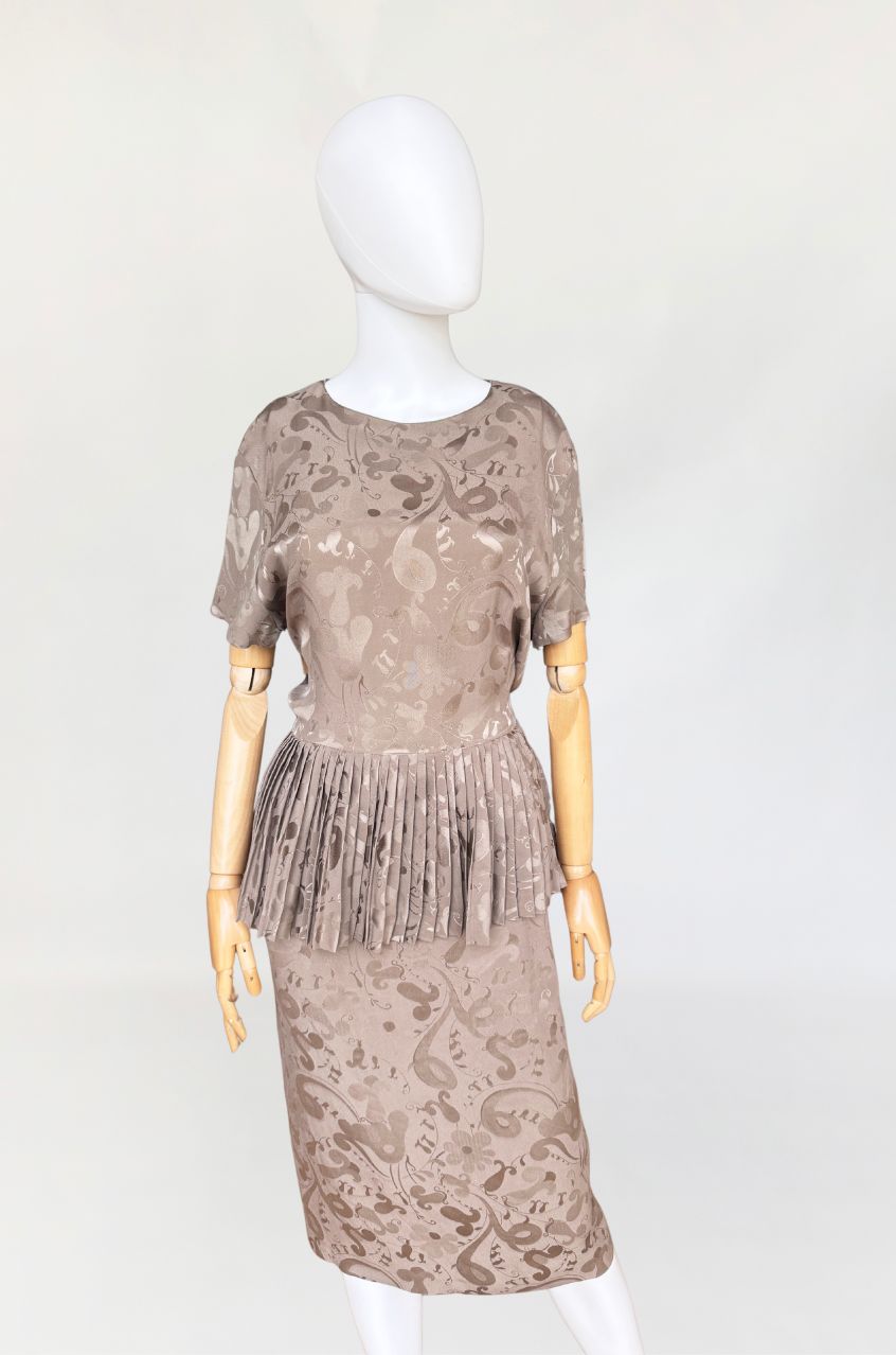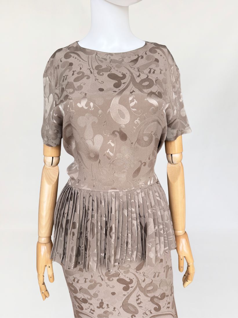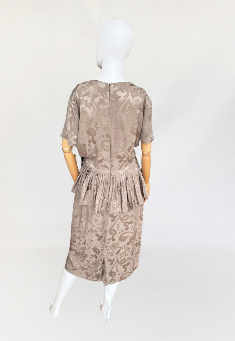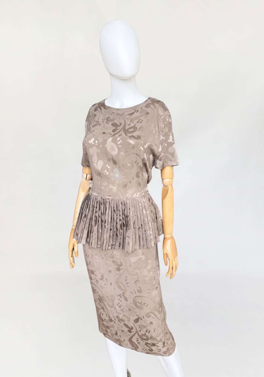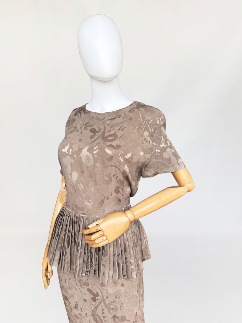 Włoska sukienka vintage z lat 80-tych wykonana z wysokogatunkowej jedwabnej tkaniny w odcieniu taupe, zdobionej subtelnym, satynowym wzorem. Charakterystycznym elementem konstrukcyjnym jest efektowna, szeroka baskinka z gęstymi plisowaniami, umieszczona na wysokości talii, która dodaje formie architektonicznej wyrazistości. Góra z krótkimi rękawami i okrągłym dekoltem. Spódnica o prostym, klasycznym kroju. Model bez podszewki.