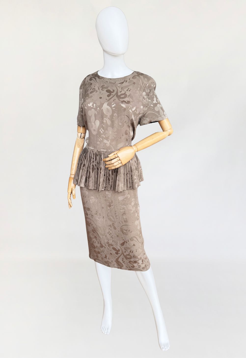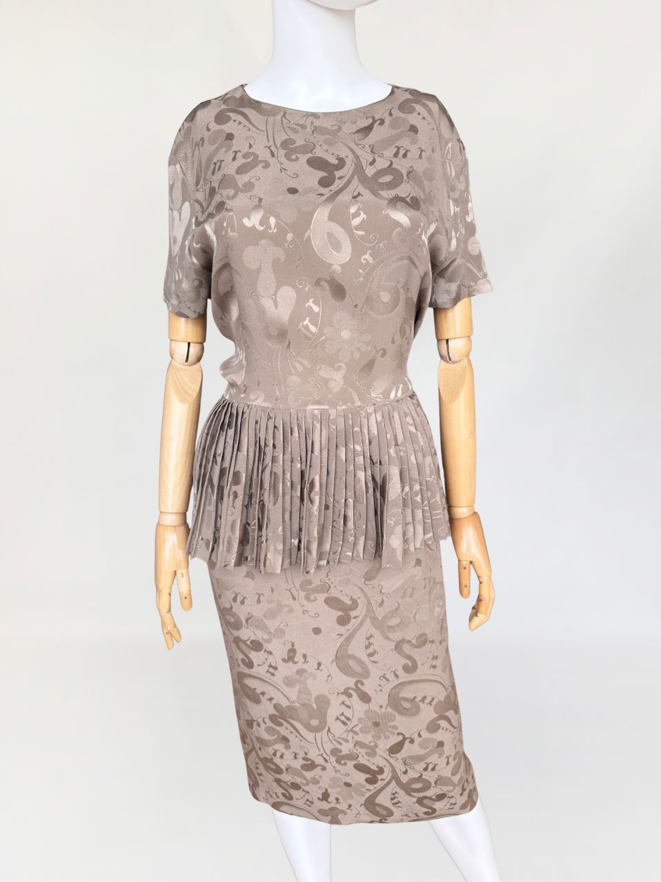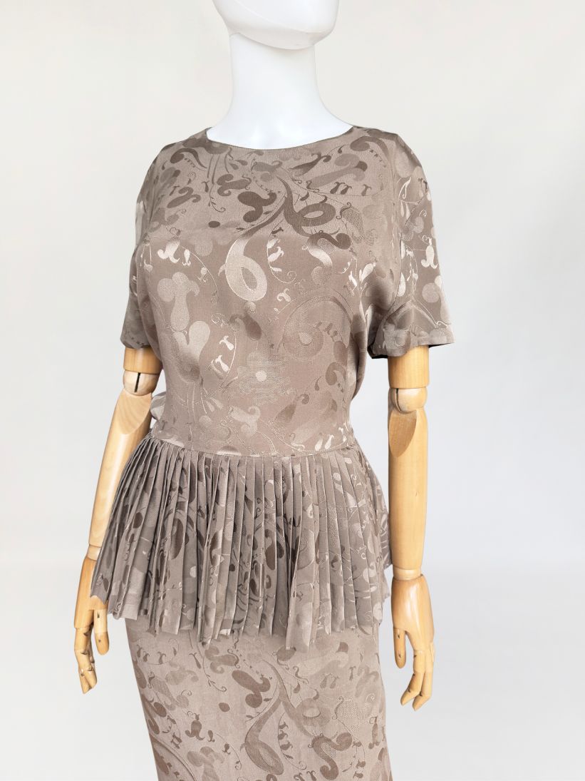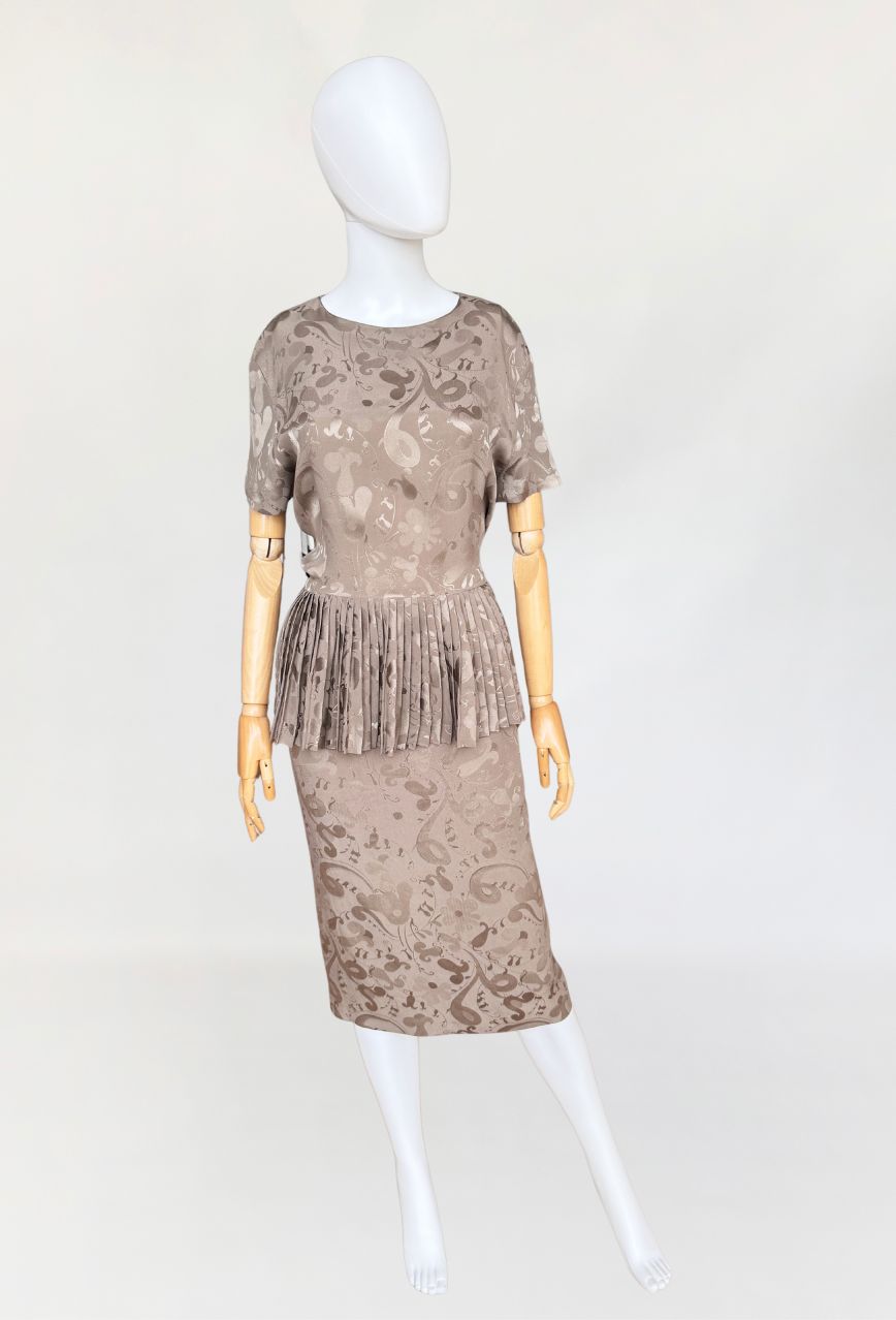 Włoska sukienka vintage z lat 80-tych wykonana z wysokogatunkowej jedwabnej tkaniny w odcieniu taupe, zdobionej subtelnym, satynowym wzorem. Charakterystycznym elementem konstrukcyjnym jest efektowna, szeroka baskinka z gęstymi plisowaniami, umieszczona na wysokości talii, która dodaje formie architektonicznej wyrazistości. Góra z krótkimi rękawami i okrągłym dekoltem. Spódnica o prostym, klasycznym kroju. Model bez podszewki.