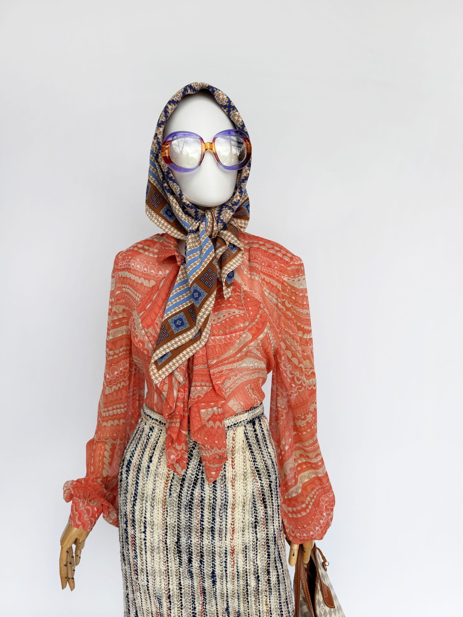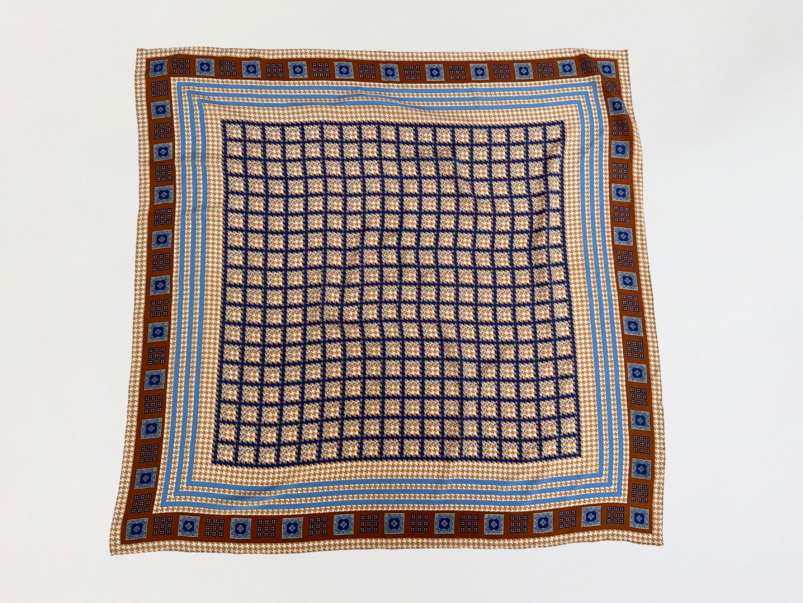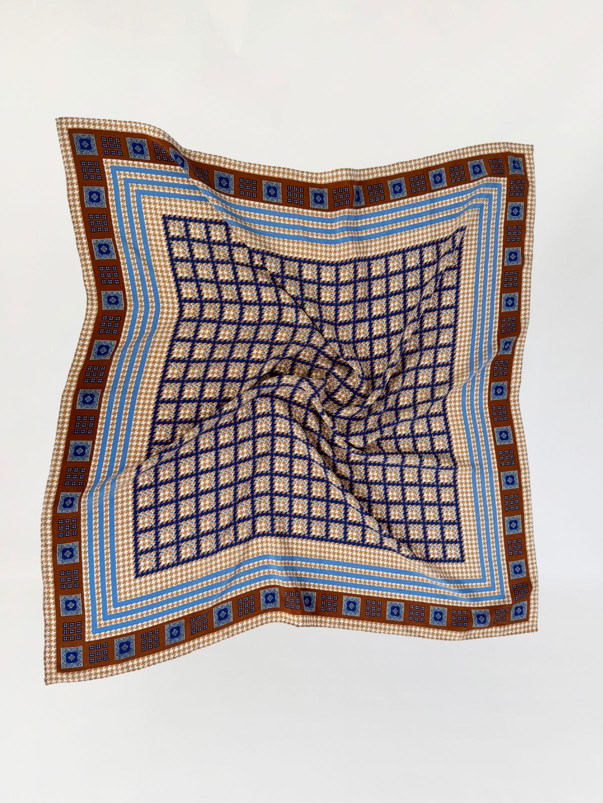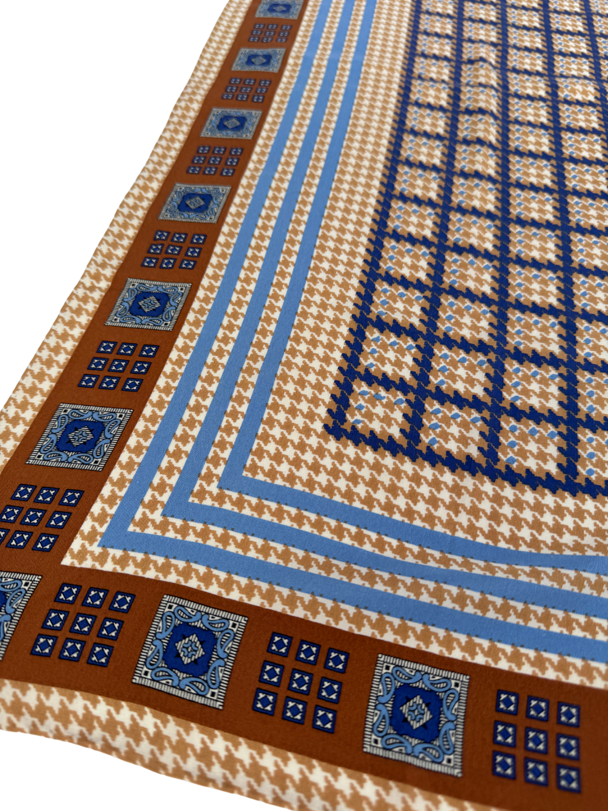 Duża apaszka/chusta wykonana z lekkiego jedwabnego szyfonu. Powierzchnia tkaniny pokryta drobnym, rytmicznym wzorem z dominującym motywem pepitki, utrzymana w harmonijnej palecie kolorystycznej: ceglastym, błękicie, granacie i beżach. Brzegi ręcznie rolowane i podszywane. Uniwersalny format – odpowiedni zarówno jako apaszka, jak i ozdobna chusta.