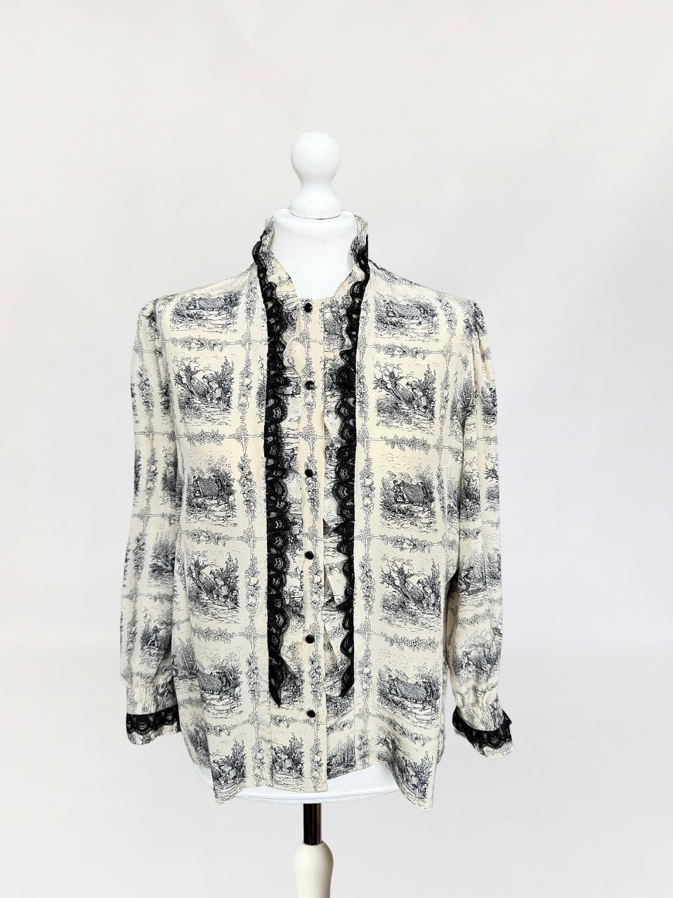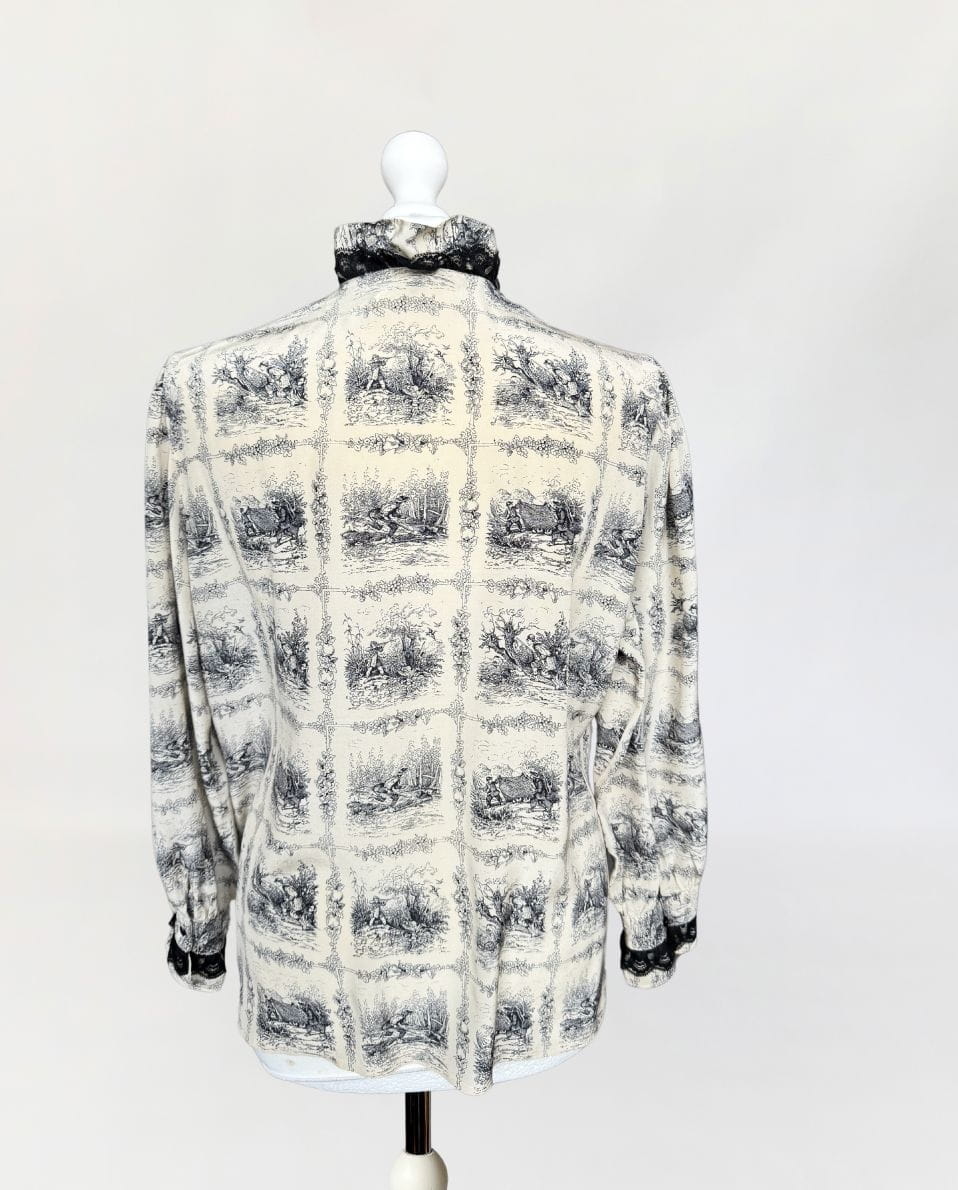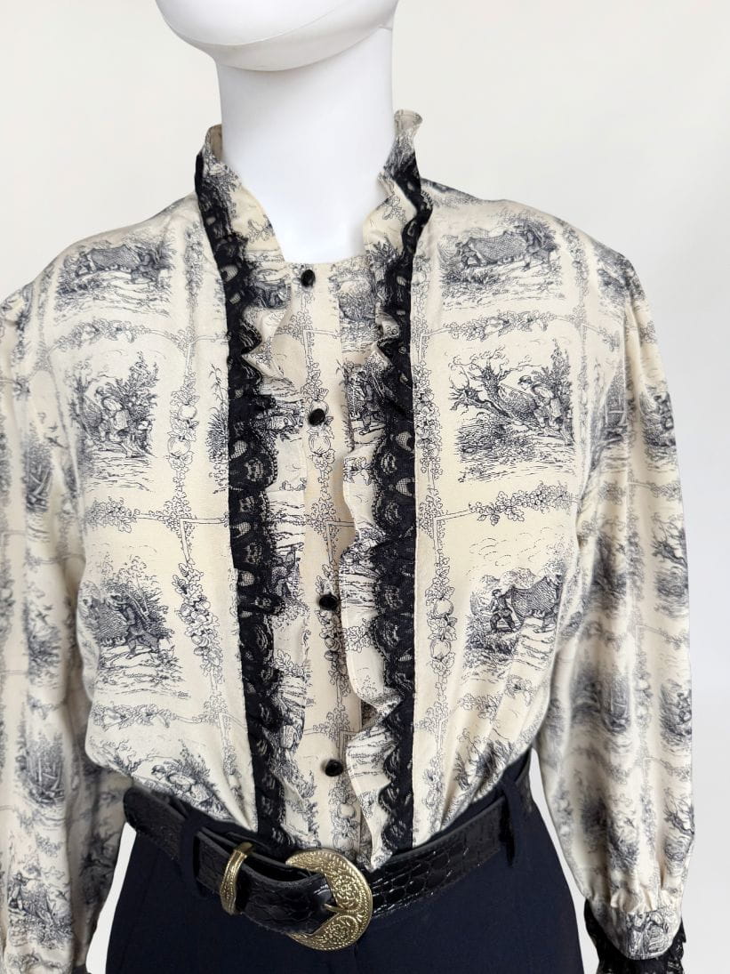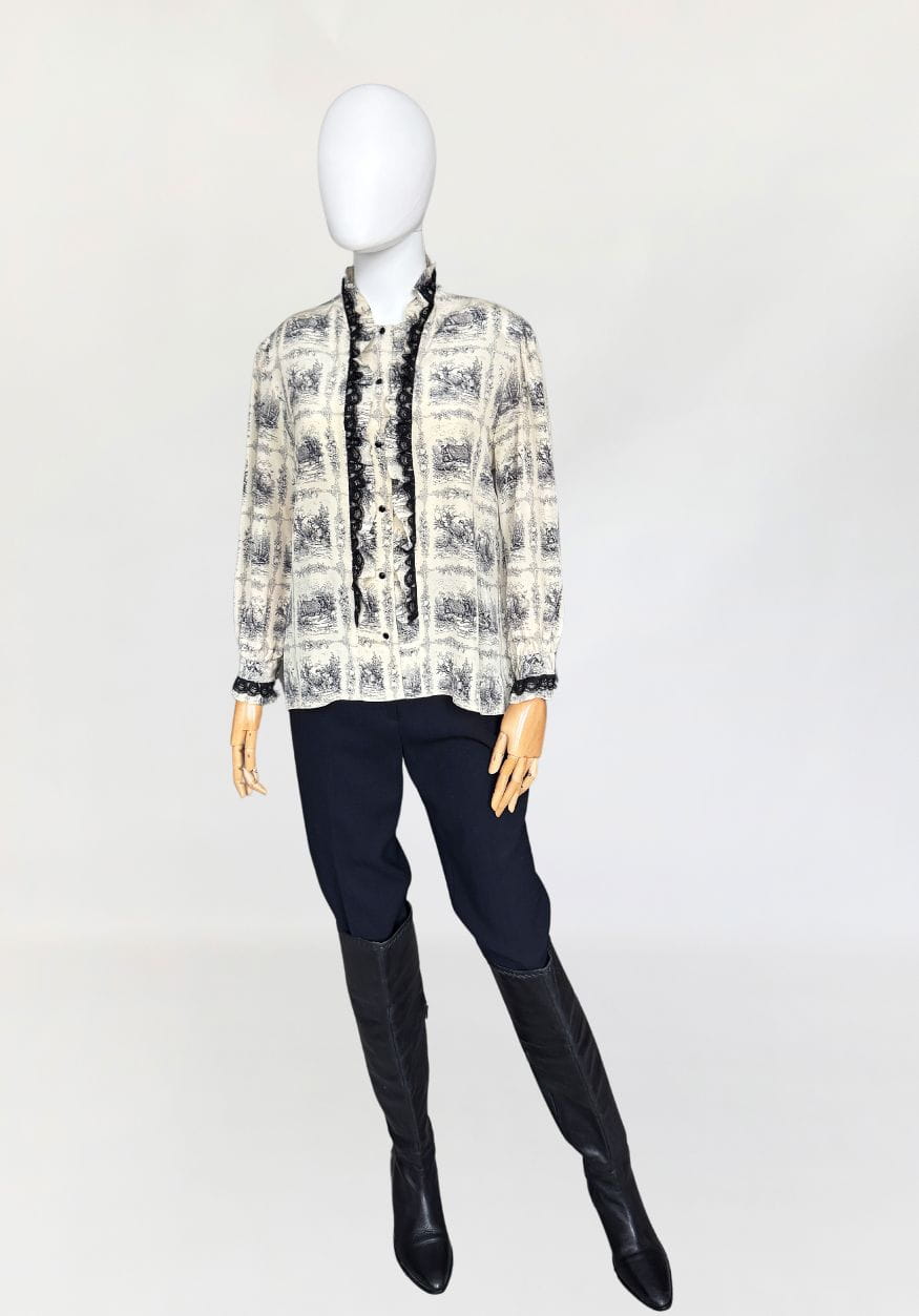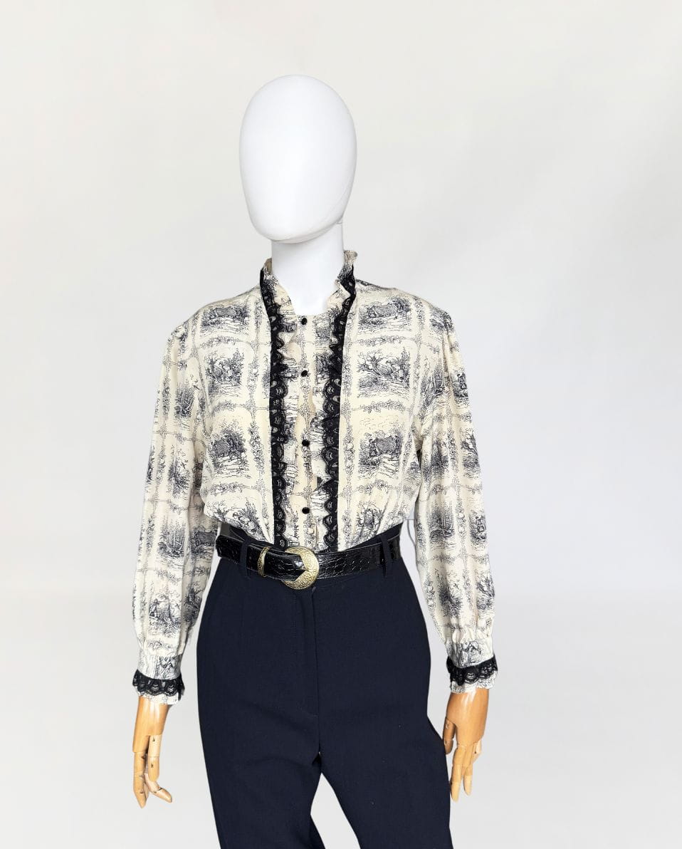 Unikatowa włoska koszula vintage. Wykonana z jedwabnego szyfonu o przepięknym wzornictwie w szkicowane scenki łowieckie/myśliwskie. Swobodny fason z długimi rękawami. Zapinana na drobne guziki. Równolegle do linii zapięcia obustronne drapowane falbanki z jedwabiu i czarnej koronki.