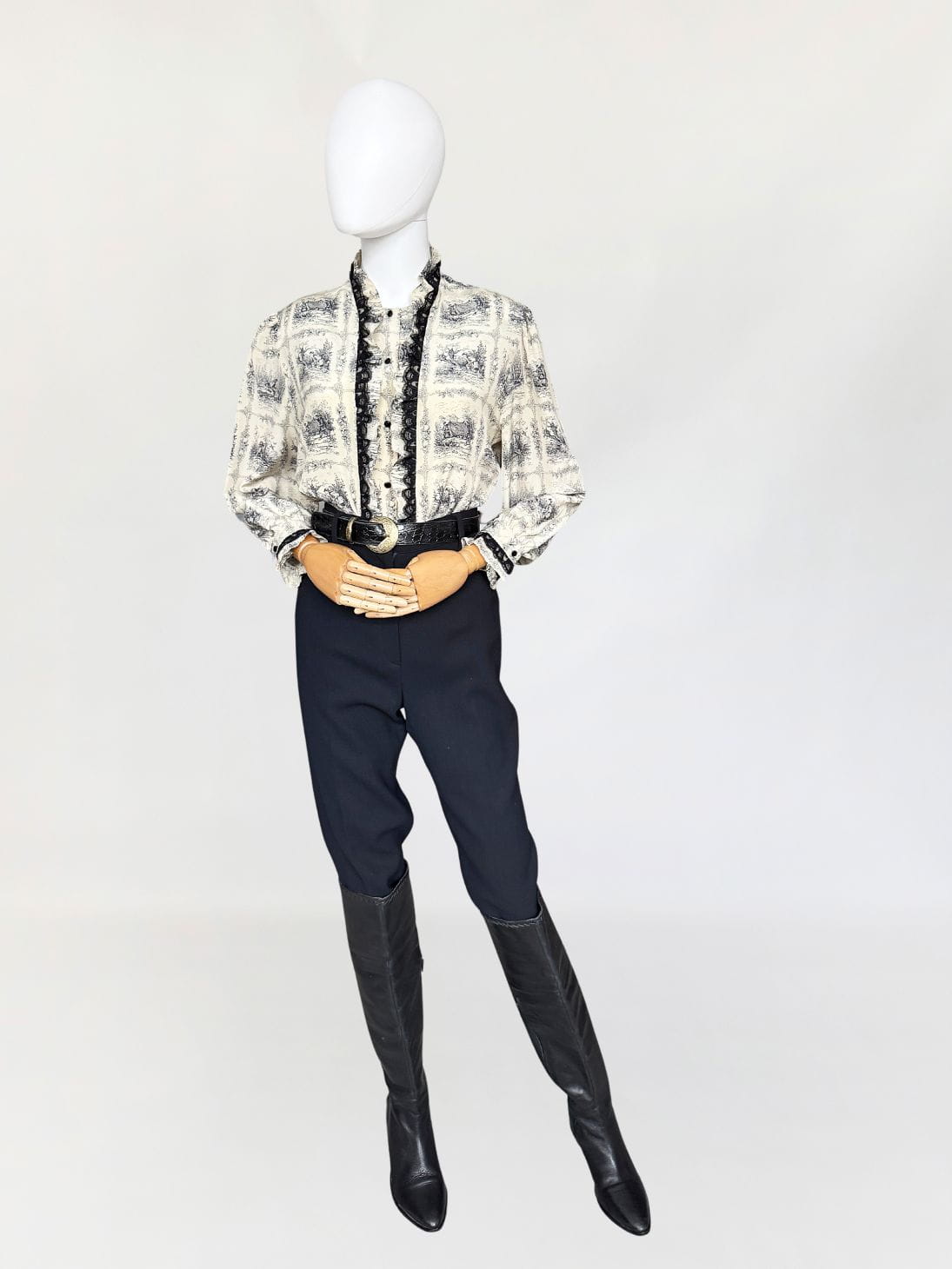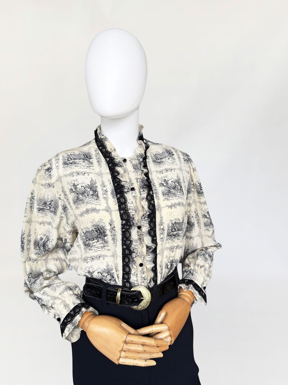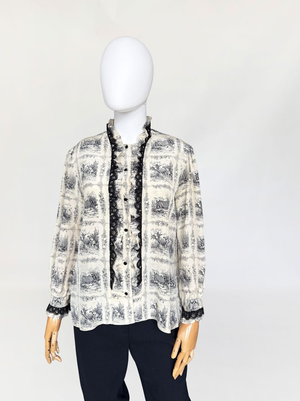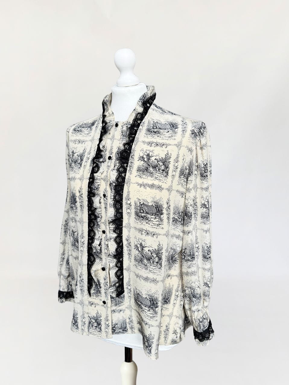 Unikatowa włoska koszula vintage. Wykonana z jedwabnego szyfonu o przepięknym wzornictwie w szkicowane scenki łowieckie/myśliwskie. Swobodny fason z długimi rękawami. Zapinana na drobne guziki. Równolegle do linii zapięcia obustronne drapowane falbanki z jedwabiu i czarnej koronki.