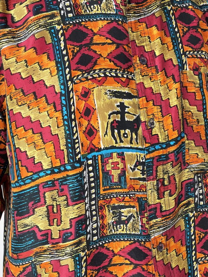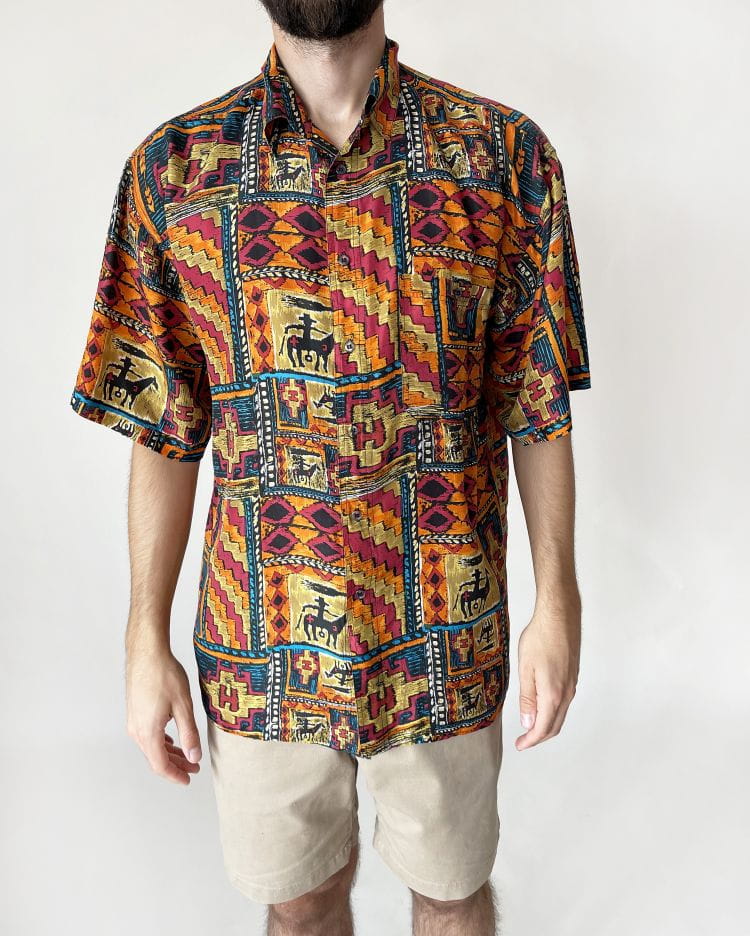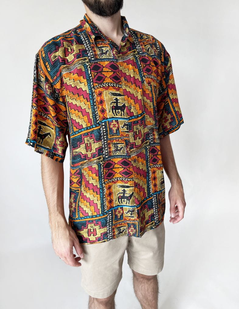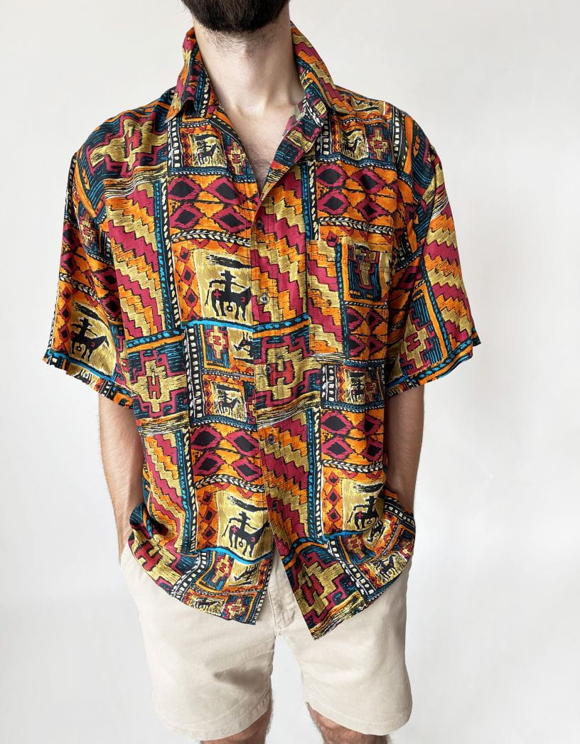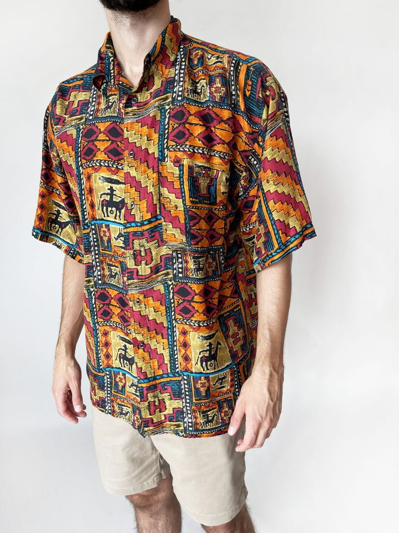 Koszula vintage wykonana z lekkiej jedwabnej tkaniny w multikolorowe etniczne wzory. Prosty fason z krótkimi rękawami. U góry kieszeń.