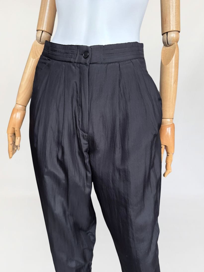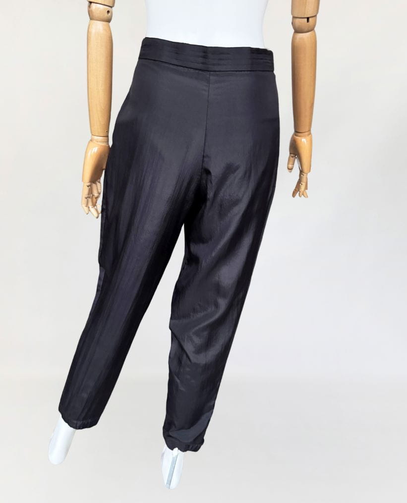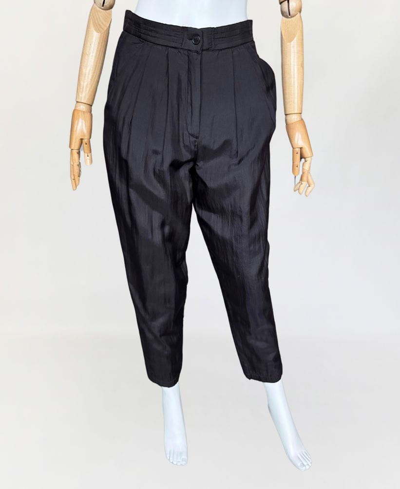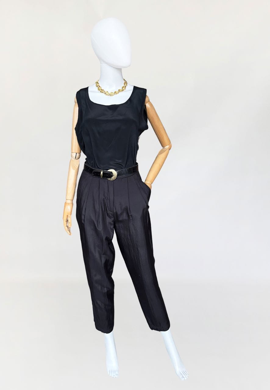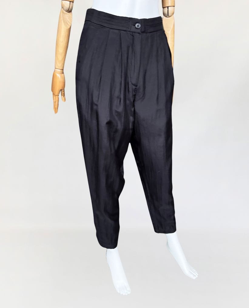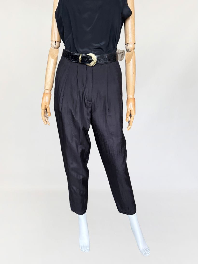 Eleganckie spodnie vintage wykonane z czarnego jedwabnego szyfonu. Od wewnątrz na grubszej podszewce z bawełnianego płótna, dzięki czemu z powodzeniem nadają się na chłodniejszą porę. Długie nogawki szersze w udach, zwężane do dołu.
