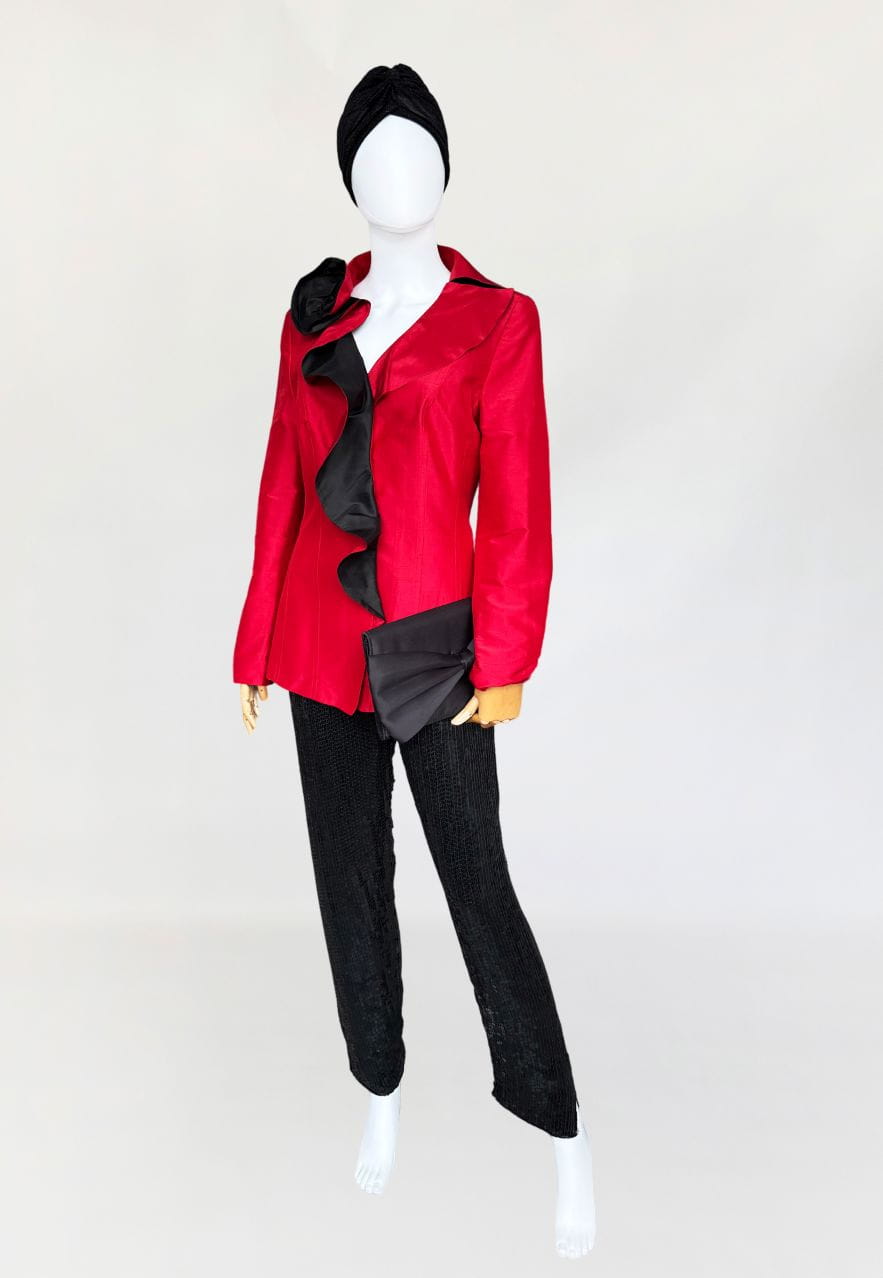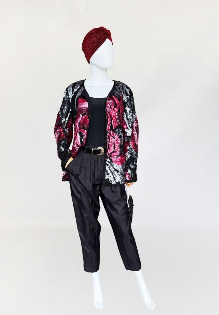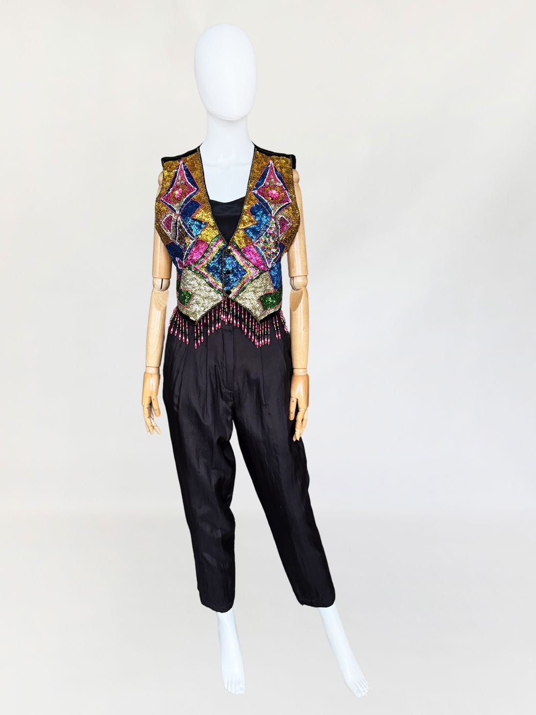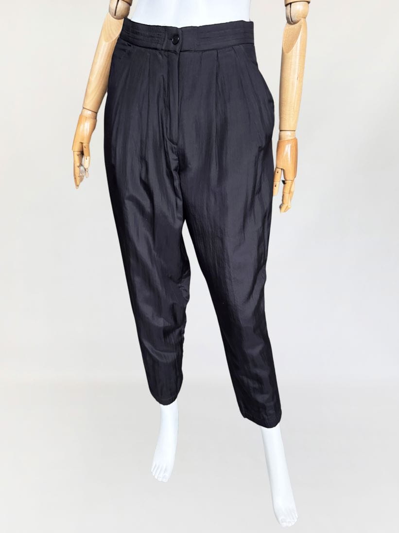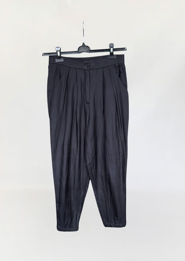 Eleganckie spodnie vintage wykonane z czarnego jedwabnego szyfonu. Od wewnątrz na grubszej podszewce z bawełnianego płótna, dzięki czemu z powodzeniem nadają się na chłodniejszą porę. Długie nogawki szersze w udach, zwężane do dołu.