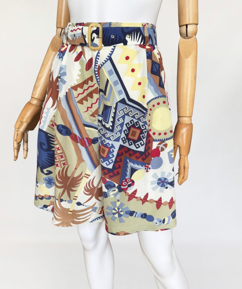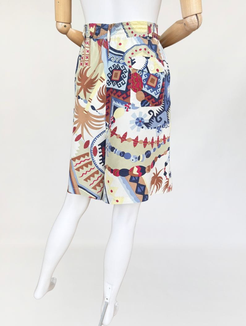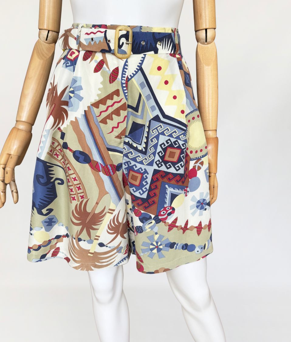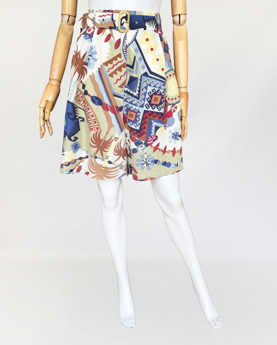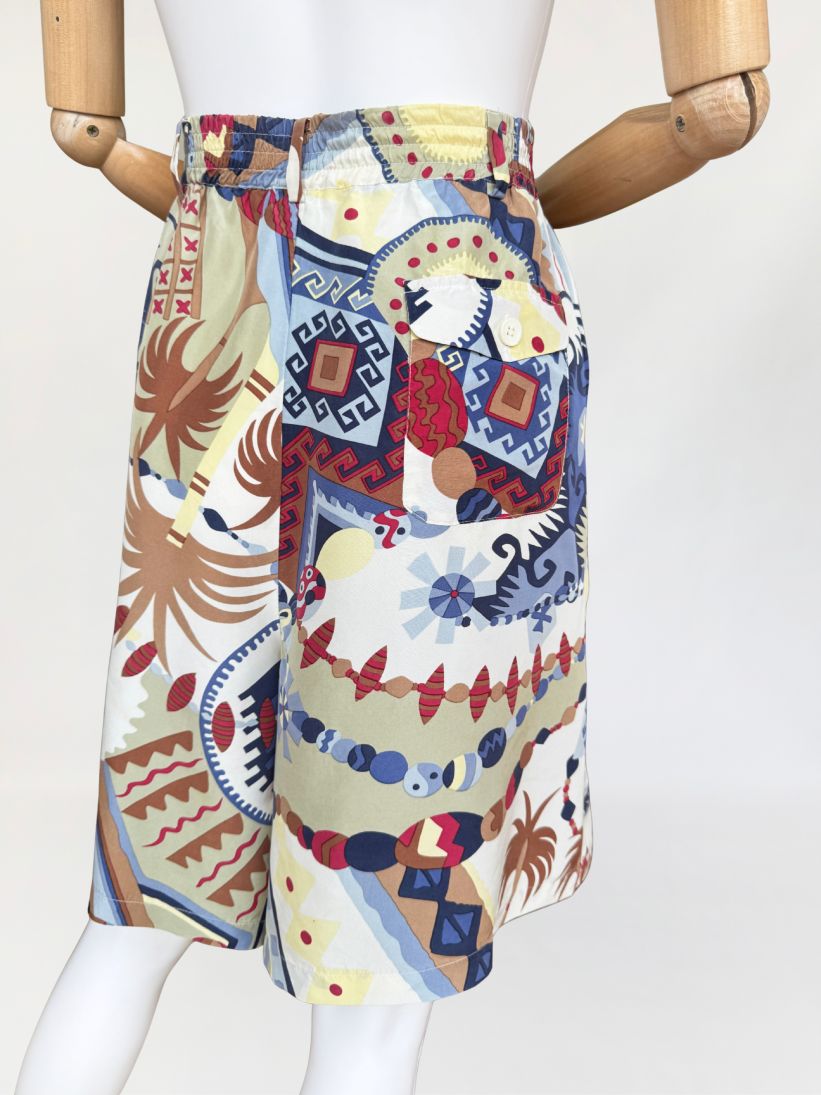 Szorty typu bermudy, true vintage z lat 80-tych marki Bettty Barclay. Wykonane z naturalnego jedwabiu w kolorowe tropikalne graficzne wzory. Model z wysoki stanem i szerokimi nogawkami. W pasie drobne zaszewki i wsuwane kieszenie po bokach. Tył lekko elastyczny za sprawą gumowej wstawki na plecach. W komplecie pasek. W ofercie posiadamy koszulę z tej samej kolekcji.