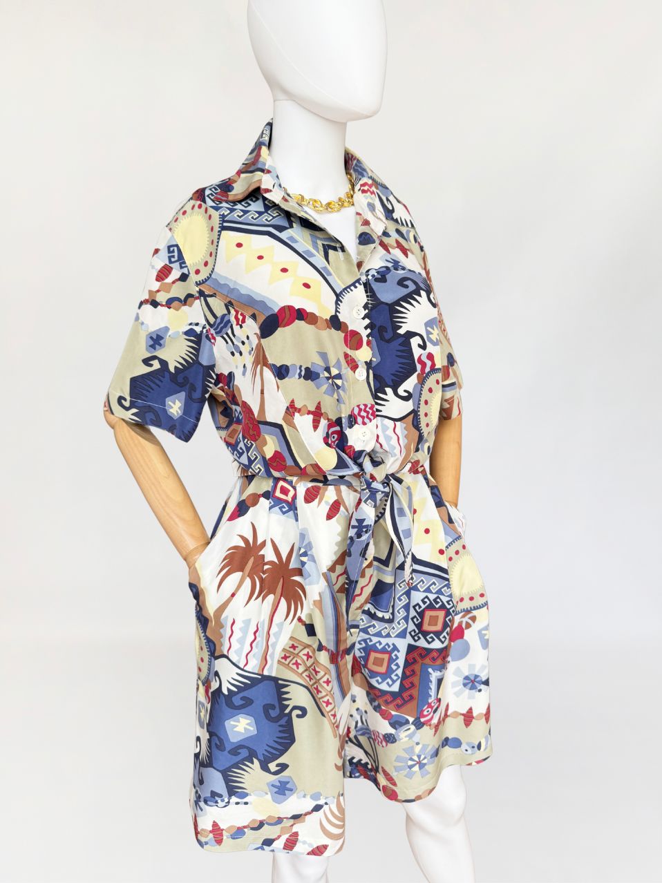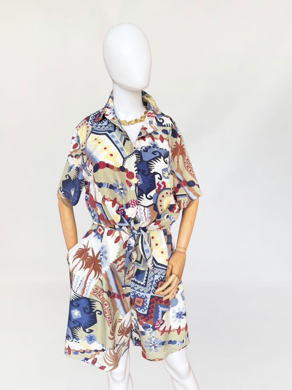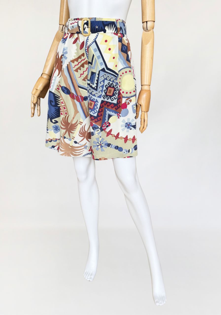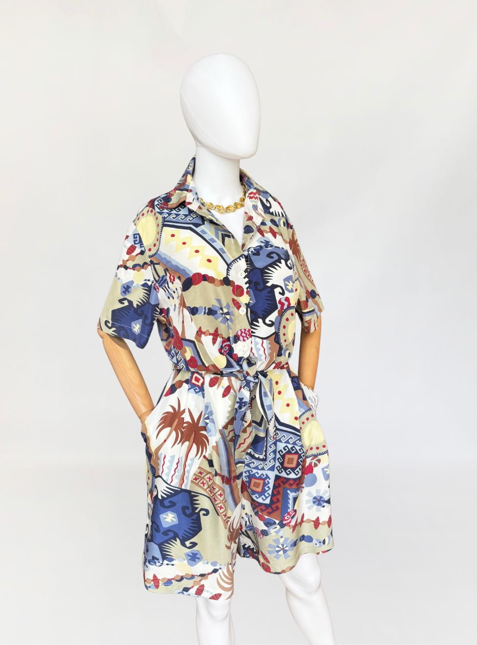 Szorty typu bermudy, true vintage z lat 80-tych marki Bettty Barclay. Wykonane z naturalnego jedwabiu w kolorowe tropikalne graficzne wzory. Model z wysoki stanem i szerokimi nogawkami. W pasie drobne zaszewki i wsuwane kieszenie po bokach. Tył lekko elastyczny za sprawą gumowej wstawki na plecach. W komplecie pasek. W ofercie posiadamy koszulę z tej samej kolekcji.