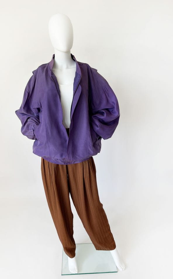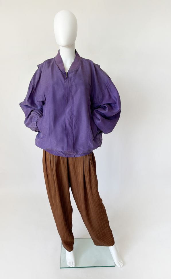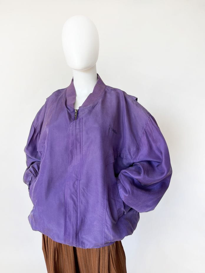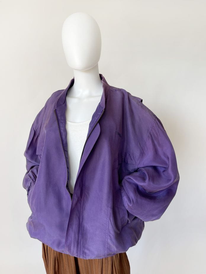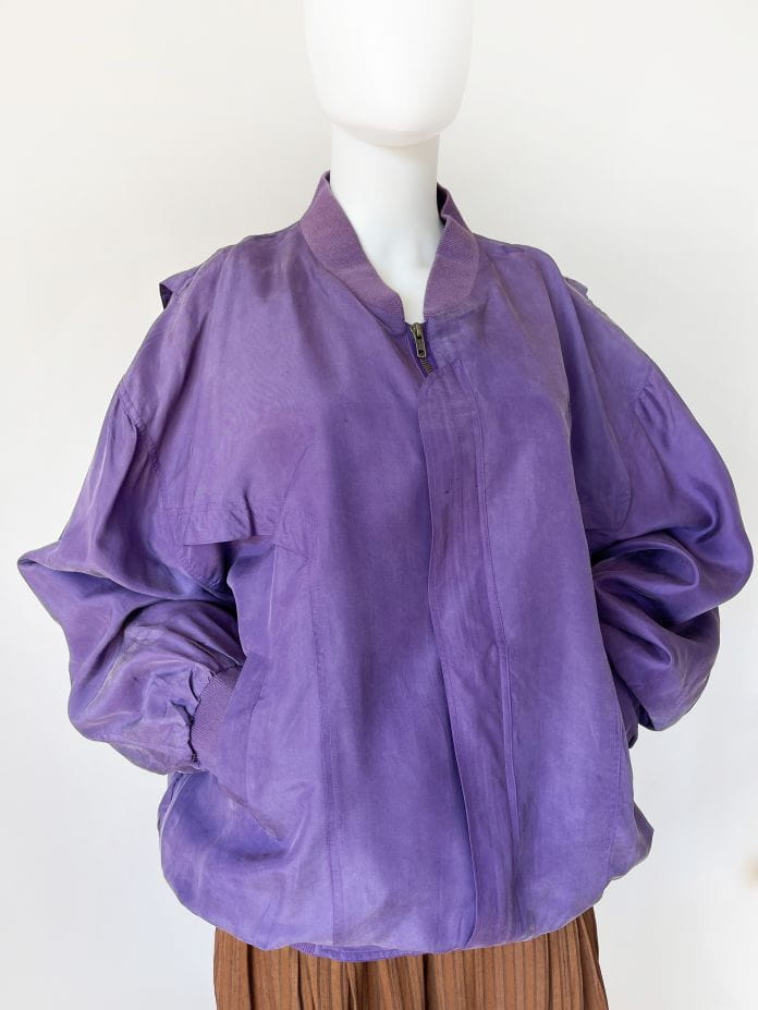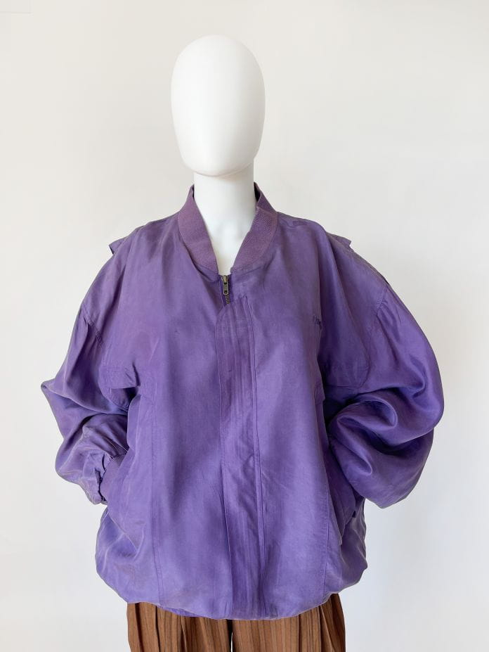Unisex. Bomber vintage uszyty z naturalnego jedwabiu w kolorze lodów jagodowych. Luźny oversizowy fason z obniżoną linią pach. Ramiona z wypełnieniem od wewnątrz. Po bokach wsuwane kieszenie. Zasuwany na zamek, przepinany materiałową listwą. Mankiety, stójka, oraz dół kurtki na elastycznych ściągaczach.