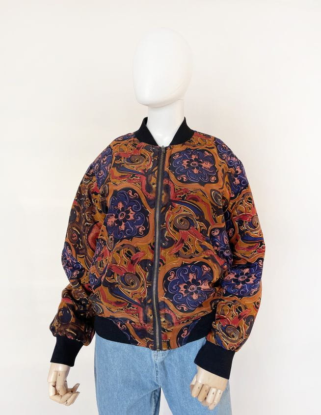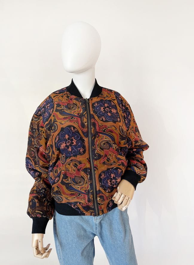 Lekka kurtka vintage typu bomber. Wykonana z miękkiej jedwabnej tkaniny w malowane barwne wzory. Rozsuwany model z luźniejszą górą, u dołu ściągacz. Po bokach suwane kieszenie. Piękna ciemniejsza kolorystyka, ciekawe wzornictwo i wysokiej jakości naturalny jedwab, wszystko to sprawia że kurtka jest wyjątkowa i nie sposób przejść obok niej obojętnie!