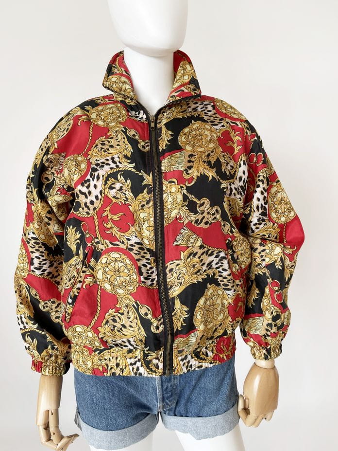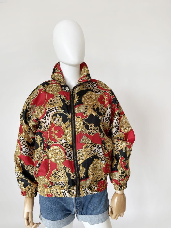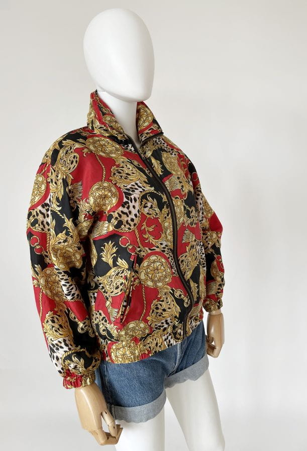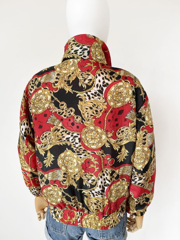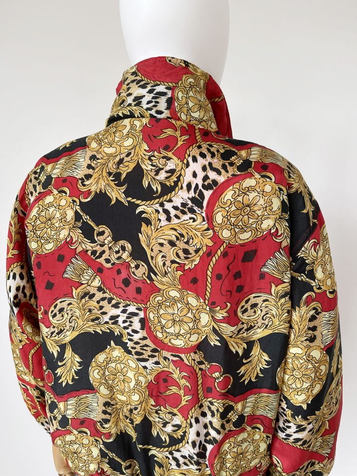 Lekki bomber vintage wykonany z jedwabnej tkaniny o deseniu typu full print. Kolorowe bogate wzornictwo w stylu dawnych kolekcji Versace. Rozsuwany, luźny model ze stójką.