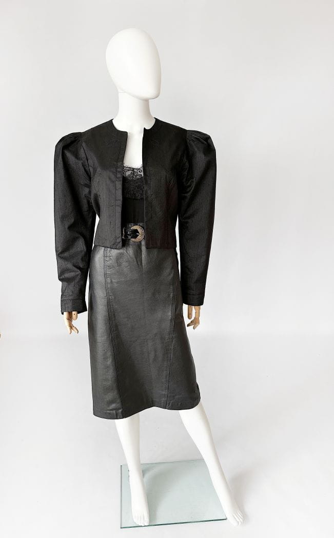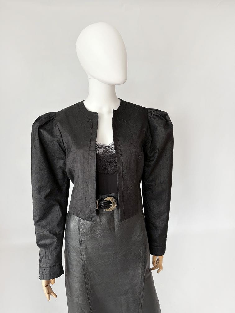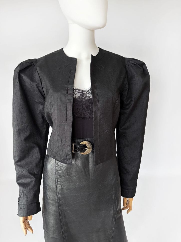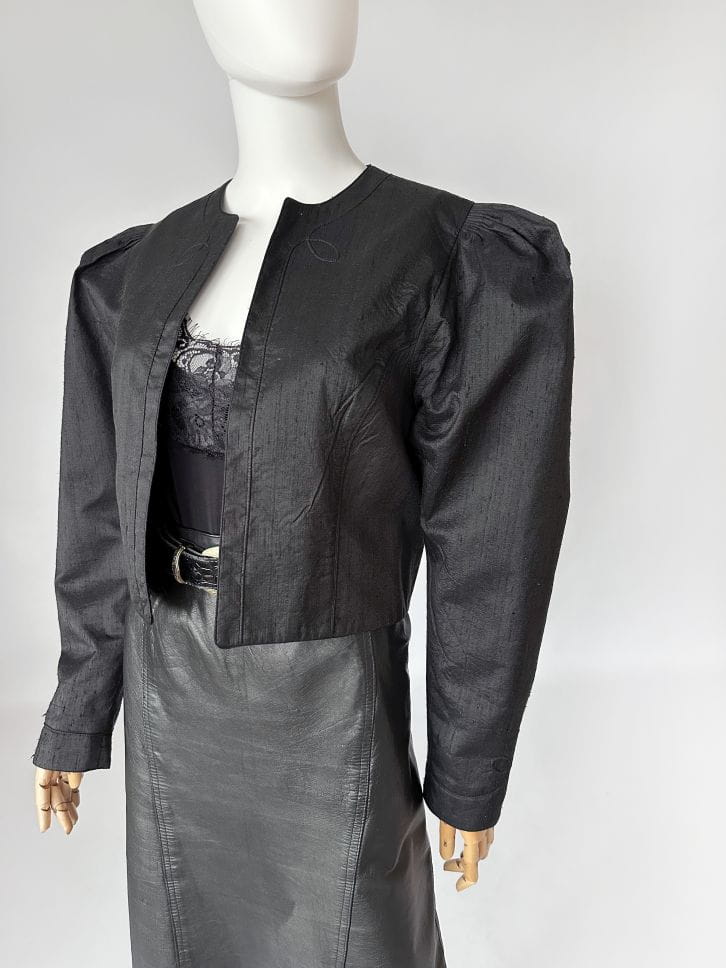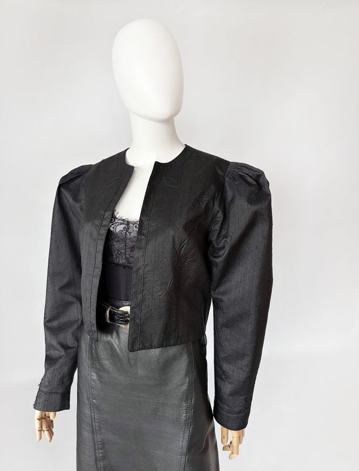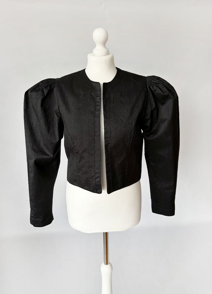 Austriacki żakiet vintage o krótkim fasonie open front. Wykonany z jedwabnego szantungu w klasycznej czerni. Długie rękawy, bufiaste i mocno drapowane w ramionach. Na mankietach, oraz przy dekolcie dyskretne dekoracyjne obszycia.