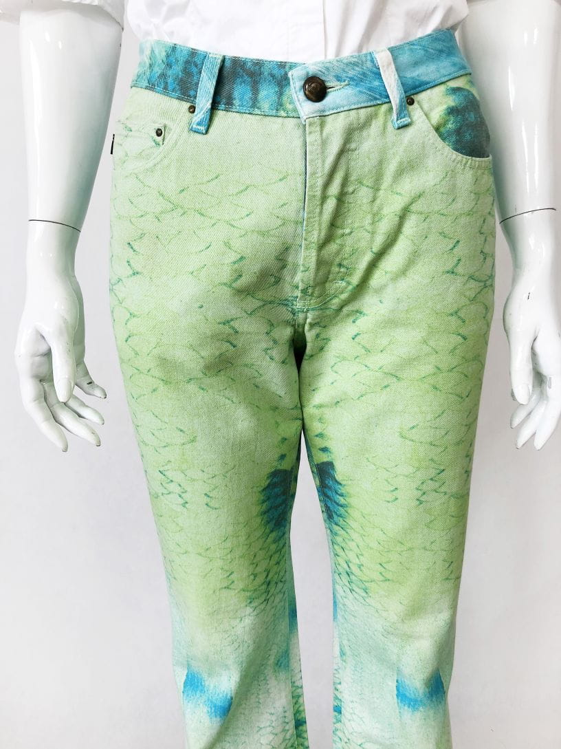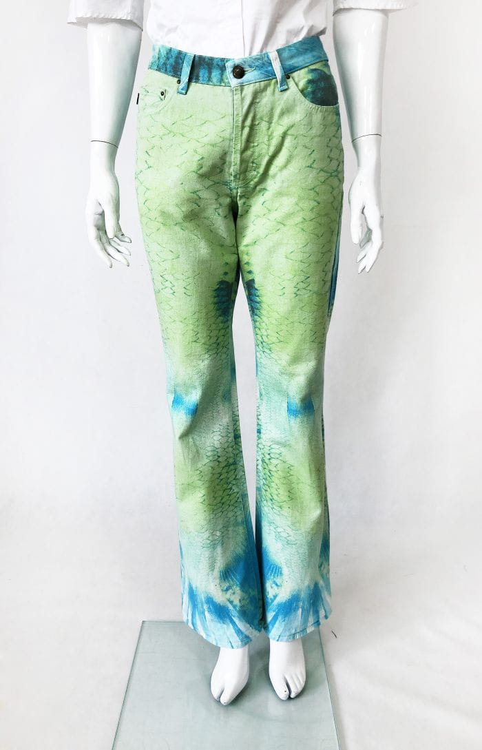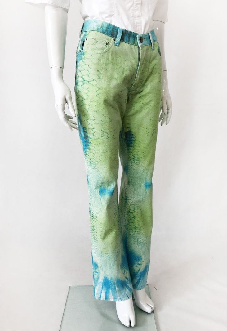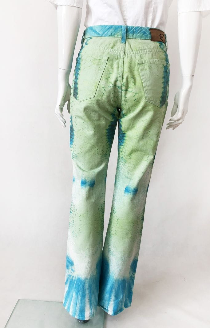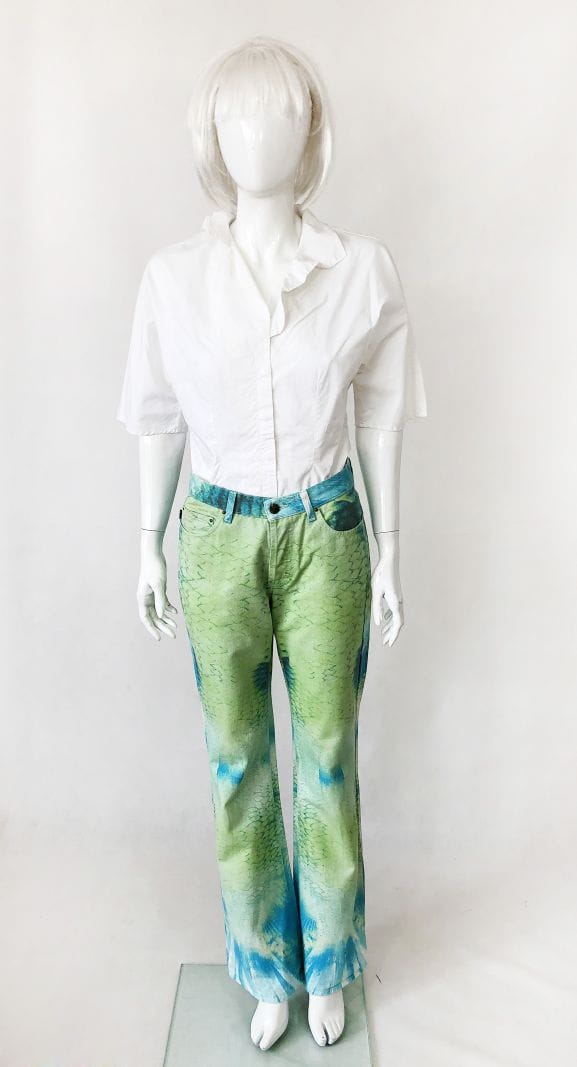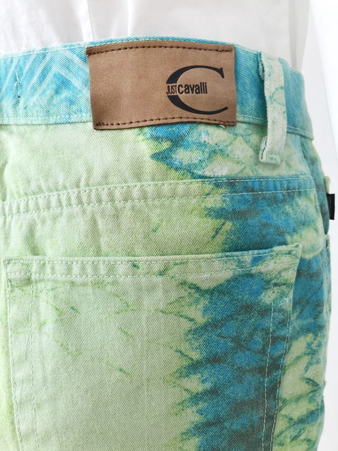 Jeansowe spodnie Just Cavalli o deseniu we wzory w odcieniach zieleni i niebieskim. Nogawki lekko poszerzane ku dołowi. Standardowy rozkład kieszeni.