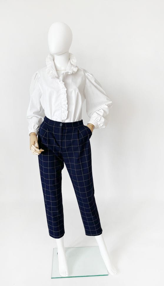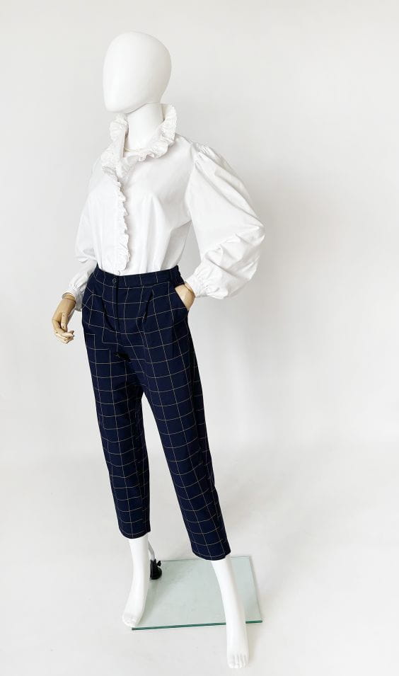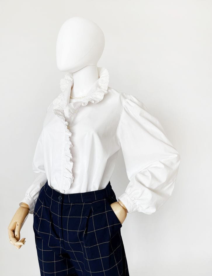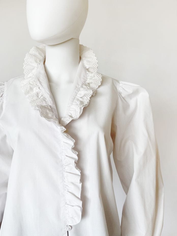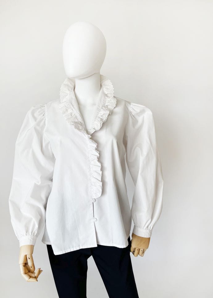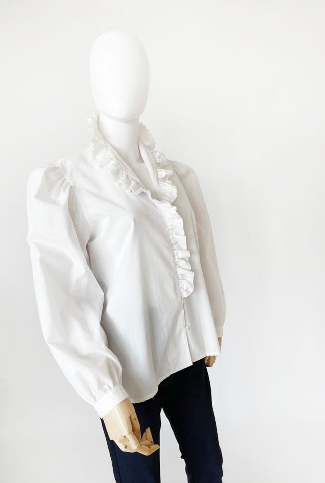 Przepiękna, romantyczna koszula vintage dirndl z lat 80-tych. Prosty fason z długimi, bufiastymi w ramionach rękawami. Zapinana na guziki, ukryte częściowo pod tkaniną. Od mniej więcej połowy zapięcia drapowana listwa przechodząca w koronkowy falowany kołnierzyk.