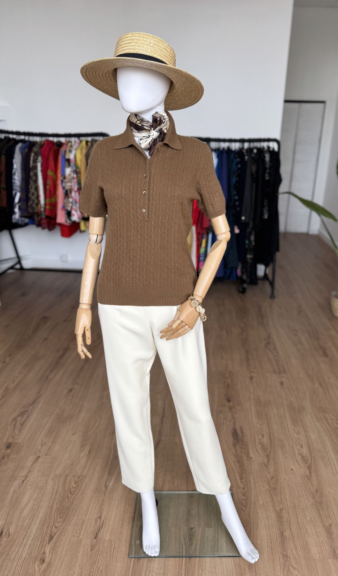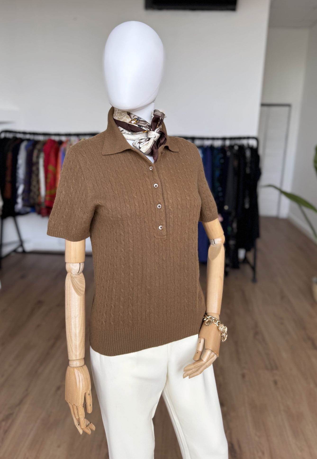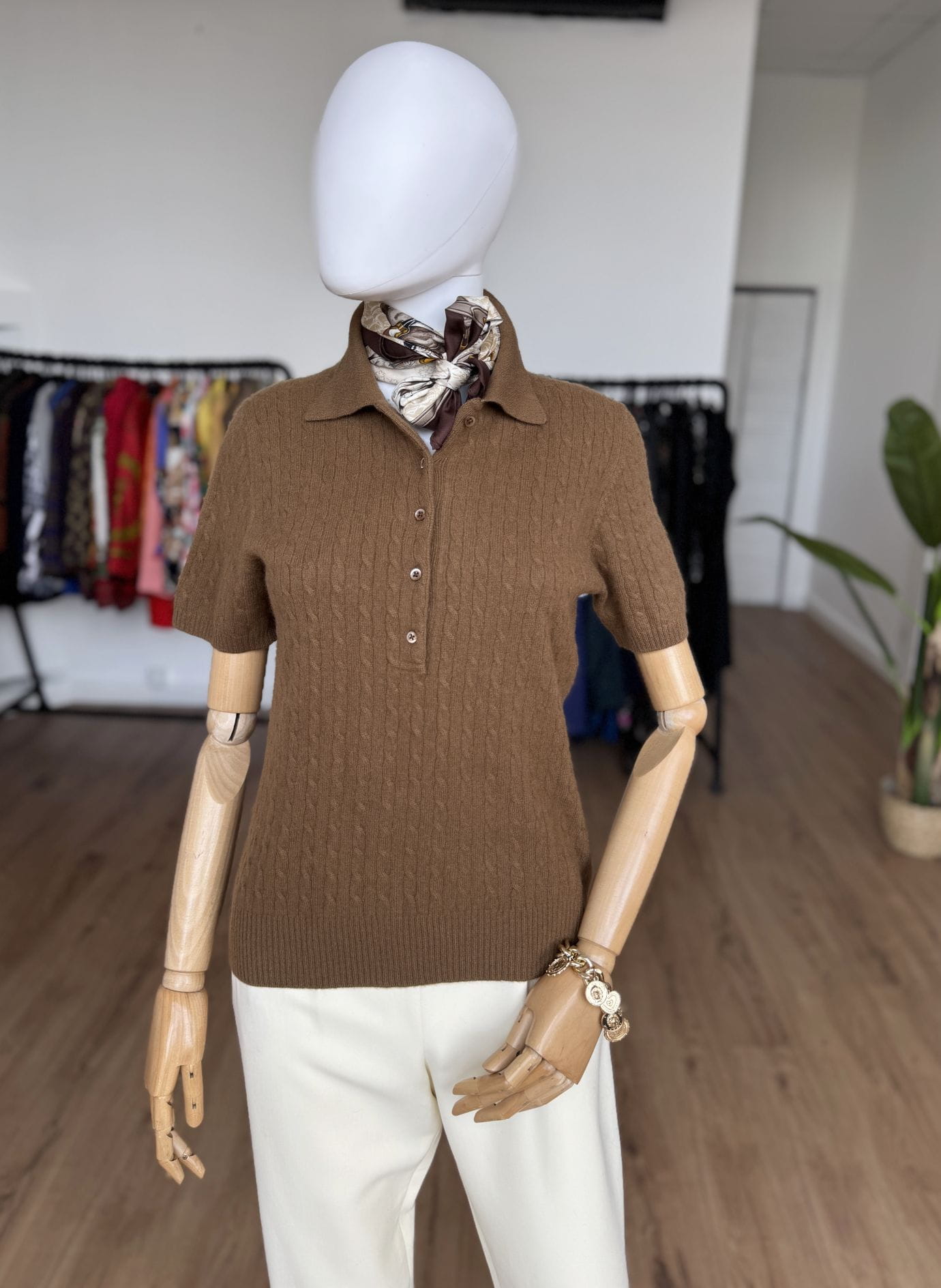 Sweter w stylu old money wykonany w całości z wysokogatunkowego, czystego kaszmiru w odcieniu jasnego brązu. Dopasowany model typu polo z krótkim rękawem i klasycznym kołnierzykiem. Dzianina o dekoracyjnym warkoczowym splocie, miękka, elastyczna i zadbana – bez widocznych oznak zużycia.