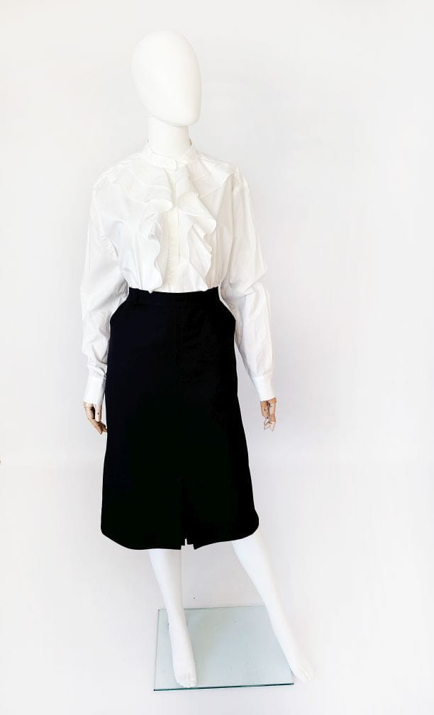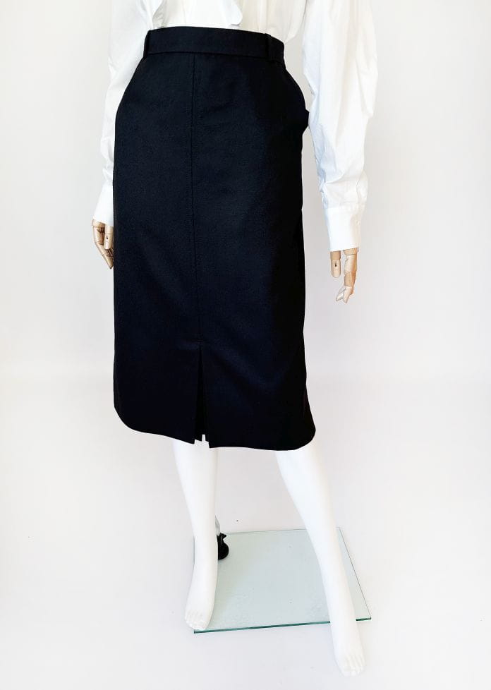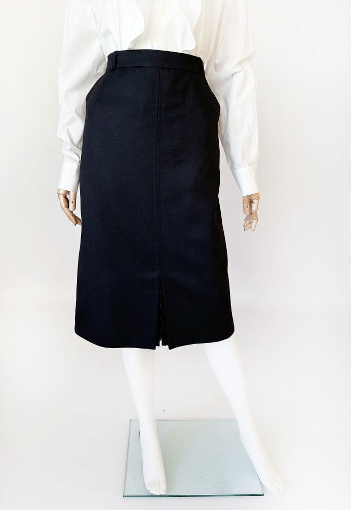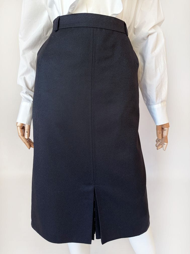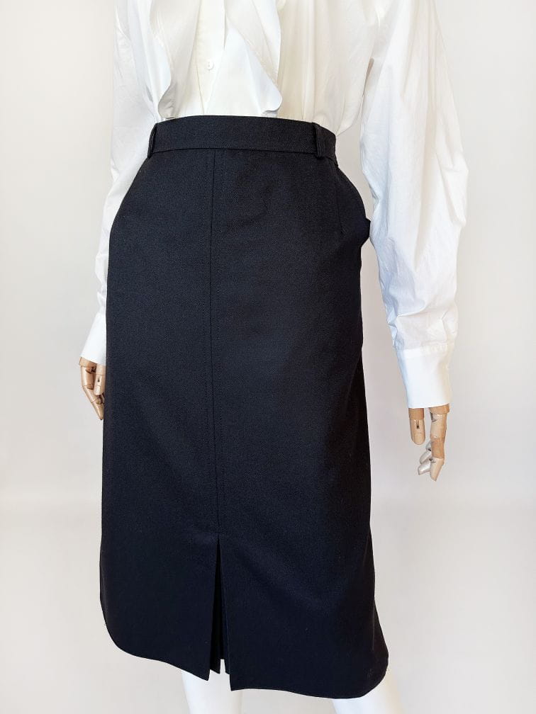 Klasyczna spódnica vintage o ołówkowym fasonie i długości midi. Wykonana z wełnianej tkaniny z certyfikatem. Z przodu u dołu kontrafałda z ukrytymi guzikami. Model z podszewką.