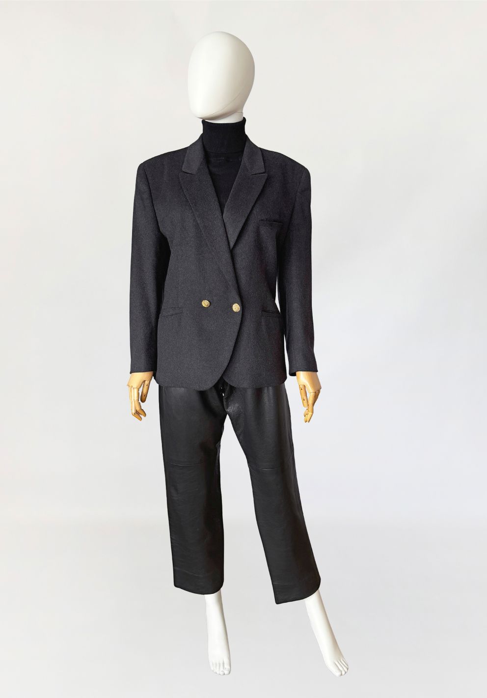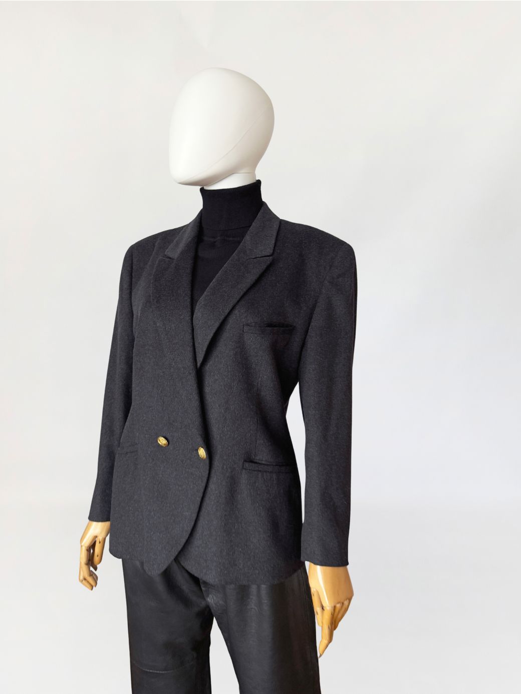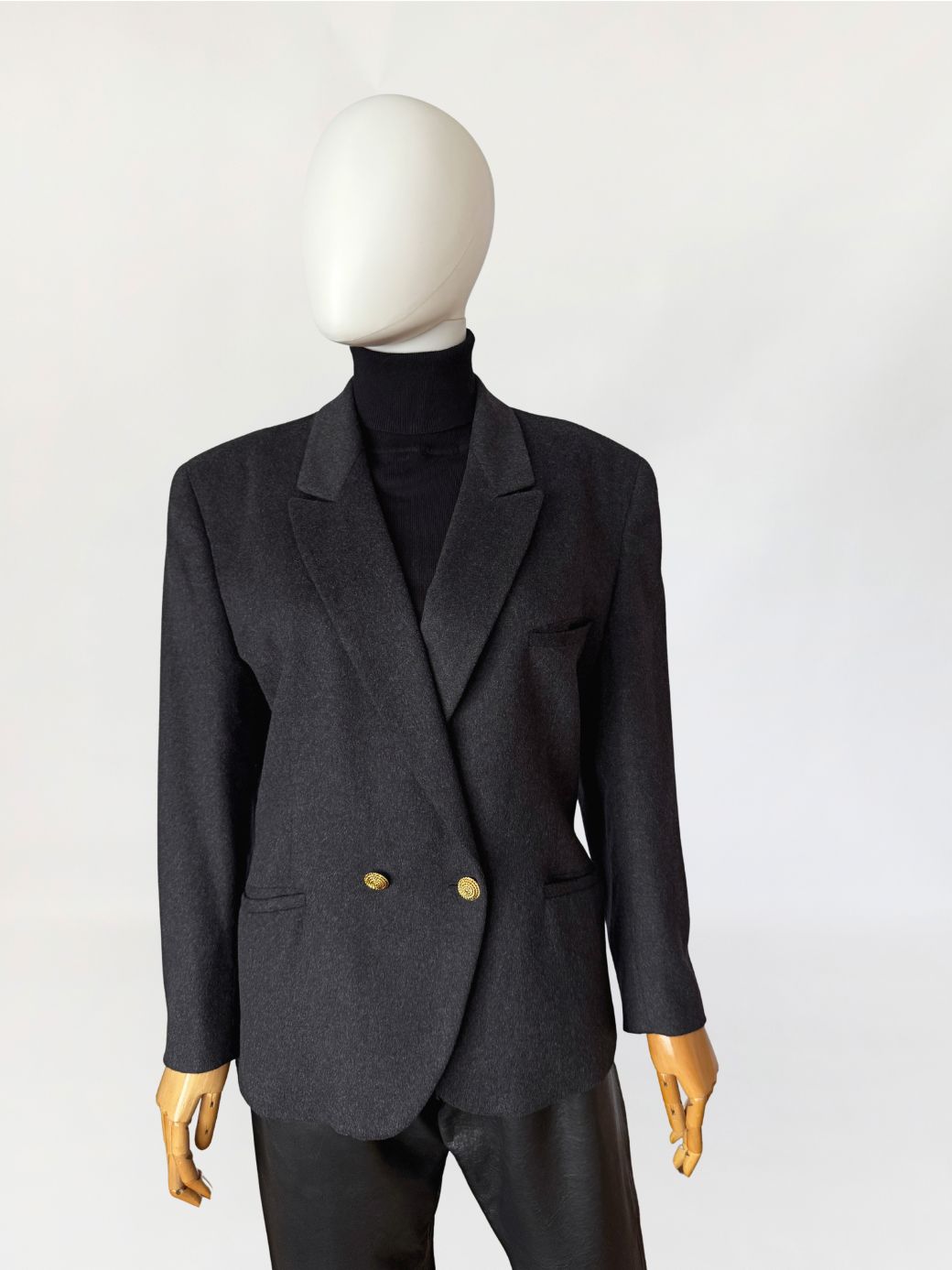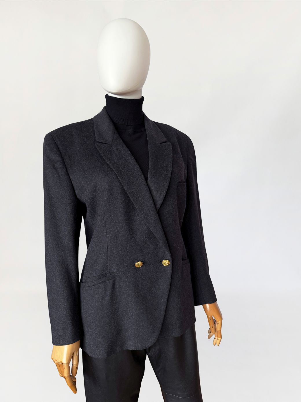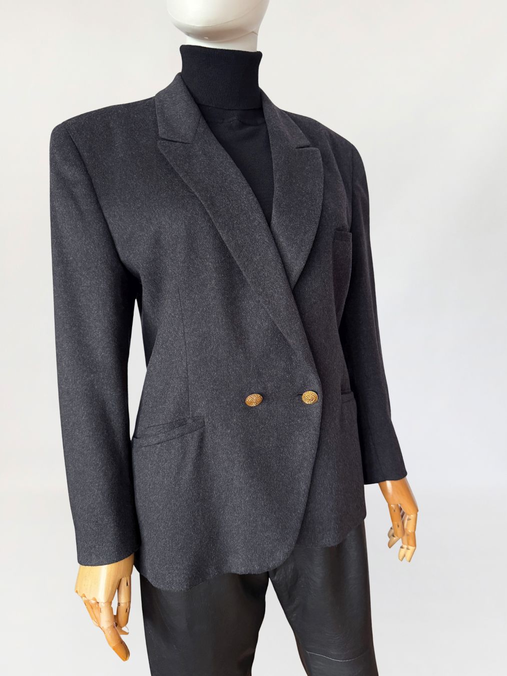 Włoska marynarka vintage wykonana z doskonałej gatunkowo, miękkiej wełniano-kaszmirowej tkaniny w grafitowym kolorze. Klasyczny, dwurzędowy model zapinany na złote guziki. Lekko taliowany, dłuższy fason z klasycznie wszytymi rękawami. Ramiona lekko usztywnione. Z przodu dwie kieszenie z patkami.