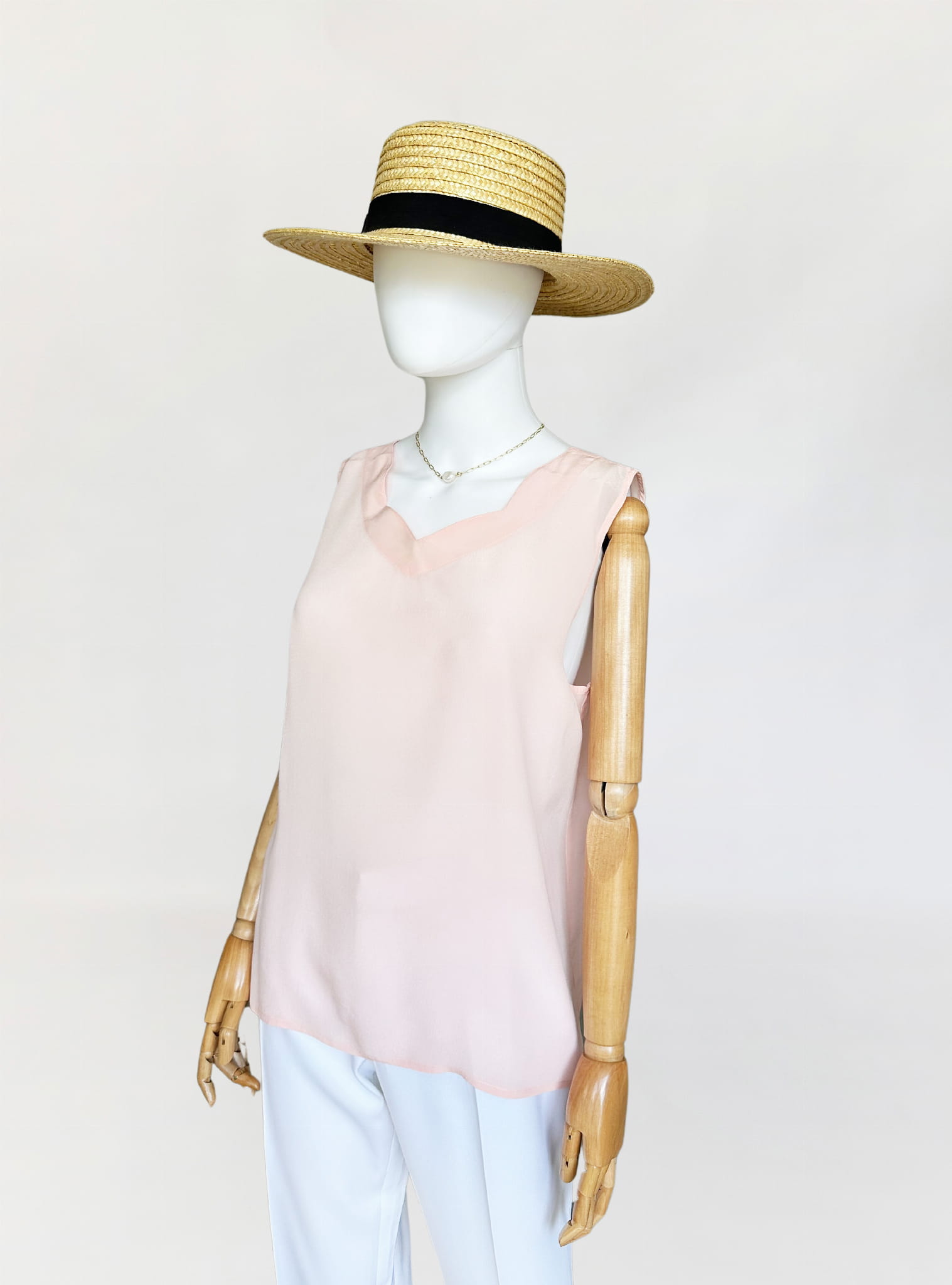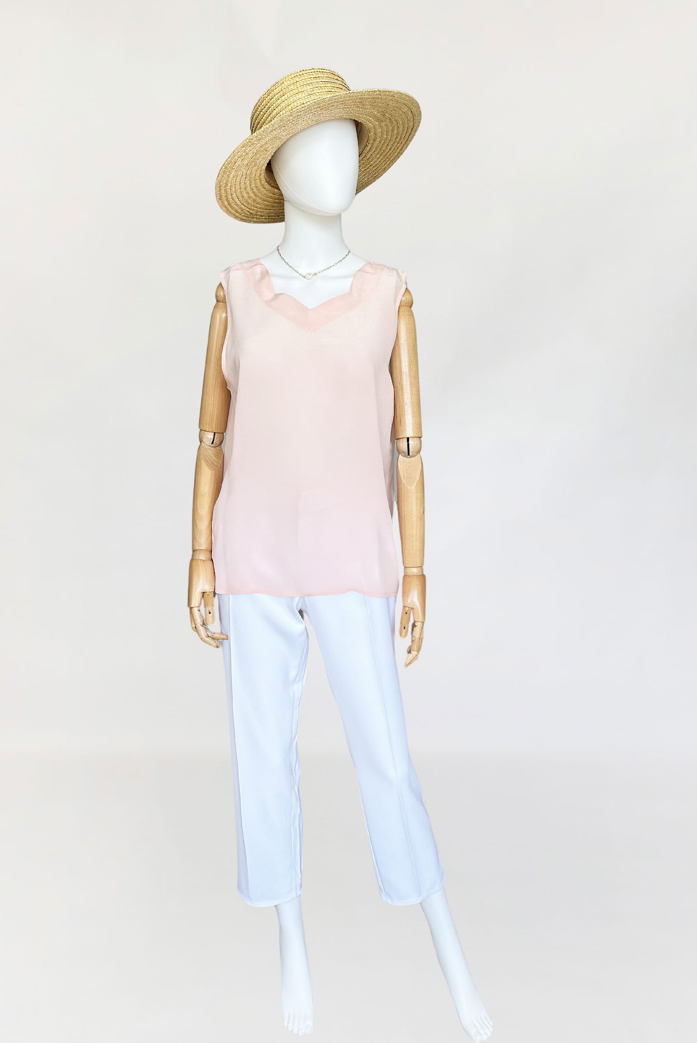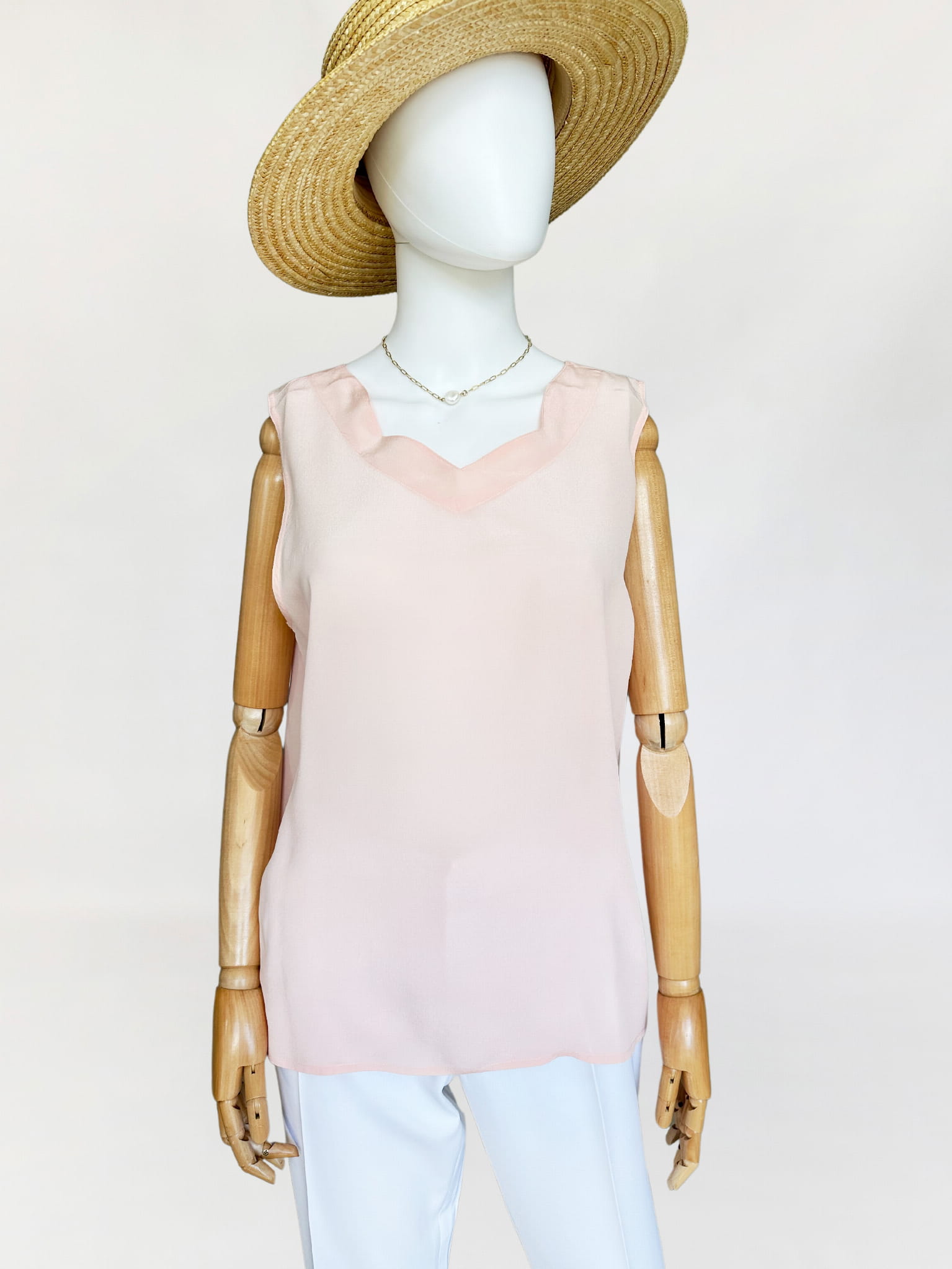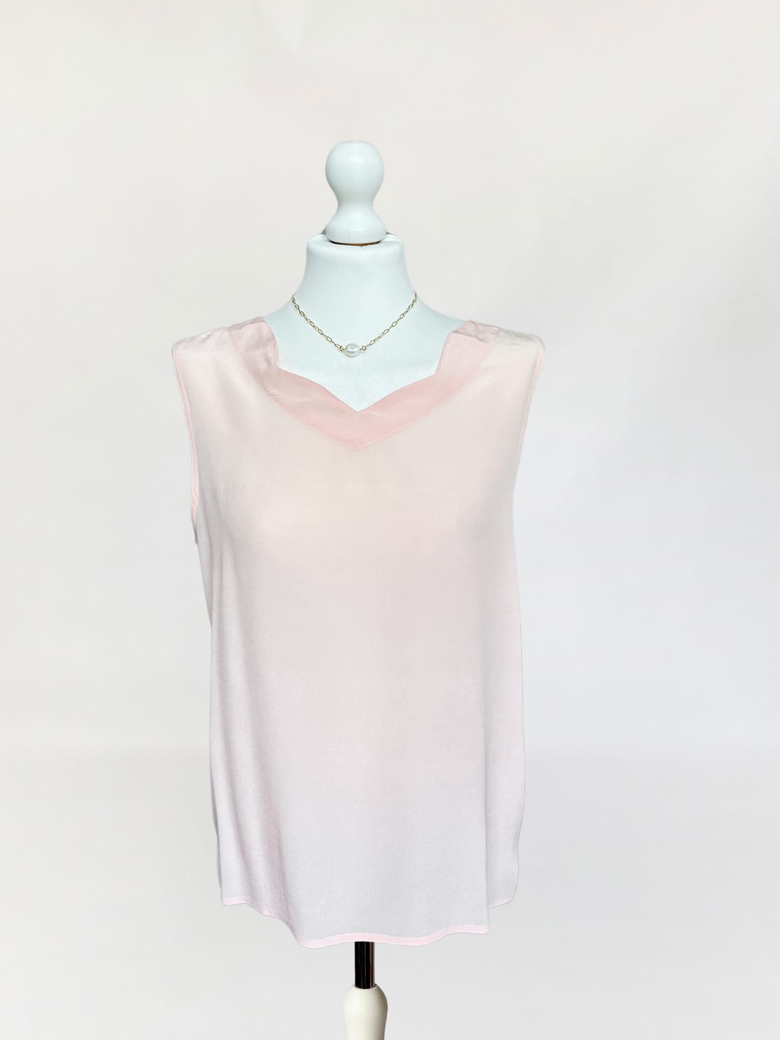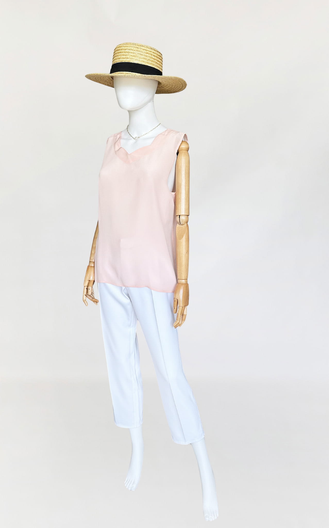 Minimalistyczny włoski top wykonany z jedwabnej tkaniny w kolorze pudrowego różu. Klasyczny fason bez rękawów.