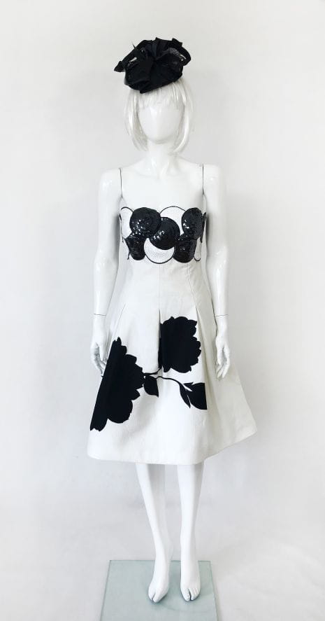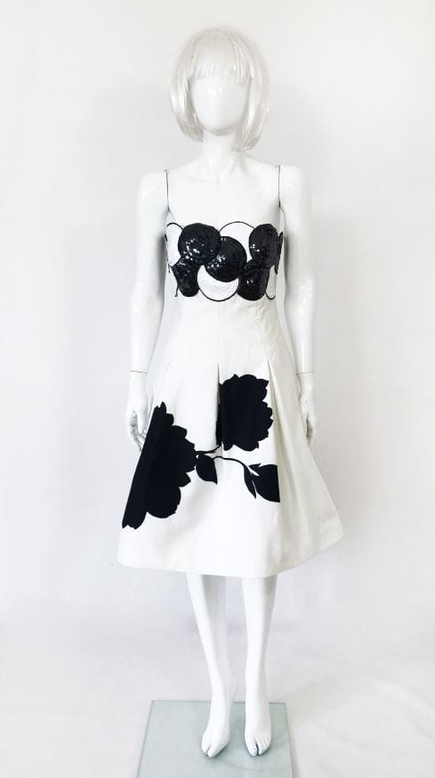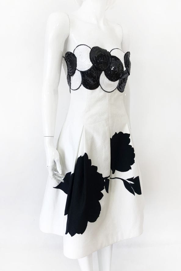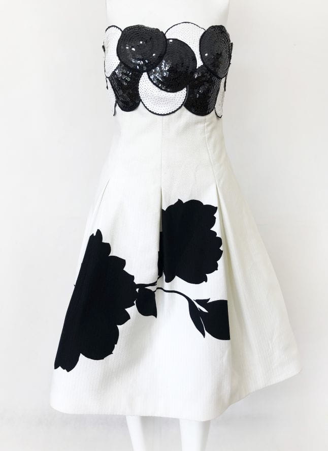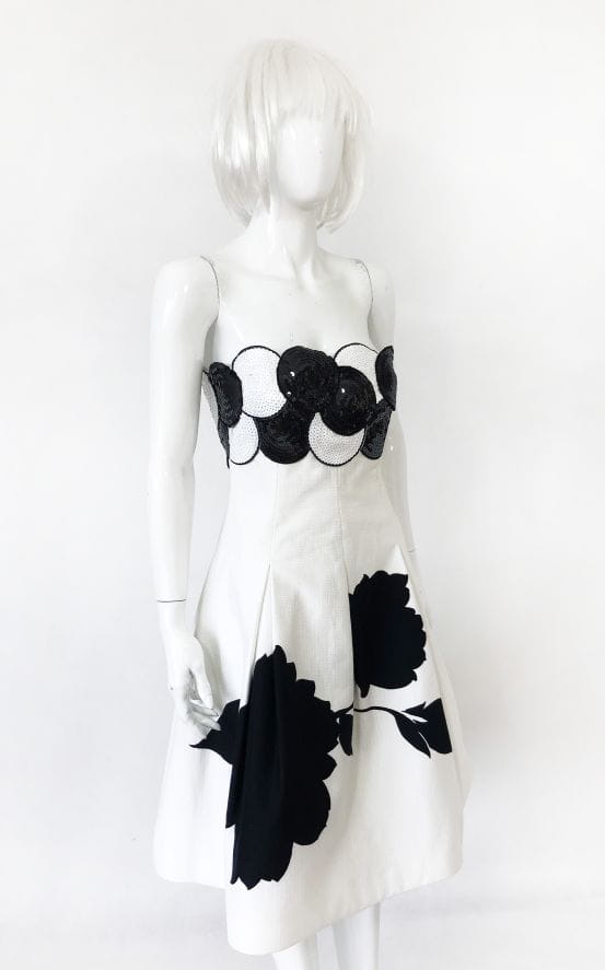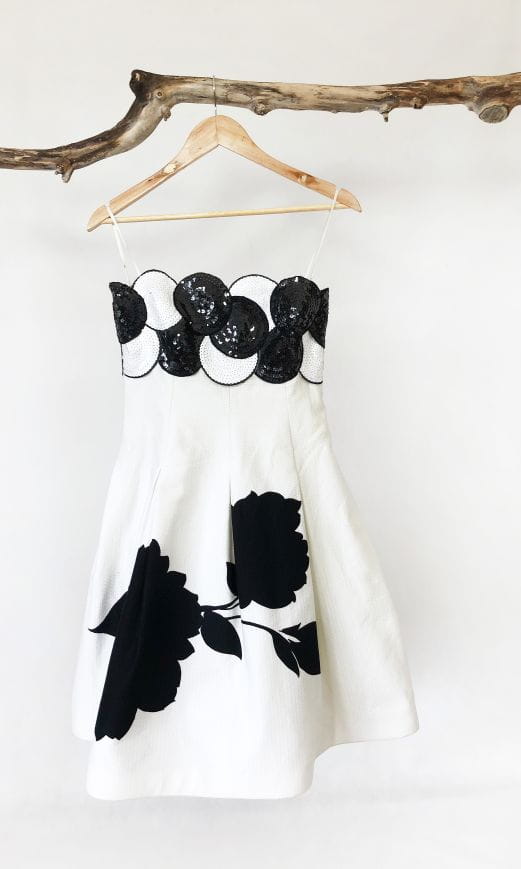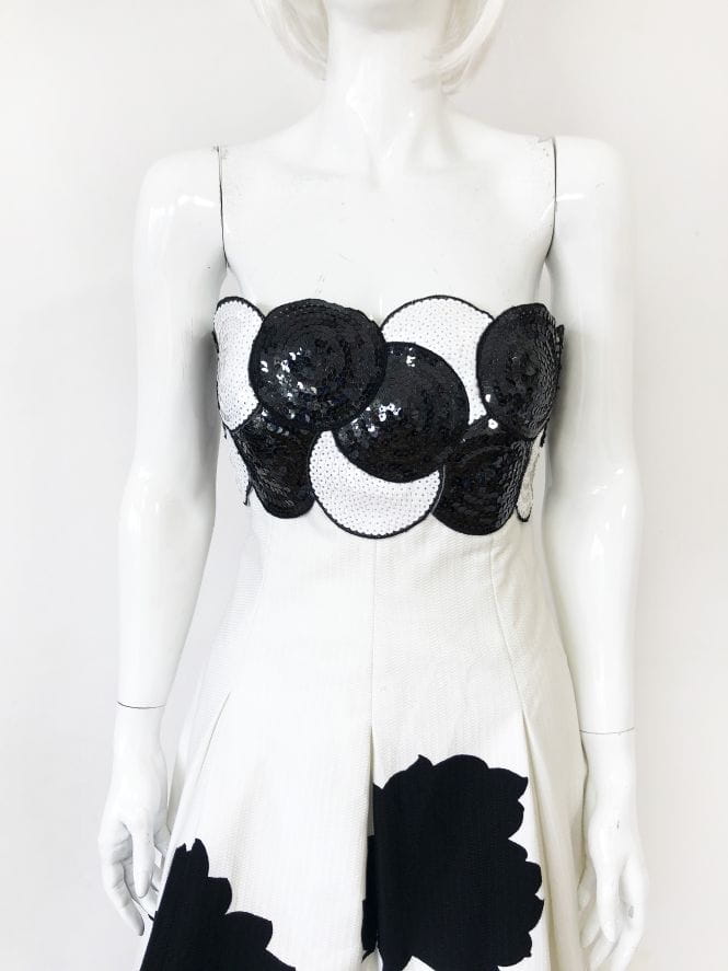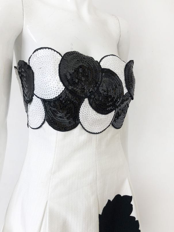 Elegancka, wyjściowa sukienka vintage z lat 70-tych wykonana z lekko teksturowanej bawełny w kontrastowe czarne wzory. Gorsetowa góra usztywniana fiszbinami od wewnątrz, od zewnątrz zdobiona gęstym cekinowym wzorem. Rozkloszowany fason, dół pięknie się unosi za sprawą podszewki z usztywnianym tiulowym dołem.